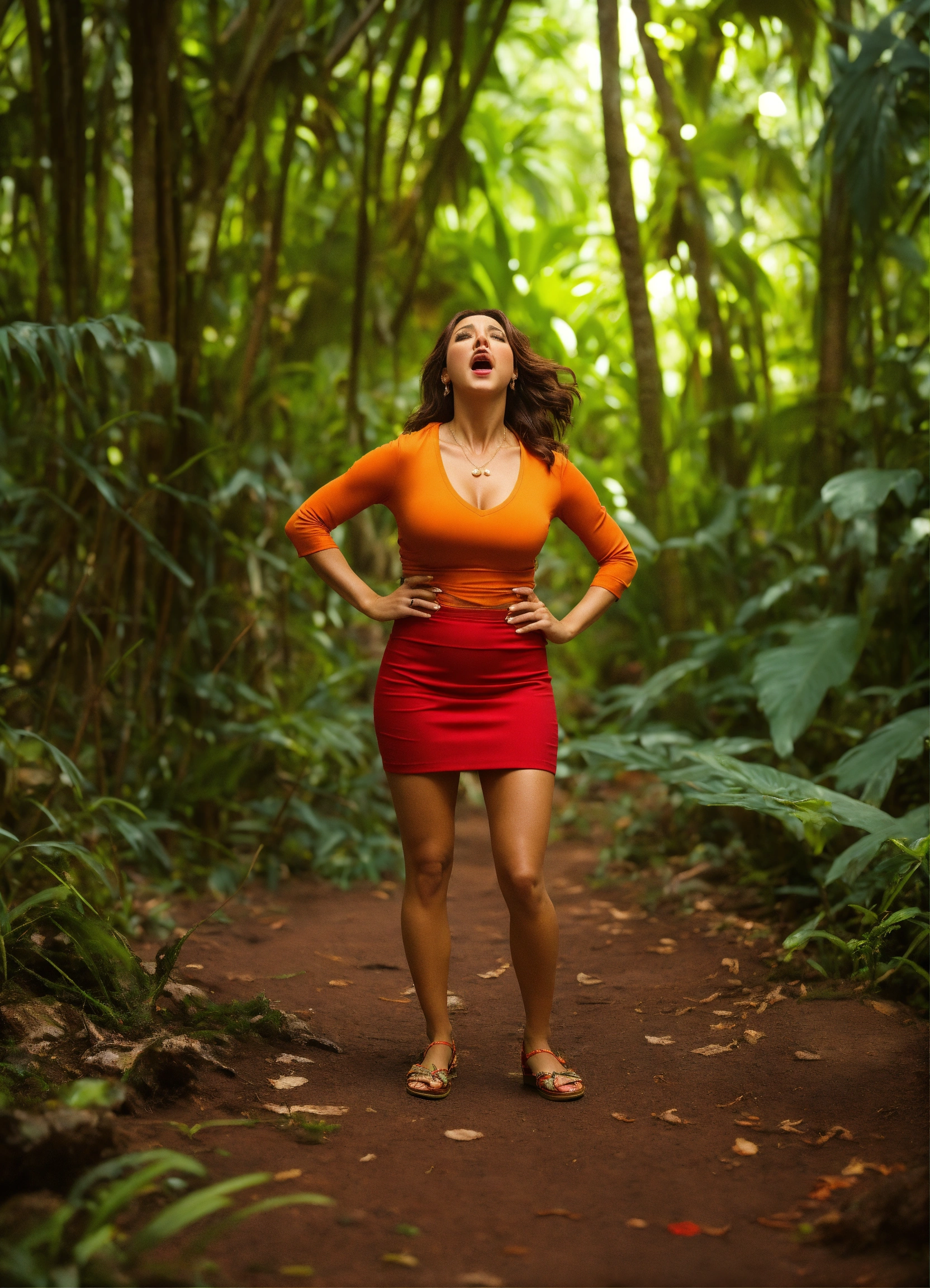 Full body 8k wide angle top down image of scared and shocked in pain lacey chabert wearing a tight mid sleeved orange low cut v-neck top, a red mini skirt, rolled sleeves, wedges, laying with her legs together and arms wide open on the tropical forest floor, arms on arm rests, top view picture, arms out wide, bright green iris color, mouth wide open in pain, stomach showing