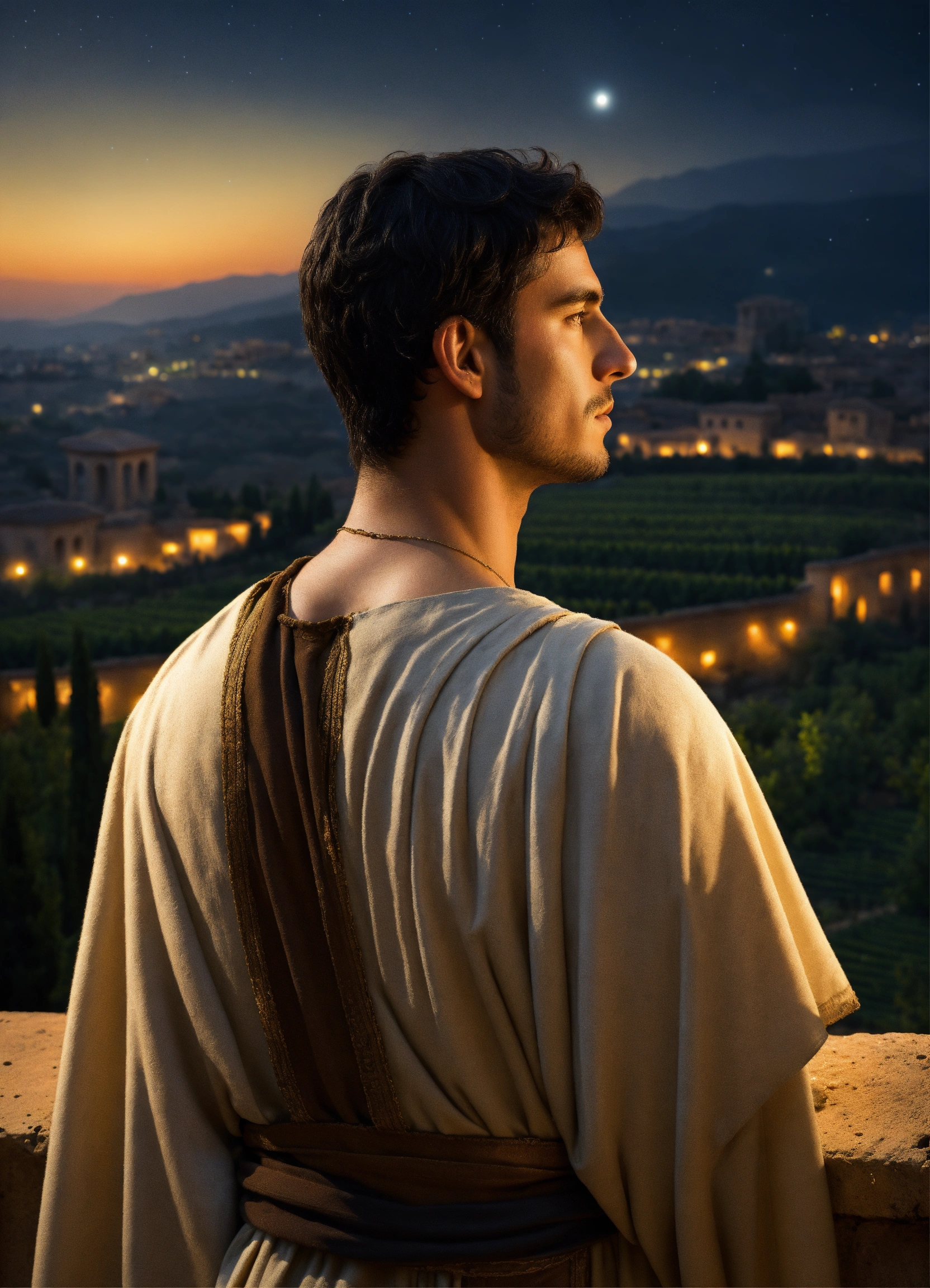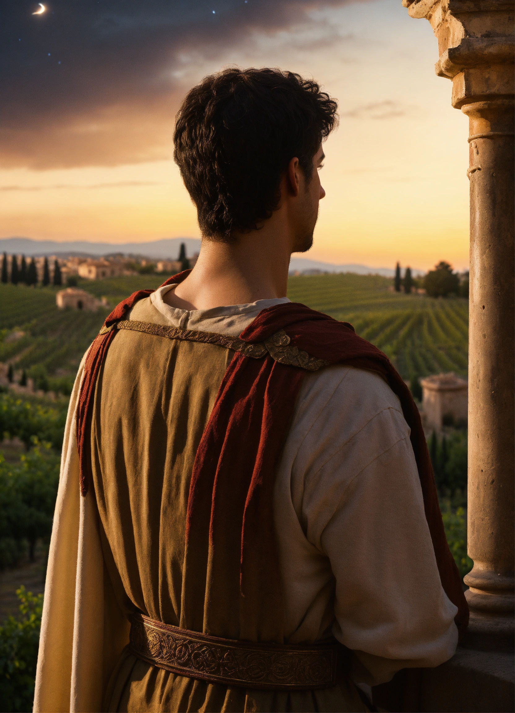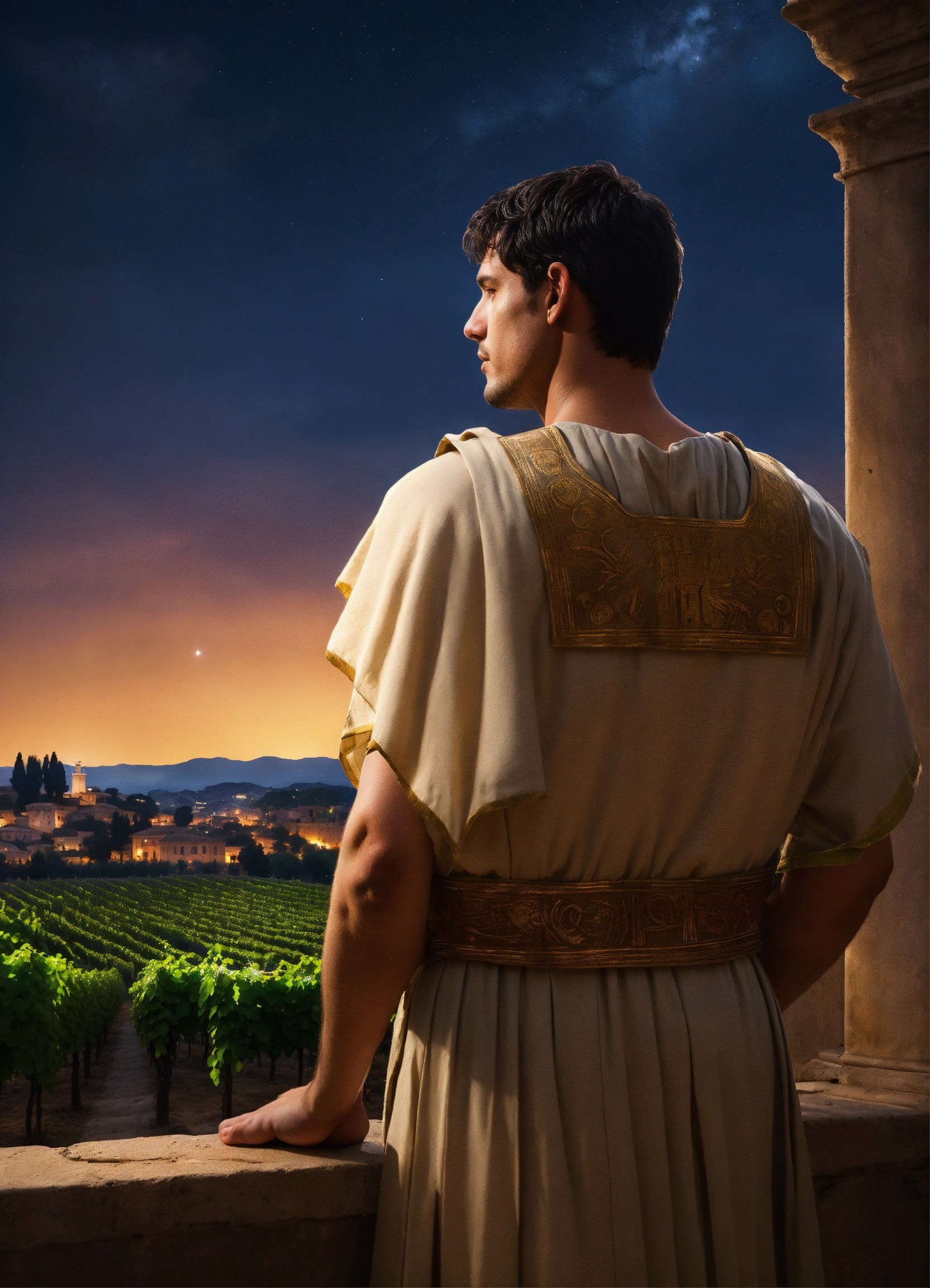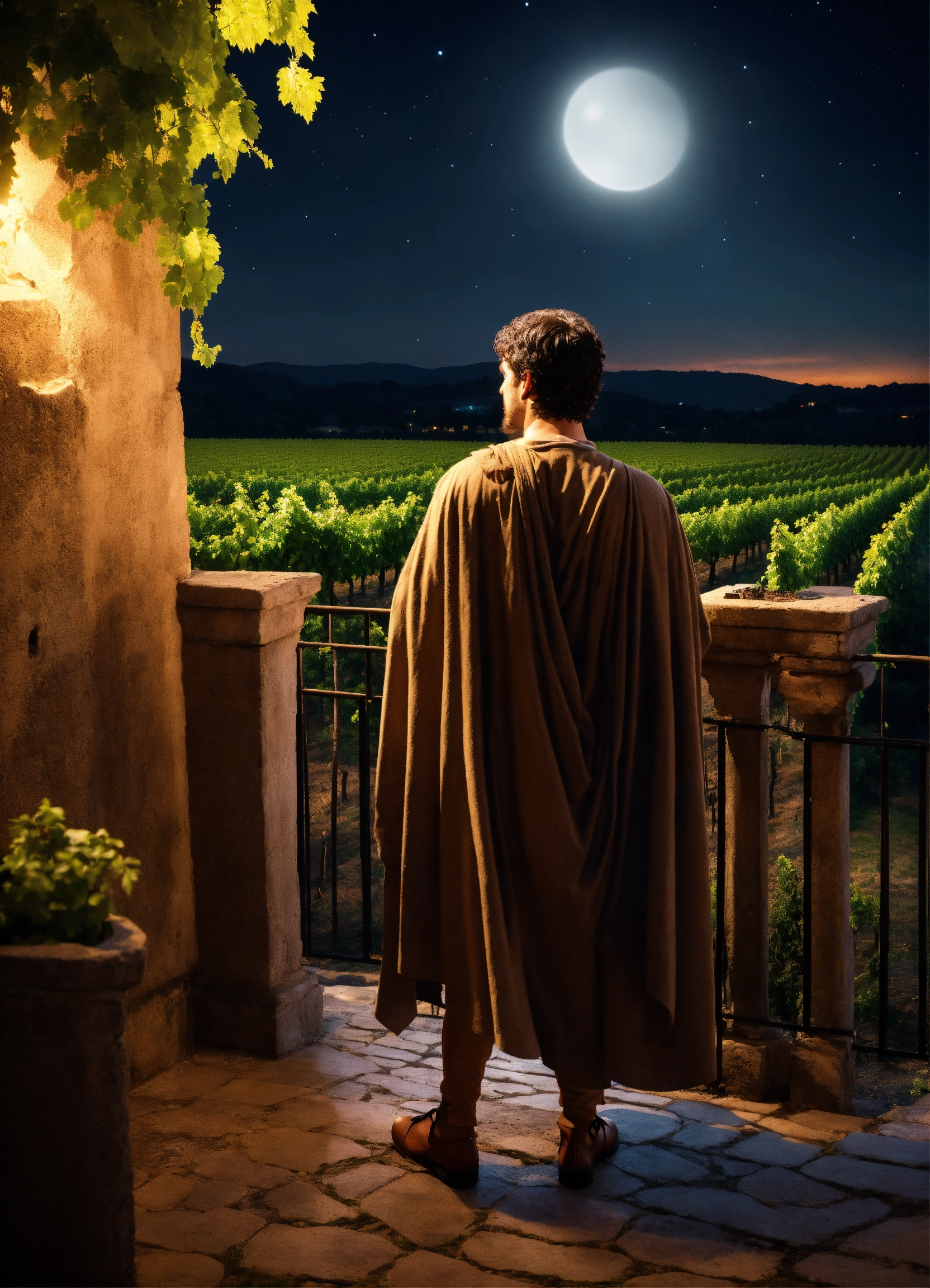 At night, a back view portrait of a young, tall, noble, thin, slender, handsome, short hair, dark-haired roman tribune wearing simple historical roman clothes, light-colored light tunic, solemn, 50 years old, historically accurate, ancient rome, he is looking to the landscape of vineyards from the balcony of his rich and colored roman villa, vineyard, photo realistic, hyper detailed, it is night with a dark sky and stars