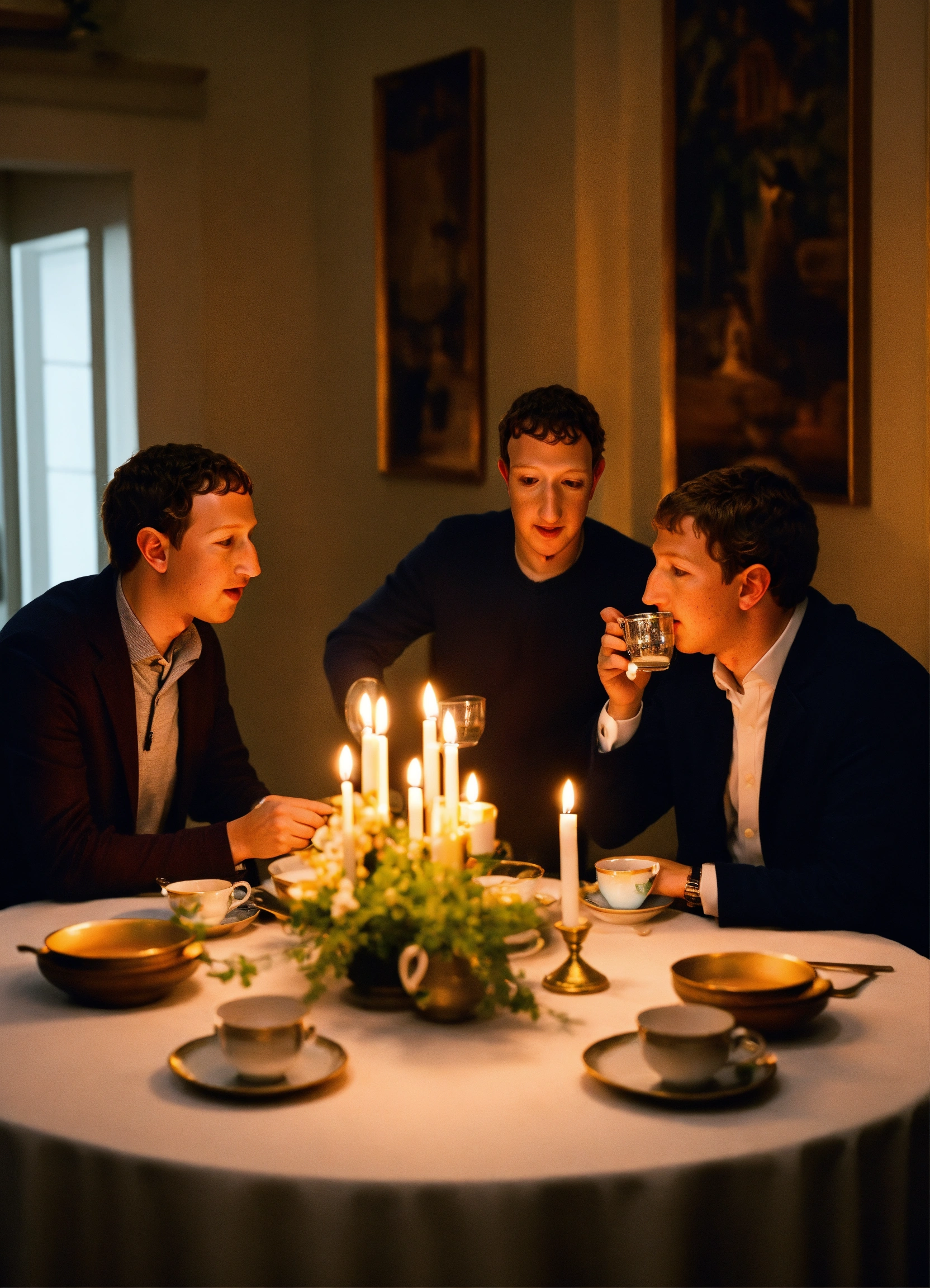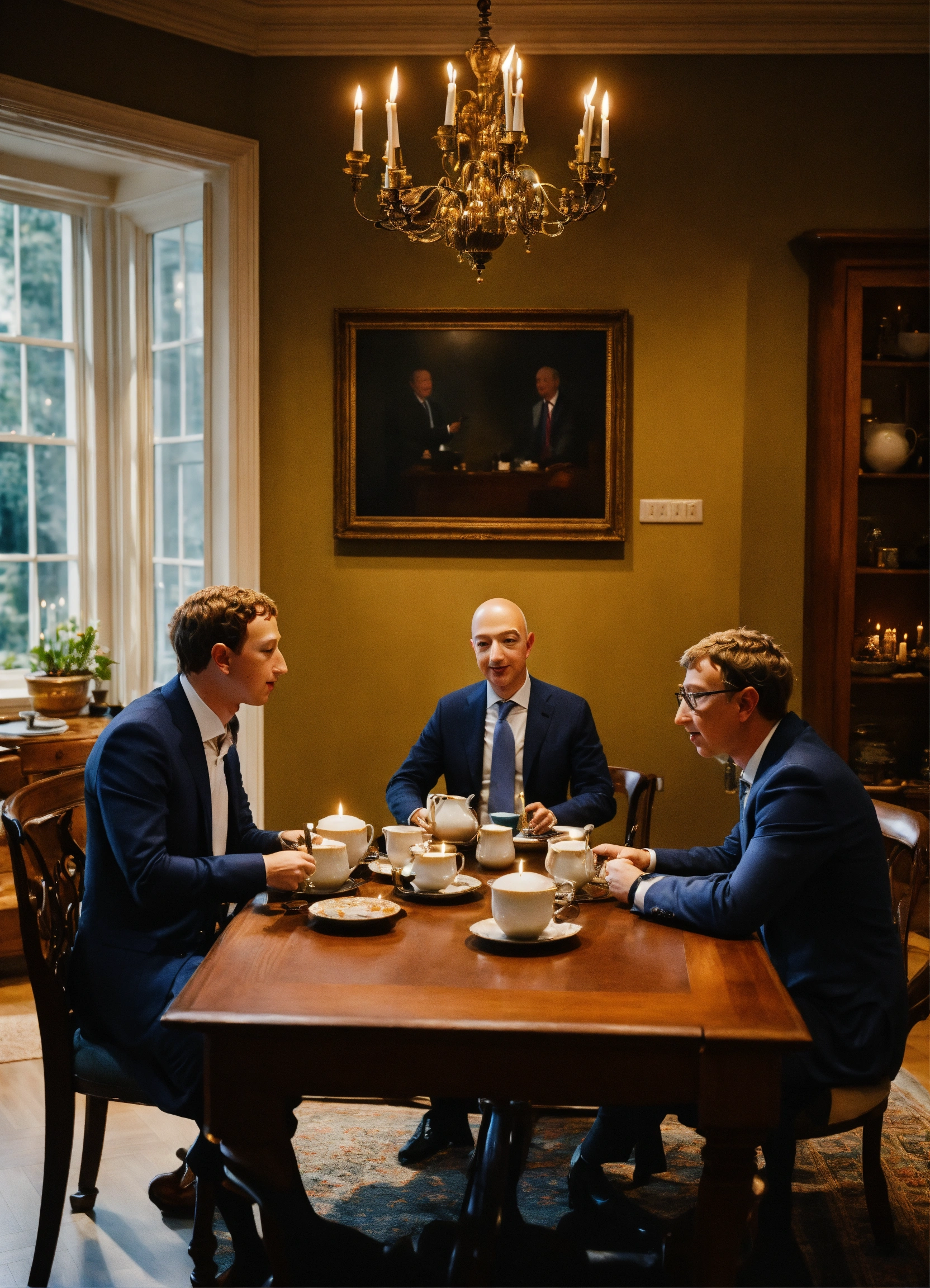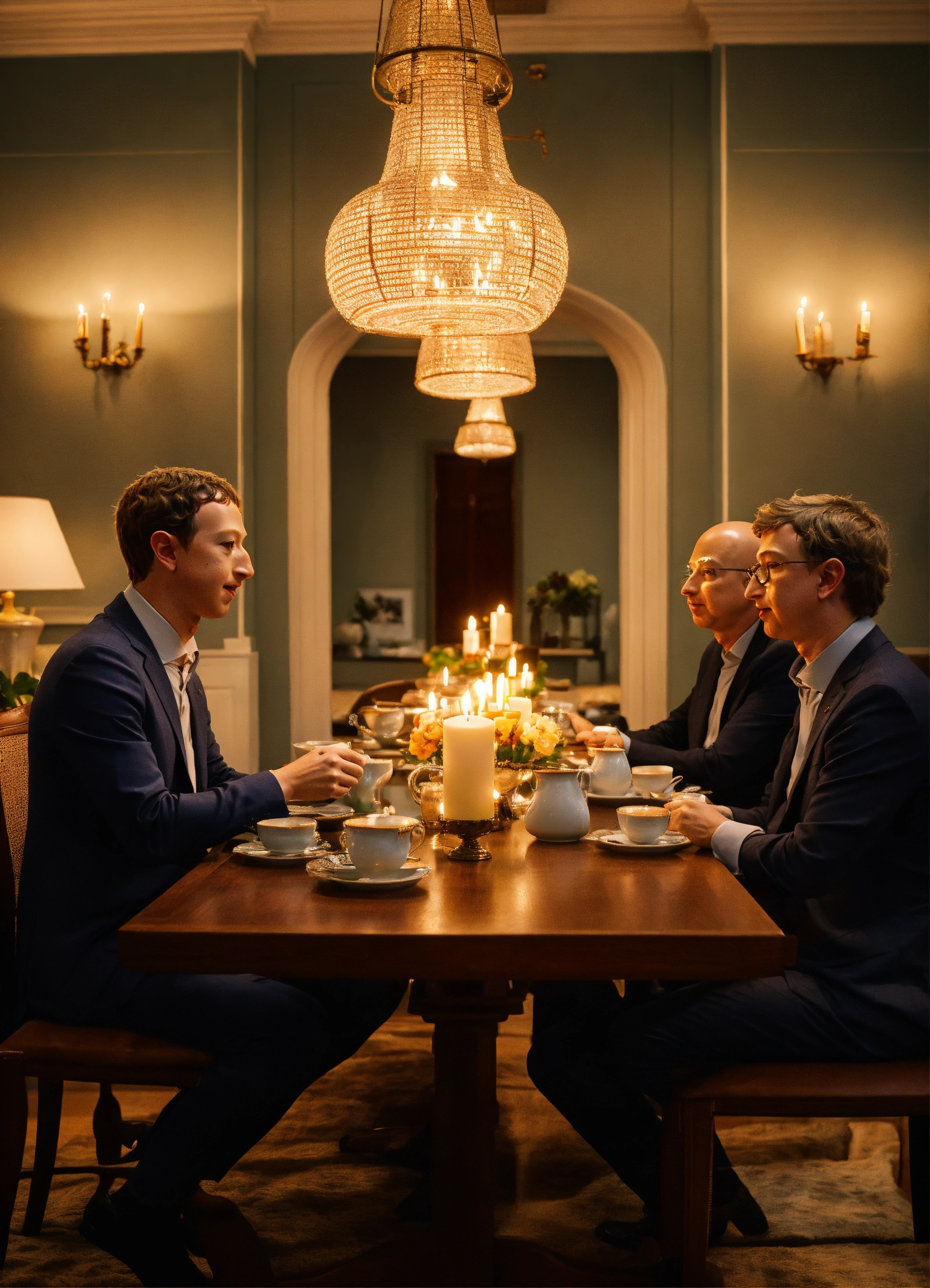 Mark zuckerberg, jeff bezos, bill gates drink tea at the table in a beautiful apartment surrounded by candles, realism, minimalism, light colors.