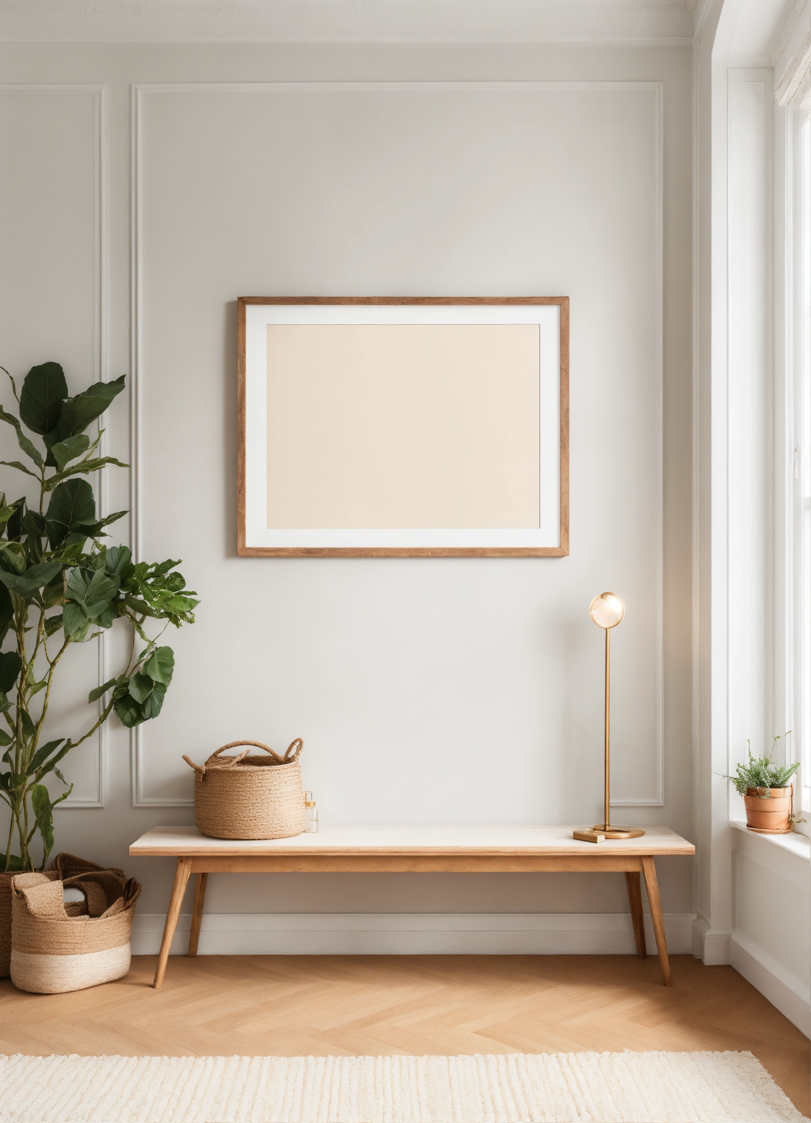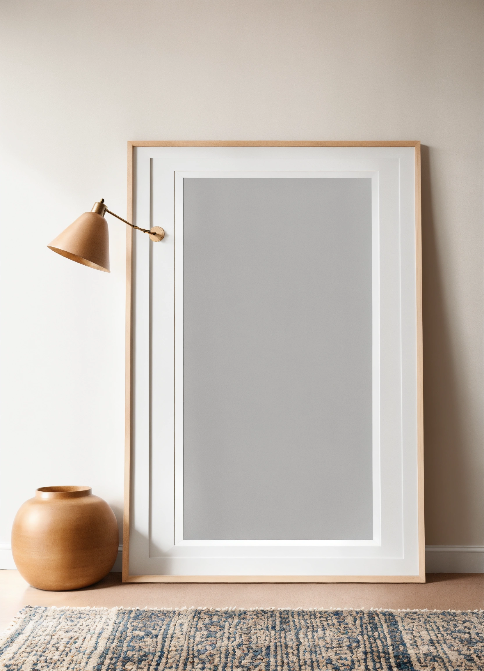 Minimalist clean bright mockup photo of large blank frame on floor with light wooden moulding, white background wall, light boho carpet, trending on etsy