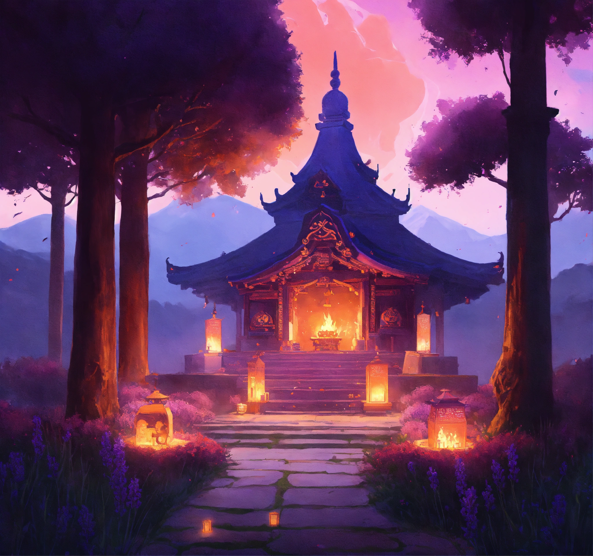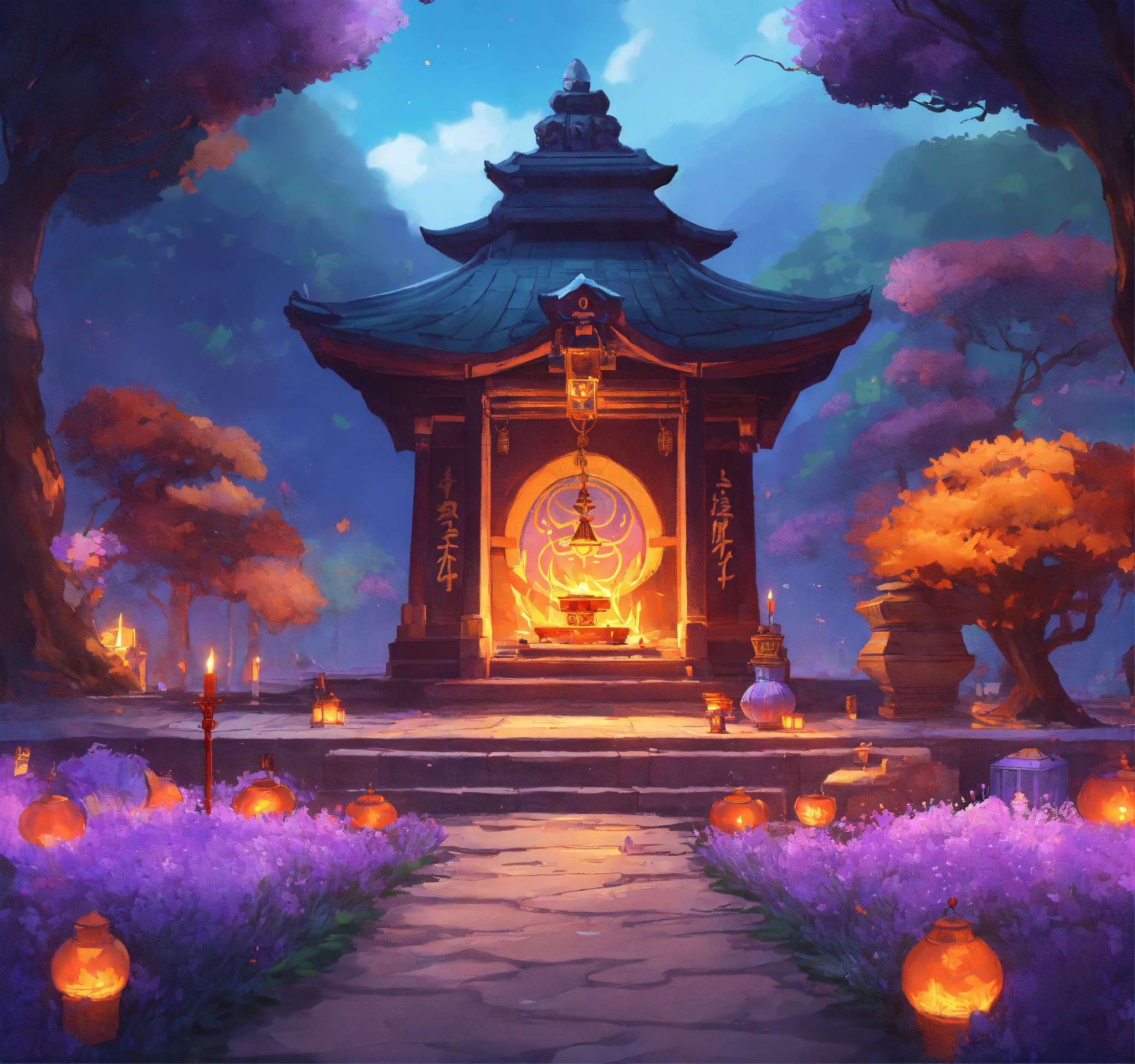 A shrine worshipping aether green fire, shrine placed on the center of the image, the fire emits some kind of skull spirits, you can see various round shaped jewels on the left front of the shrine, there's a glass cup with purple liquid emitting blue-ish purple smoke on the right front of the shrine, around the shrine you can see asian candle lanterns with mythical floral shape designs, purple and orange colored lavender field, the road to the shrine is of clear white marble, beside the road there is a gentle stream of sky blue colored water, dusk, realistic
