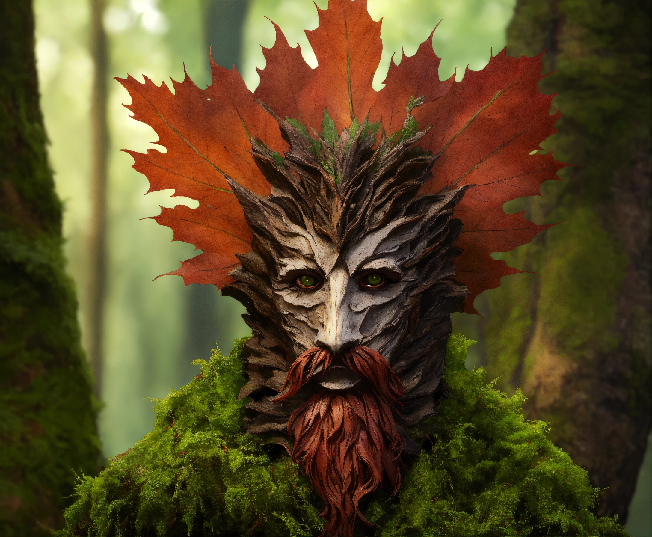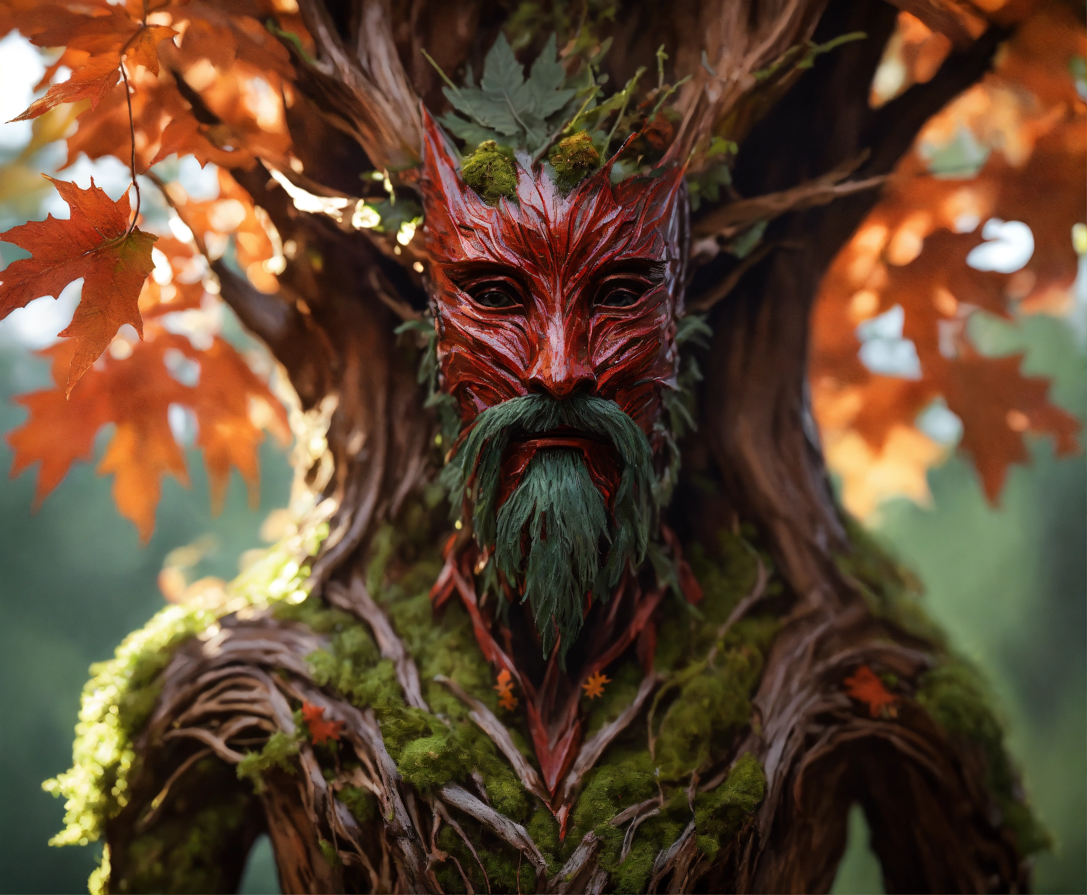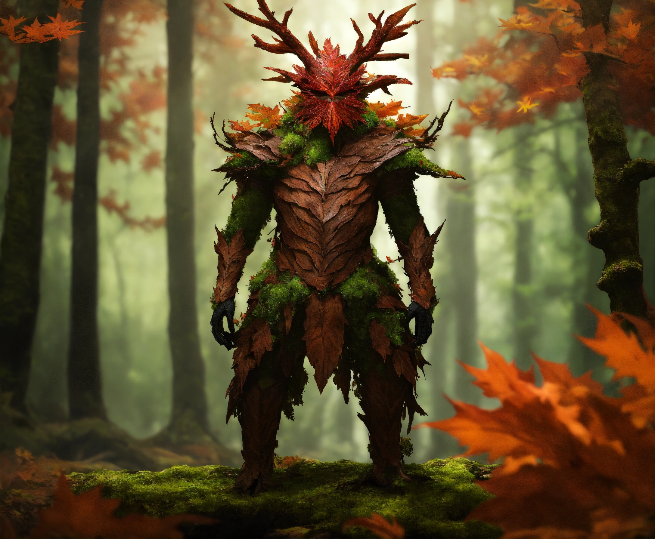 A tall ent-like humanoid creature, its skin is dark maple bark, it wears an intricate wooden mask, its hair are red maple leaves, it has a patch of green and white moss on its chin that resembles a beard, it's a bard, realistic