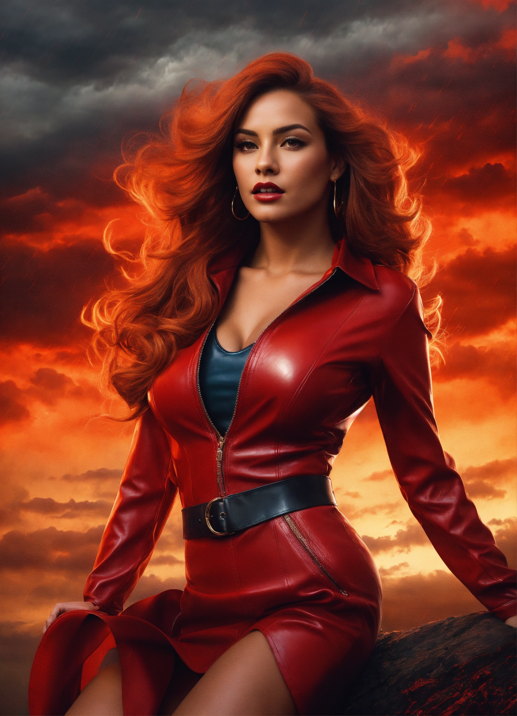 Full body dangerous pin up evil goddess beautiful puerto rican perfect woman, beautiful gorgeous classy ideal woman, beautiful perfect face, shapely hour-glass figure long flowing hair, fully clothed in a stylish mid length red leather form fitting dress and boots, with she's floating in the sky with red lightning and dark clouds behind her, high detail, realistic photo, high detail, digital painting, cinematic, stunning, hyper-realistic, sharp focus, high resolution 8k, insanely detailed