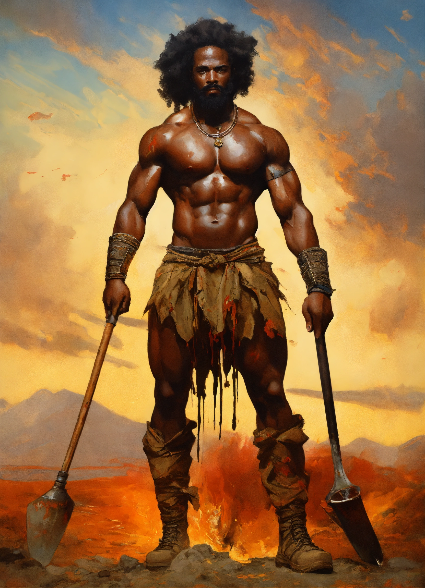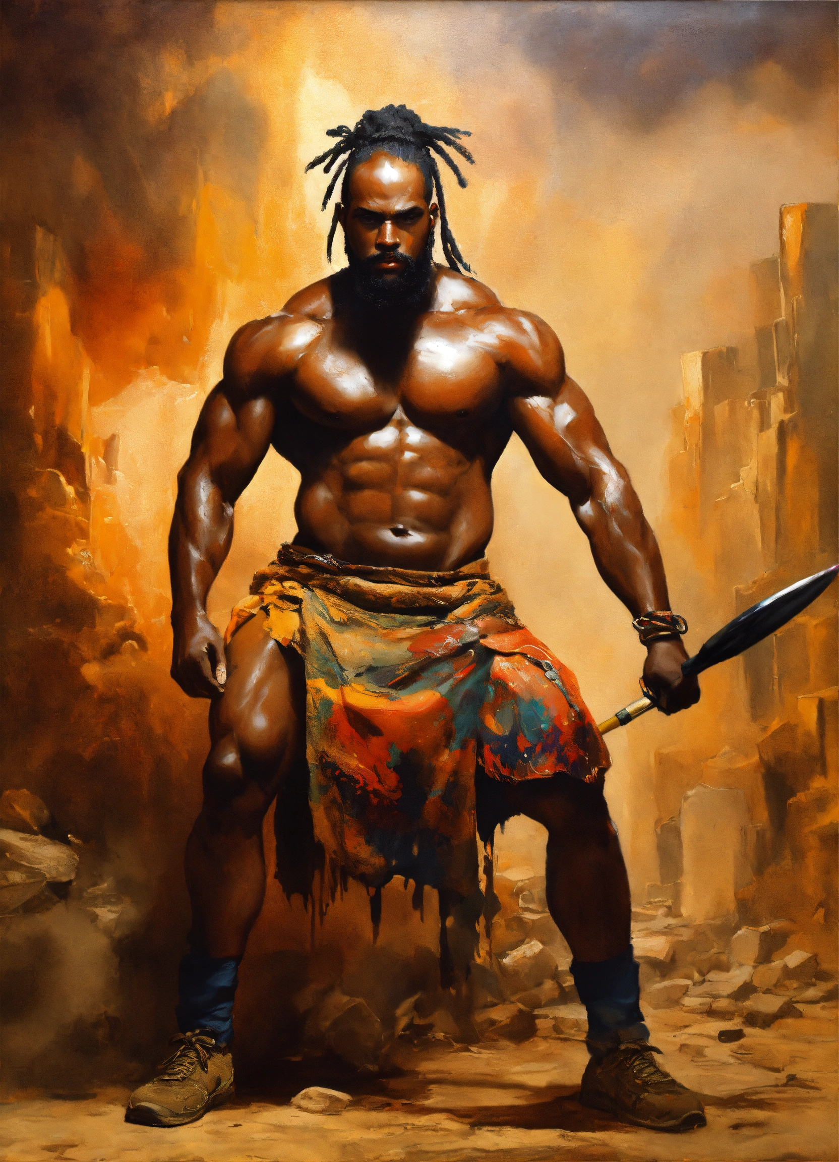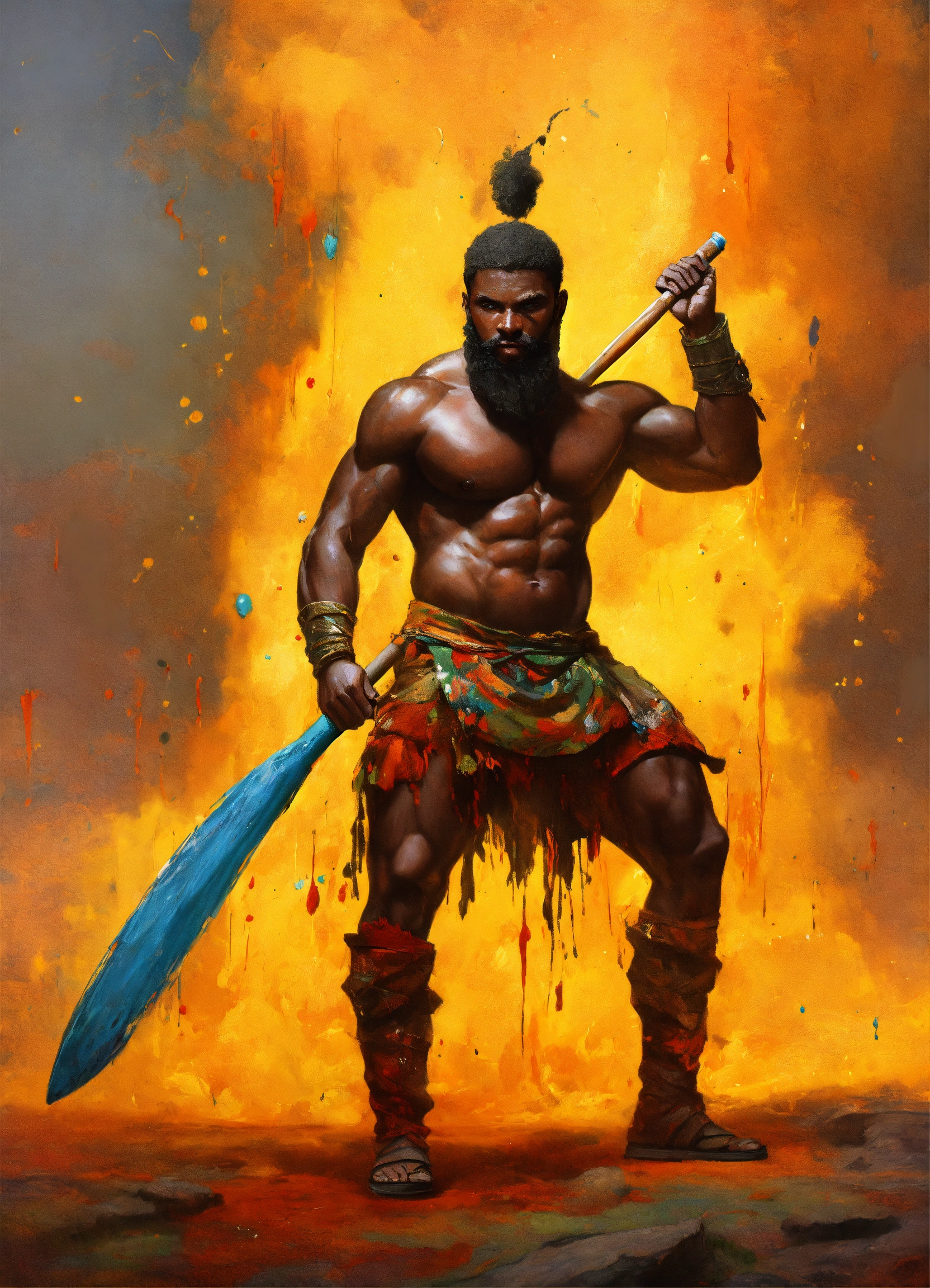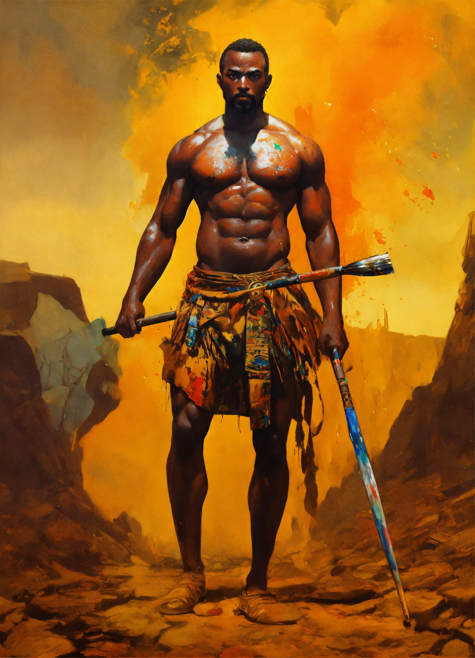 Full body portrait, front facing, man, savage, muscular body, gladi-art-tor african, a male artist fights against a large paint pot, african modern warrior artist, he carries a large paintbrush as a weapon, beautiful matte realistic painting of a of a fantasy landscape, african sculptor, african sculptor, a man carving wood, surreal enigma, creative, surrealism, imaginative, paint splatter, ripped canvas