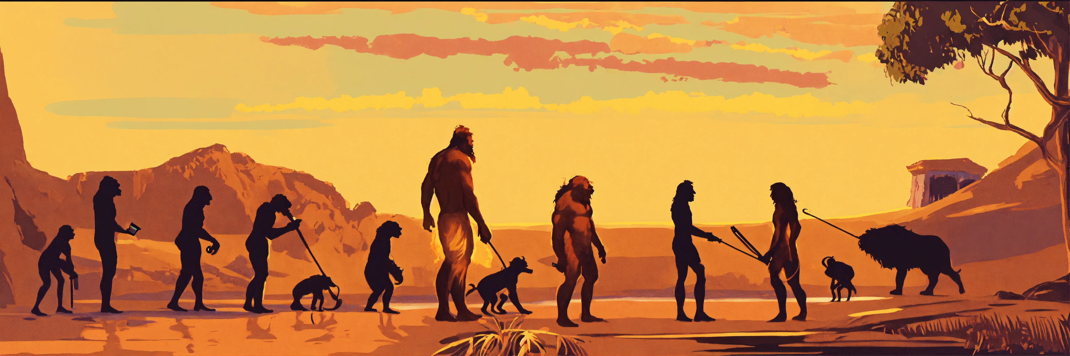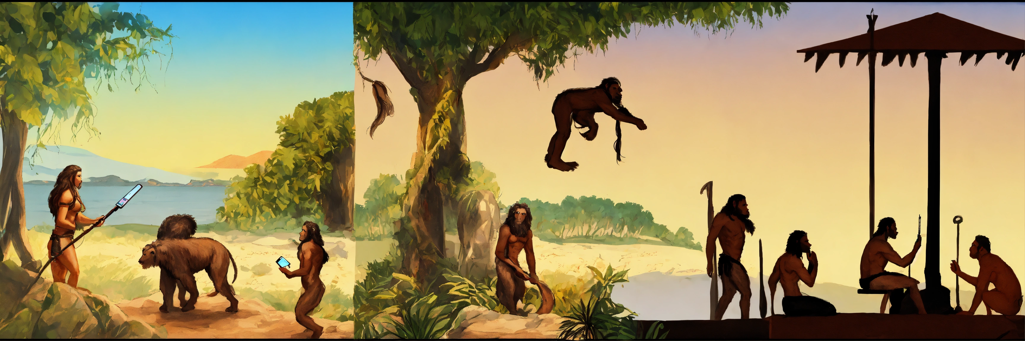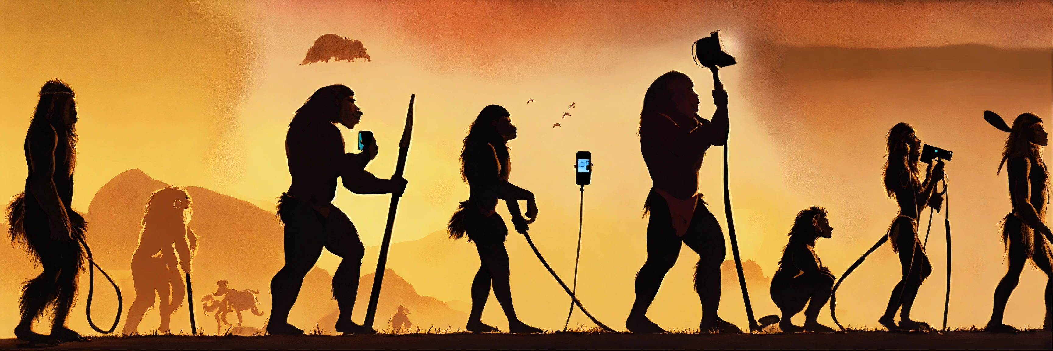 Can you make an image depicting human evolution from a cavewoman to an ipone and then chatgpt