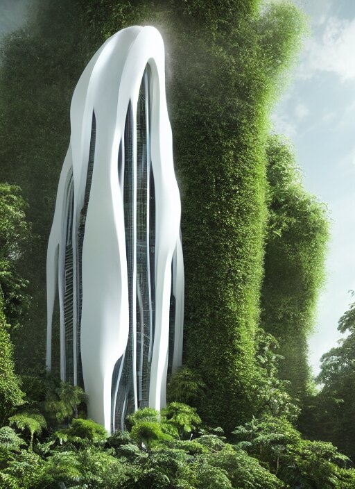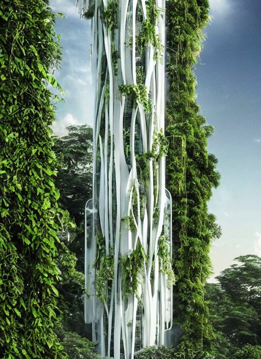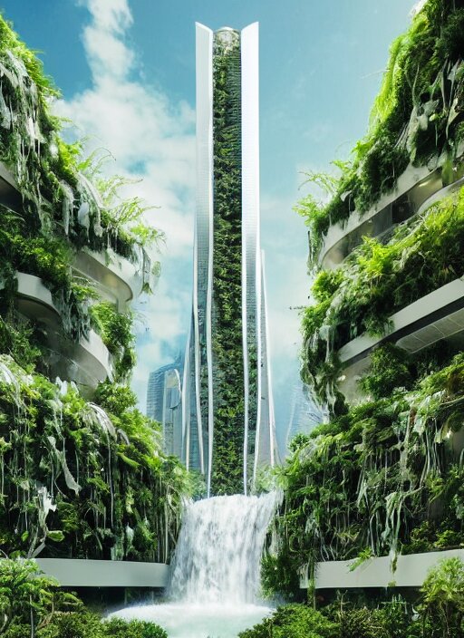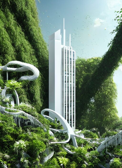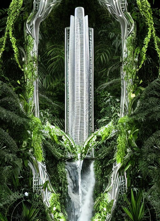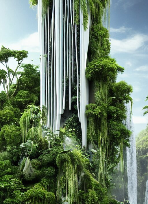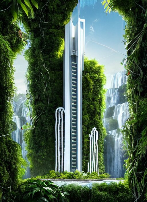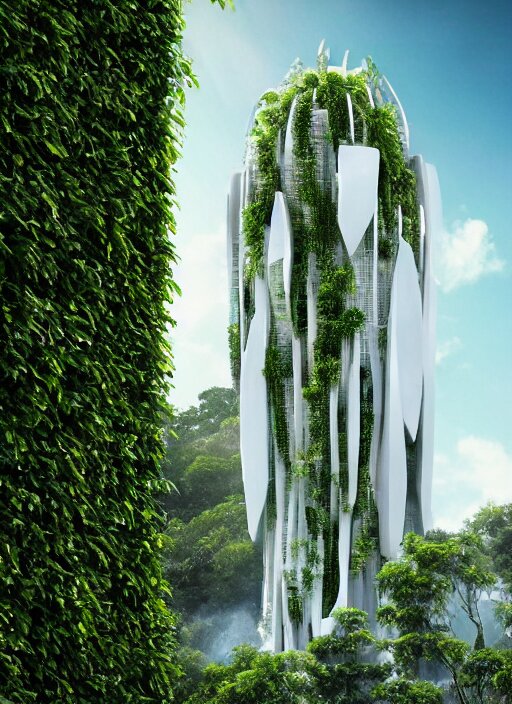 White futuristic skyscraper covered in plants, hanging vines, exterior view, magical white futuristic alien library, expansive grand scale, with ornate detail carved in blackbutt timber, next to a waterfall, plants, greenery, white flowers, hanging vines, candles, glowing sprites, fibonacci composition, photorealistic, 4 k, god rays, highly detailed, octane render