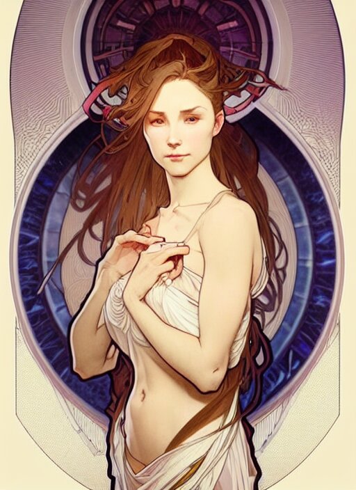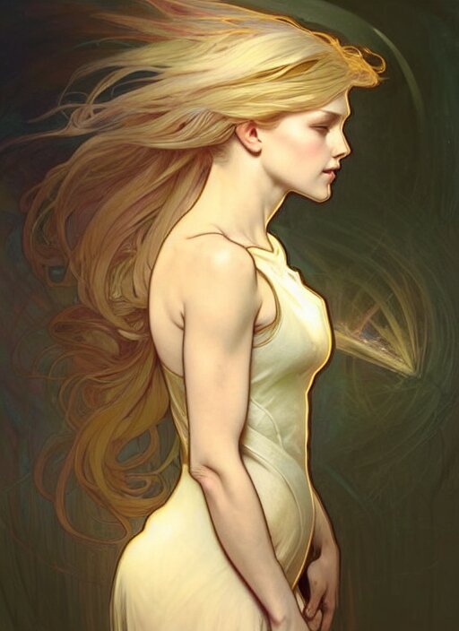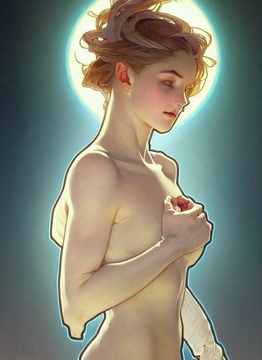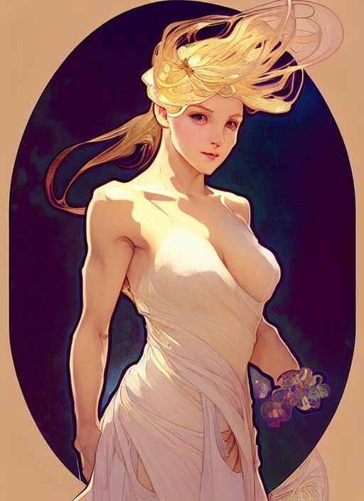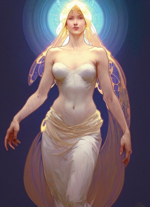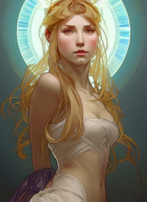 Digital character concept art by artgerm and greg rutkowski and alphonse mucha. clear portrait of a modern young wife blessed by god to unstoppably grow more perfect and fertile!! blonde, in clothes!! feminine well - formed holy body!! light effect. hyper detailed, glowing lights!! intricate, elegant, digital painting, artstation, smooth, sharp focus