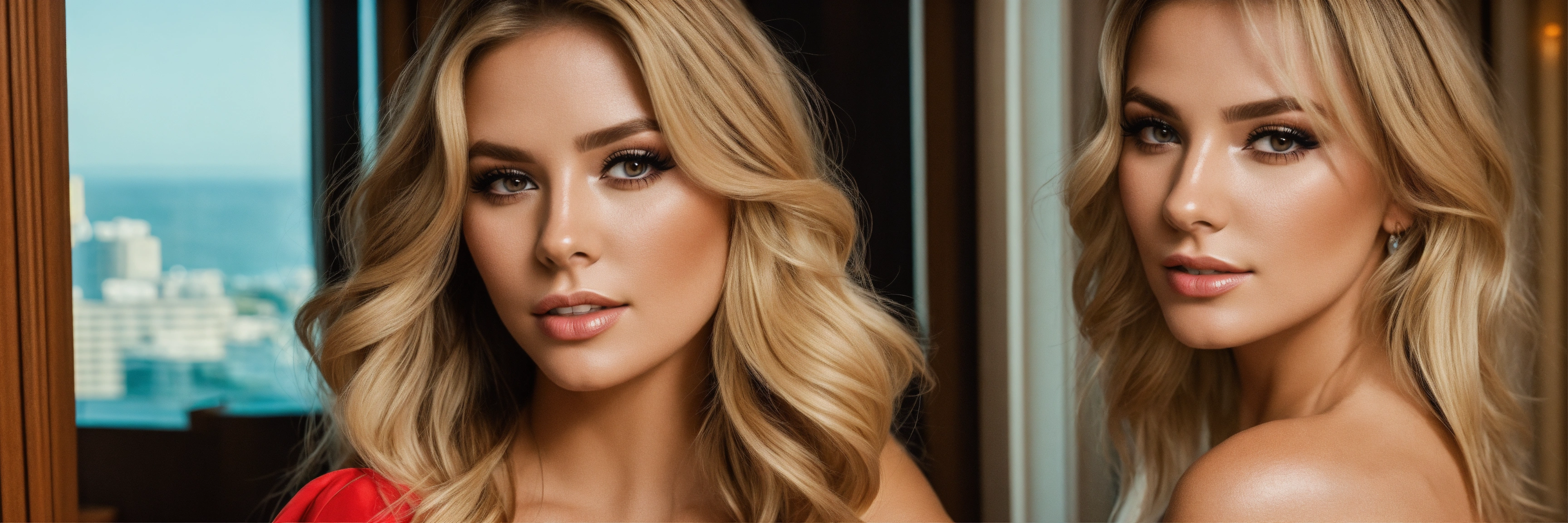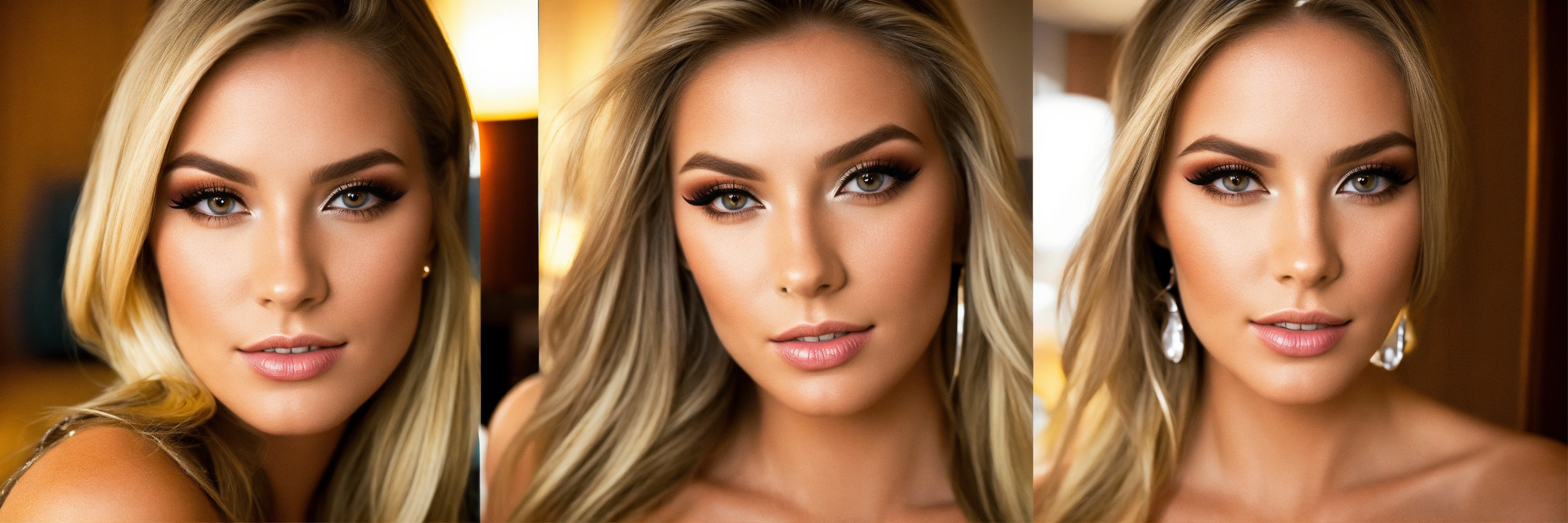 Three hot blonde faces with different vibrant makeup seeking companionship in a luxurious hotel room