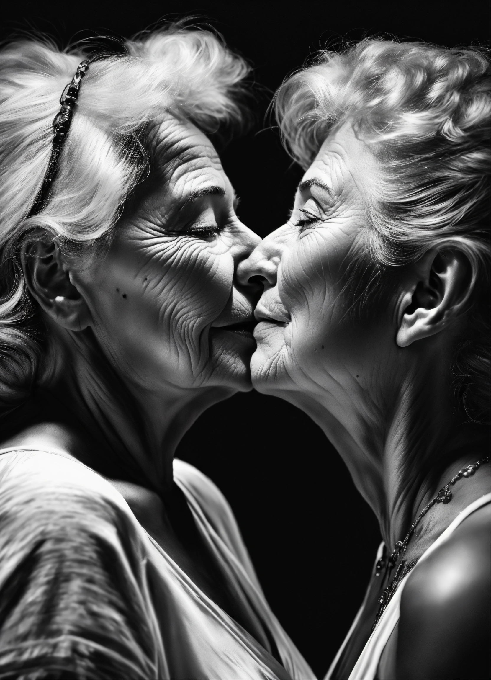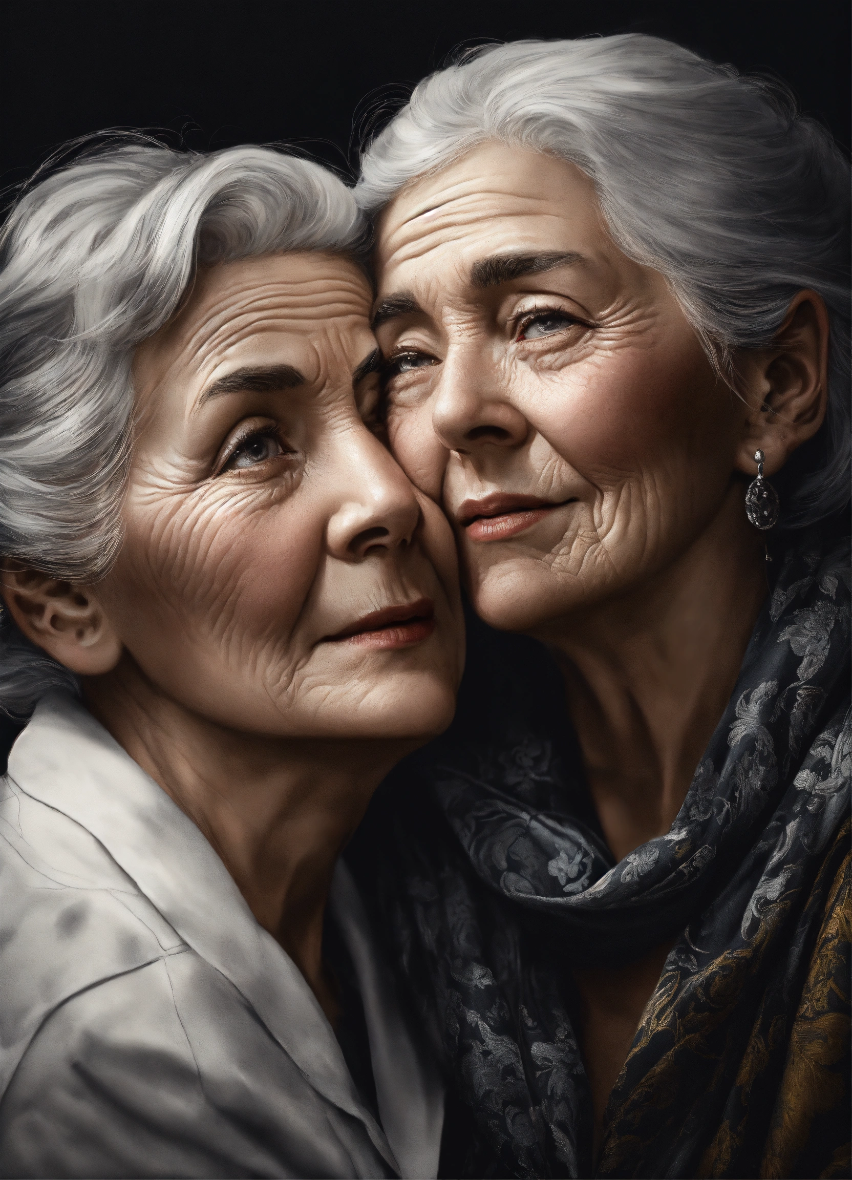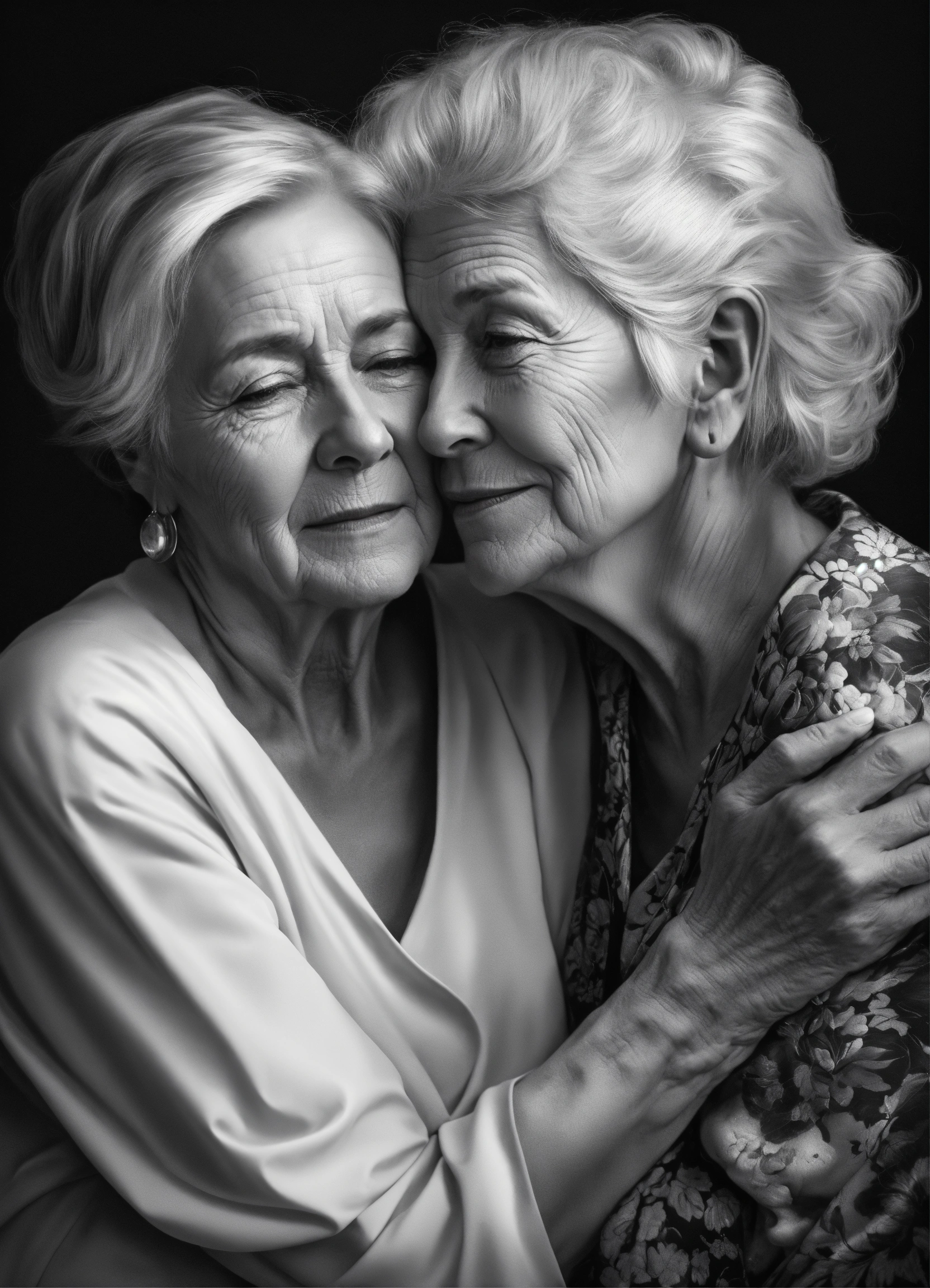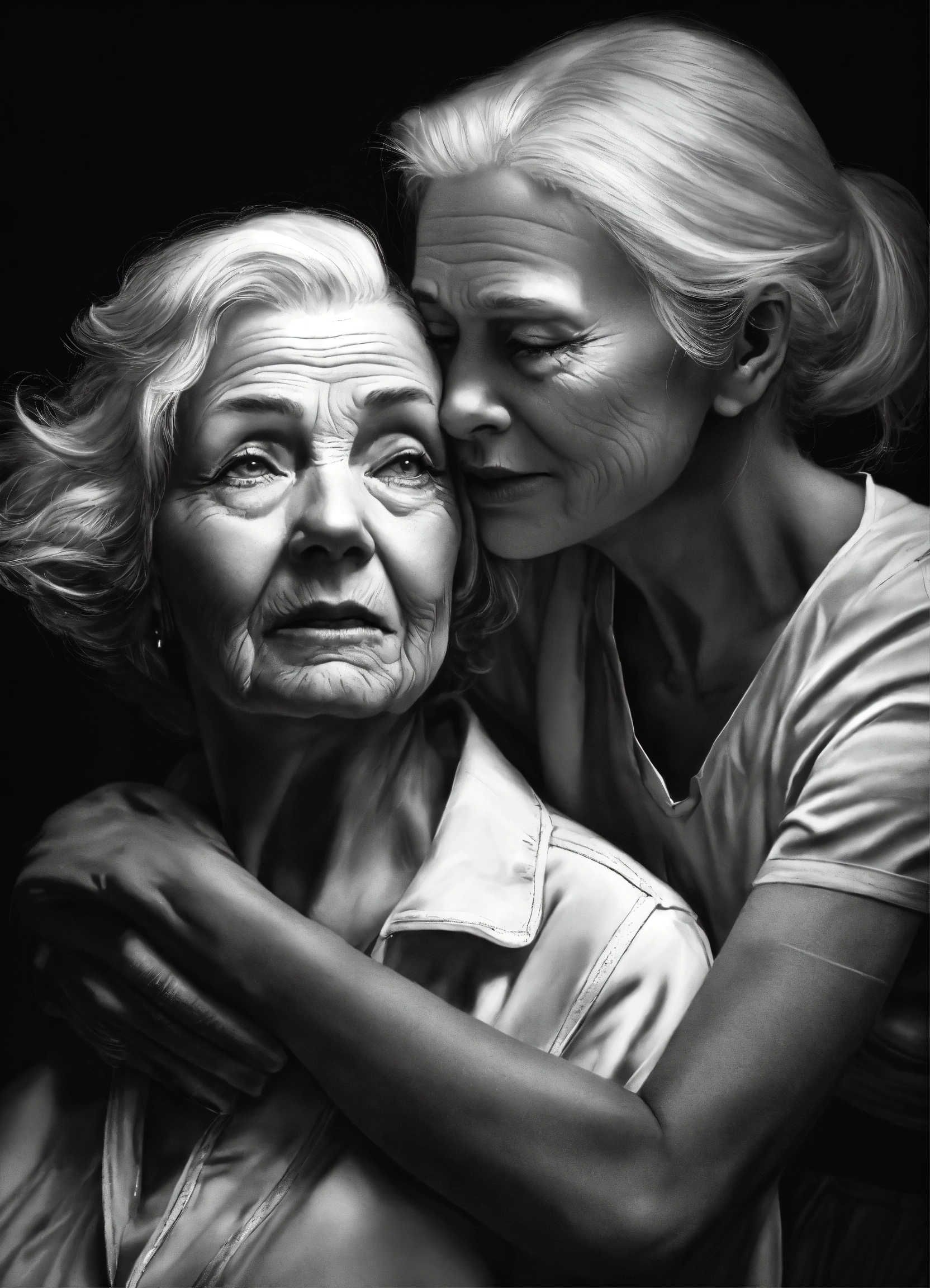 Pop art, hyperrealist portrait of white old woman and woman embracing, black and white painting, fantasy art, photo realistic, dynamic lighting, artstation, poster, volumetric lighting, very detailed faces, 4 k, award winning