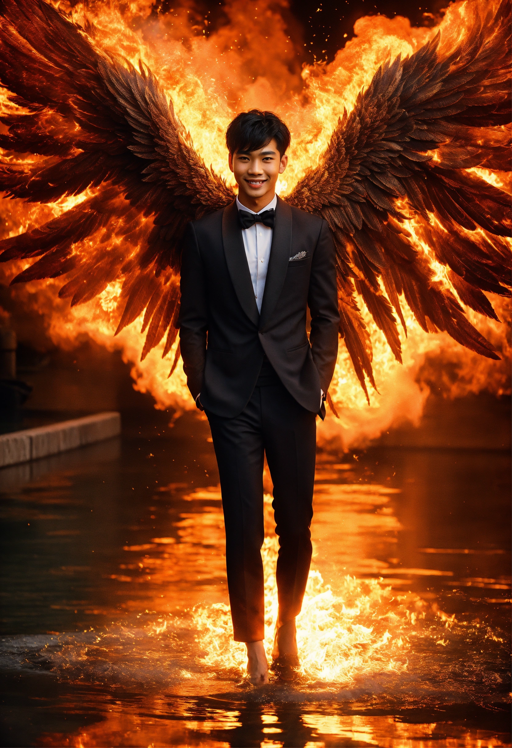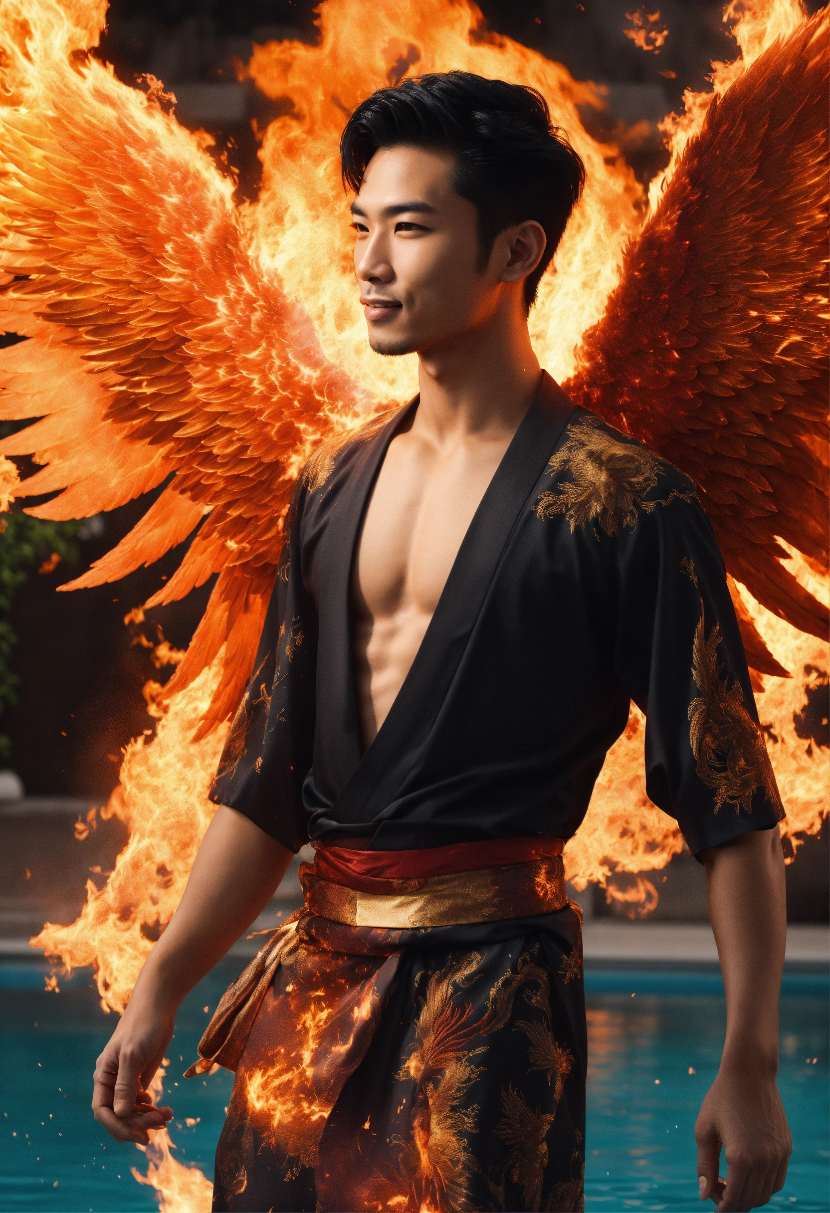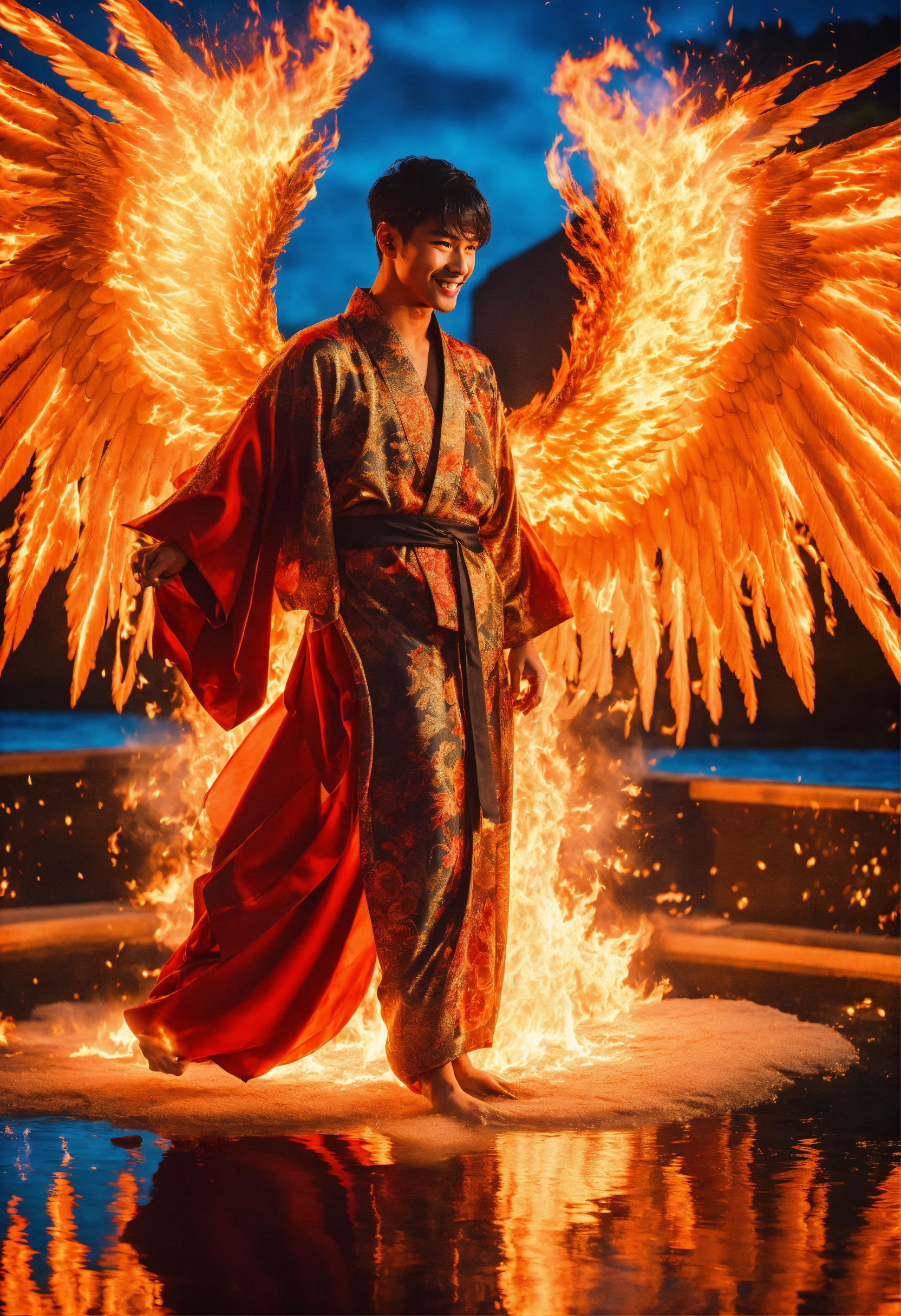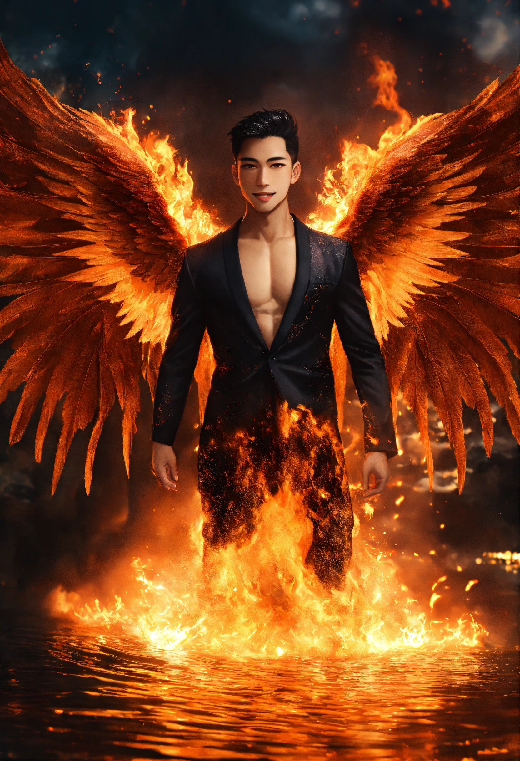 Surrealistic photograph close-up portrait masculine archangel of fire with massive angel wings, background is explosion of fiery sparks over pristine pool of water, gorgeous young asian supermodel male joyous, sweet friendly smile, staring lovingly straight ahead directly into camera at me, short black hair, loving black eyes centred directly on me, with a ball of fire in his hands, wearing stylized black kimono with flaming phoenix details and a high neckline