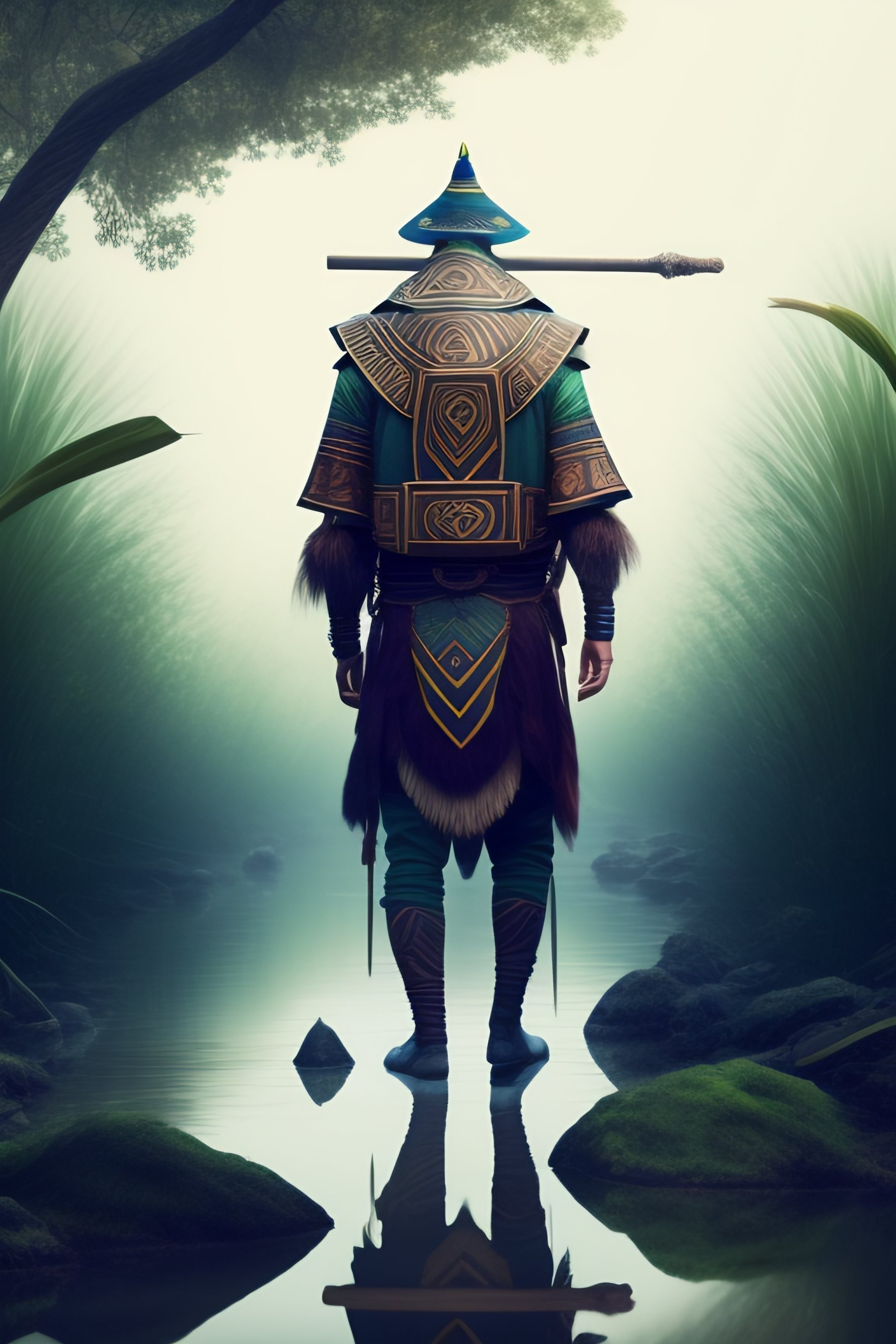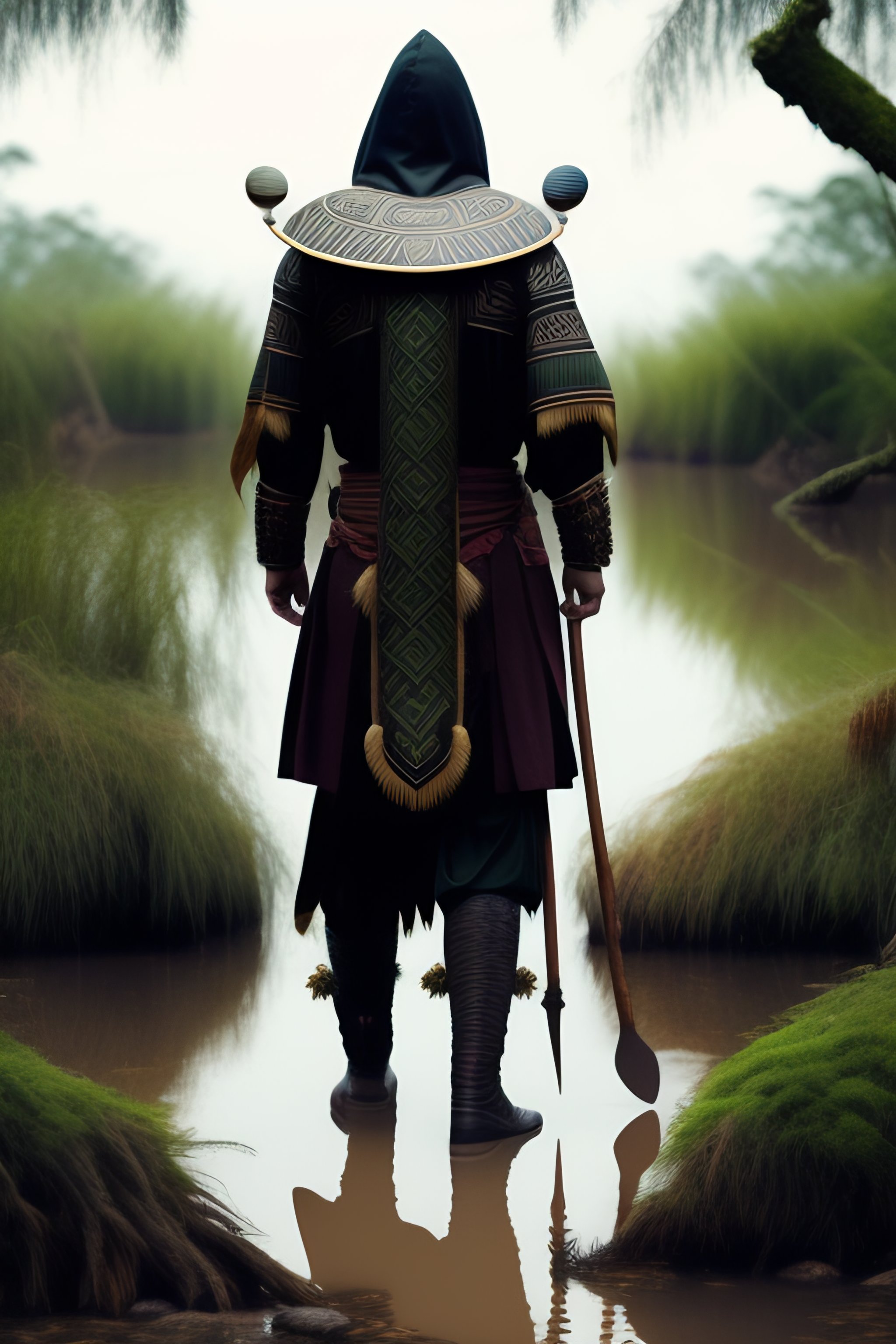 Turtle-man creature standing in a swamp, wearing a tribal outfit, a long stick in his hand, a turtle shell on his back, manga style