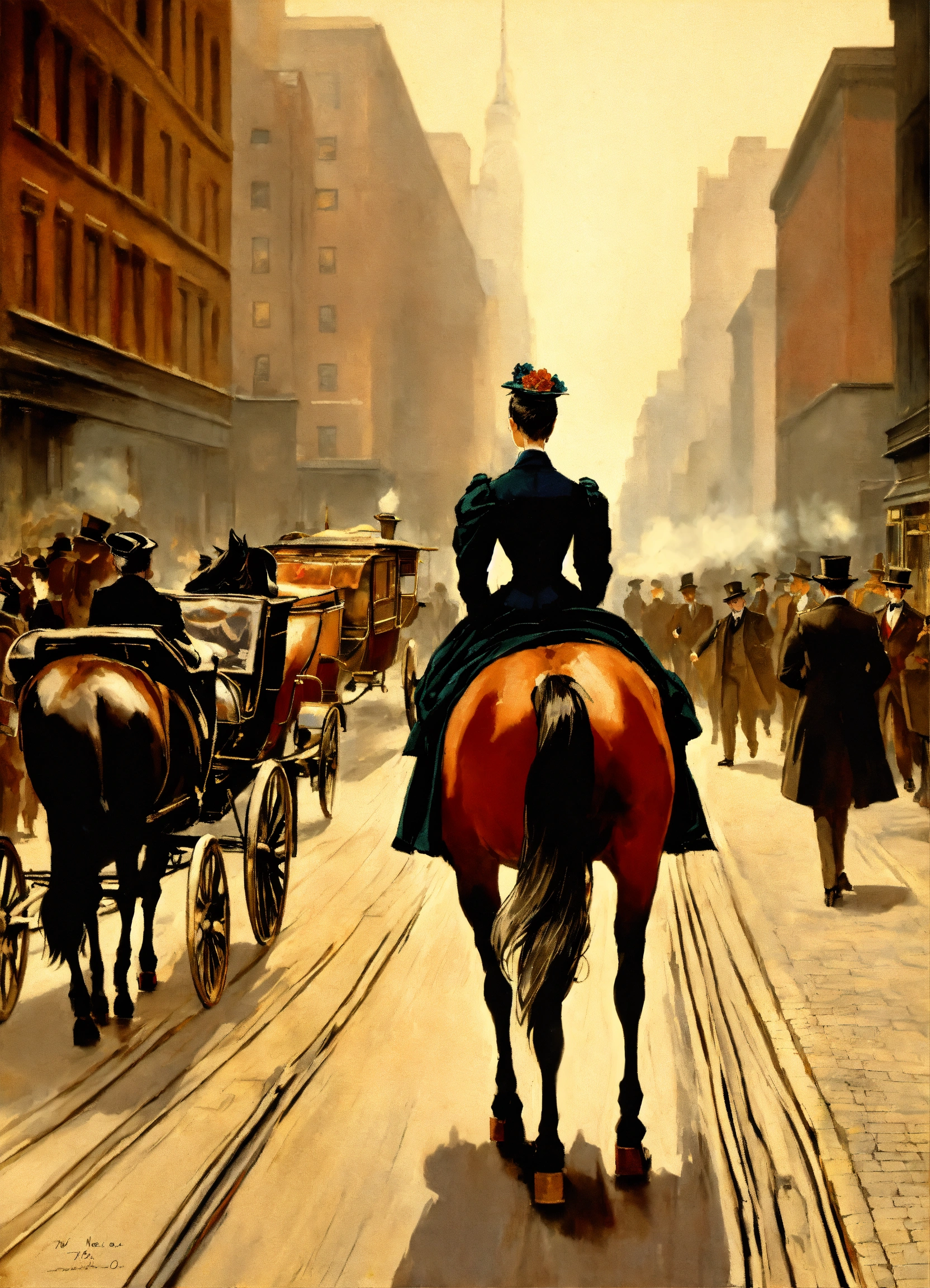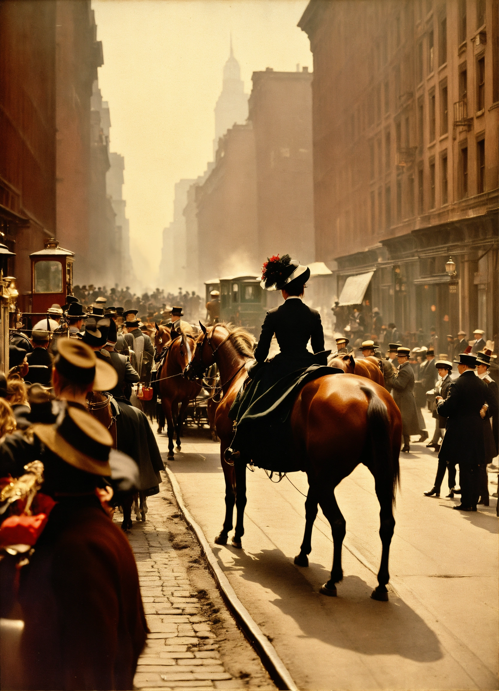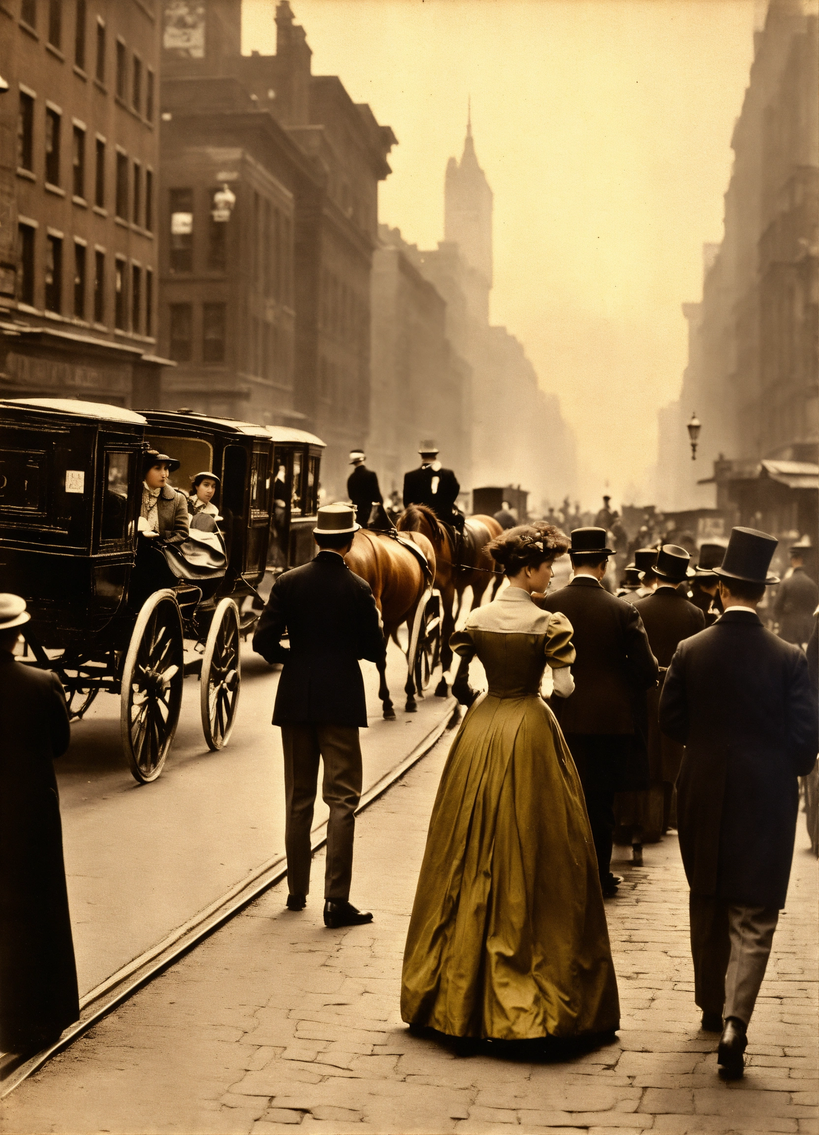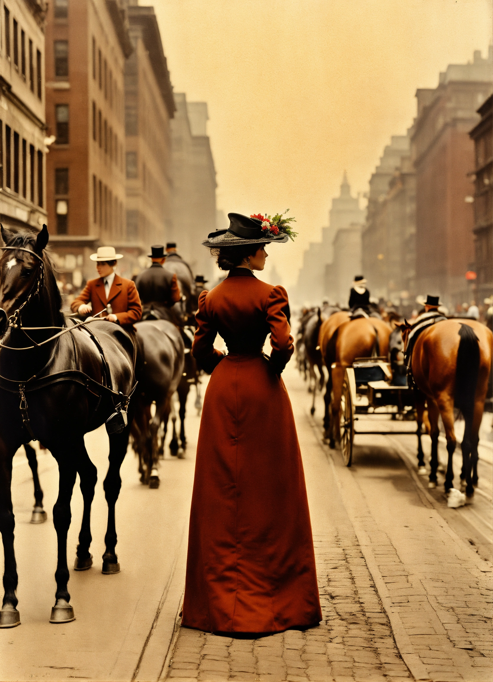 Strade of new york, 1900s, beautiful girl, from behind, walks for a road crowded with passers -by and carriages tainated by horses