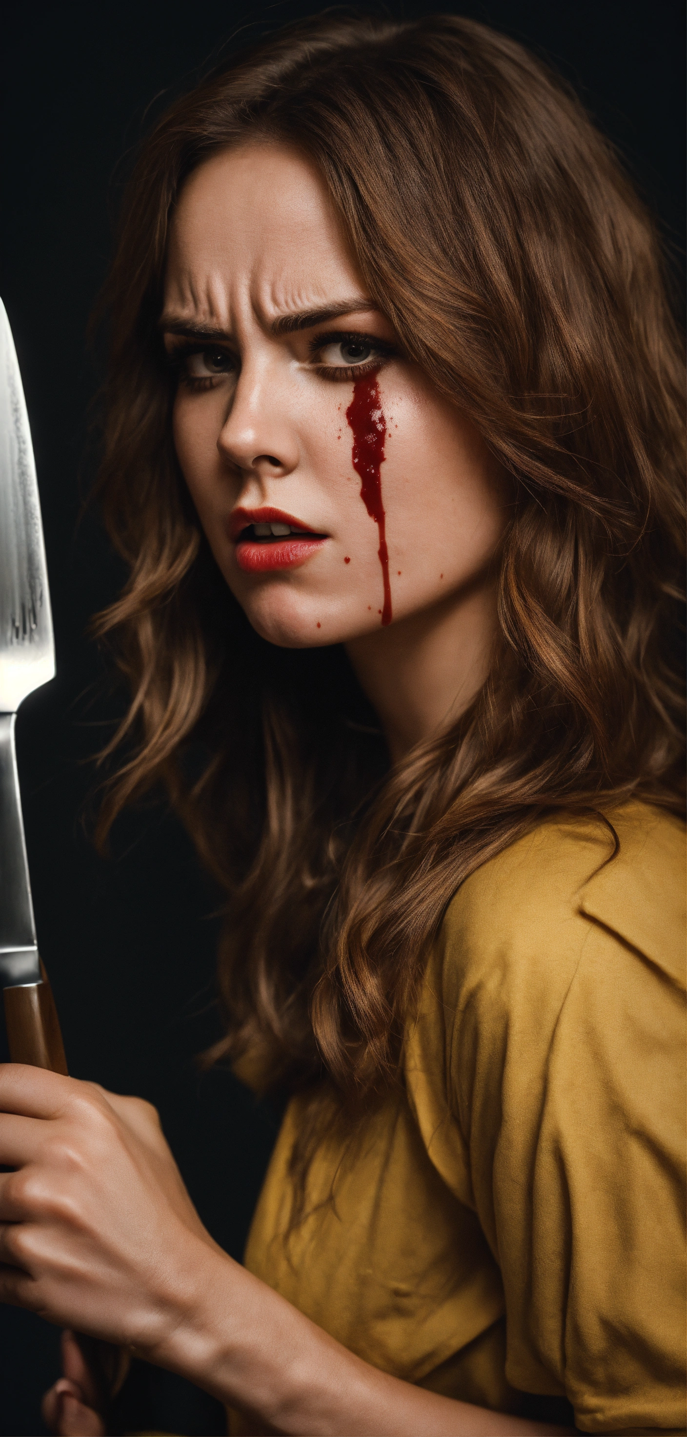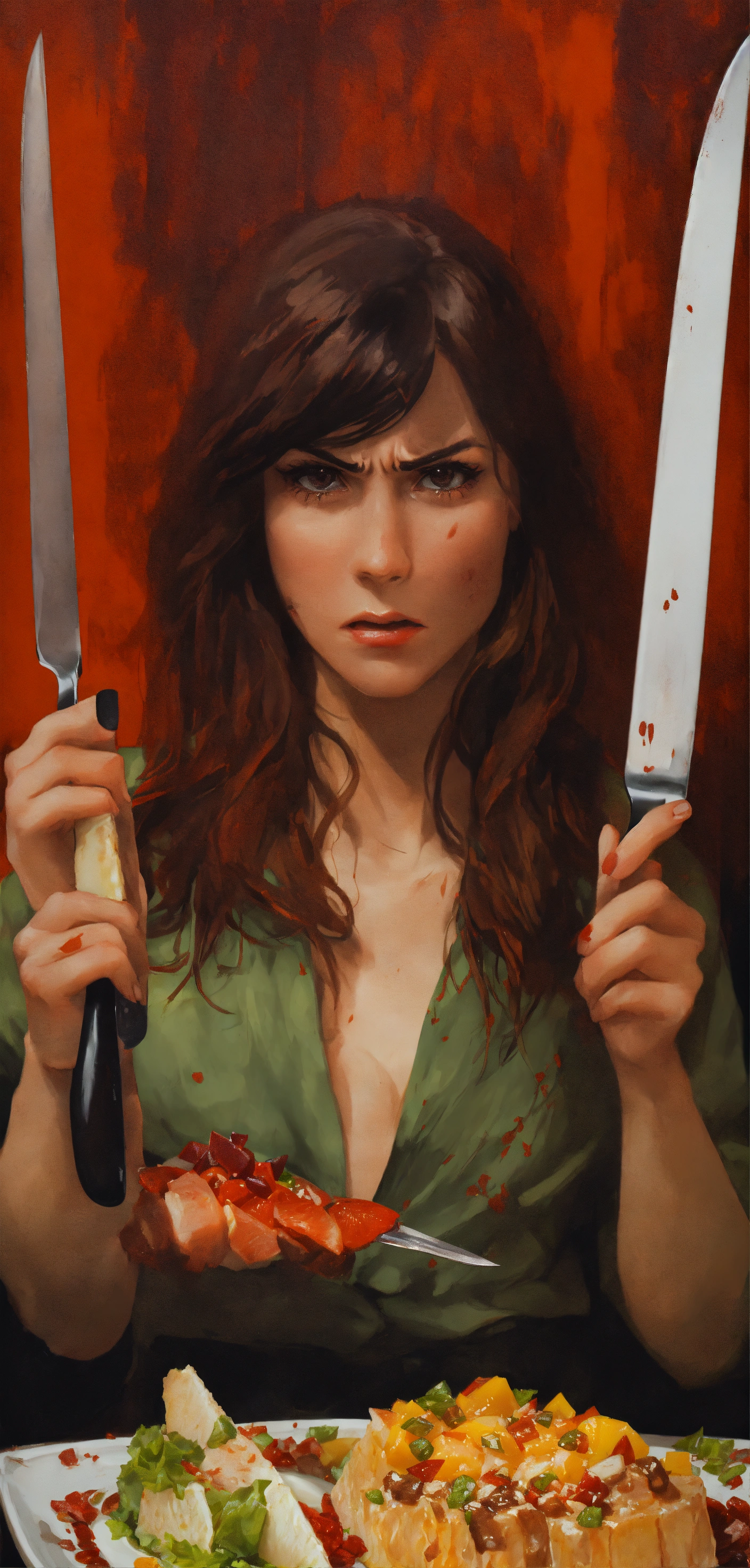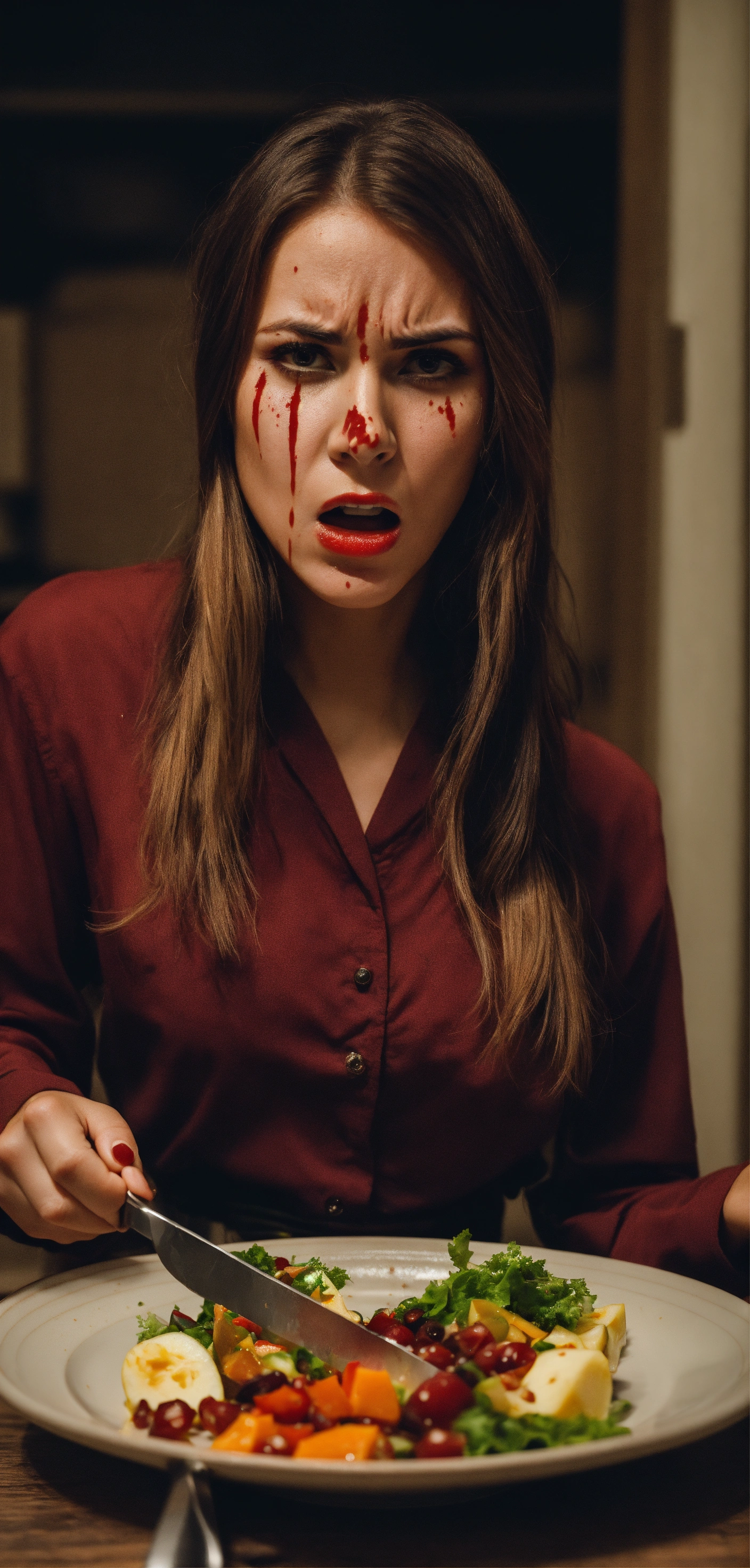 A young beautiful woman in her 30s with a very angry face is holding a knife and fork, the girl's face is stained