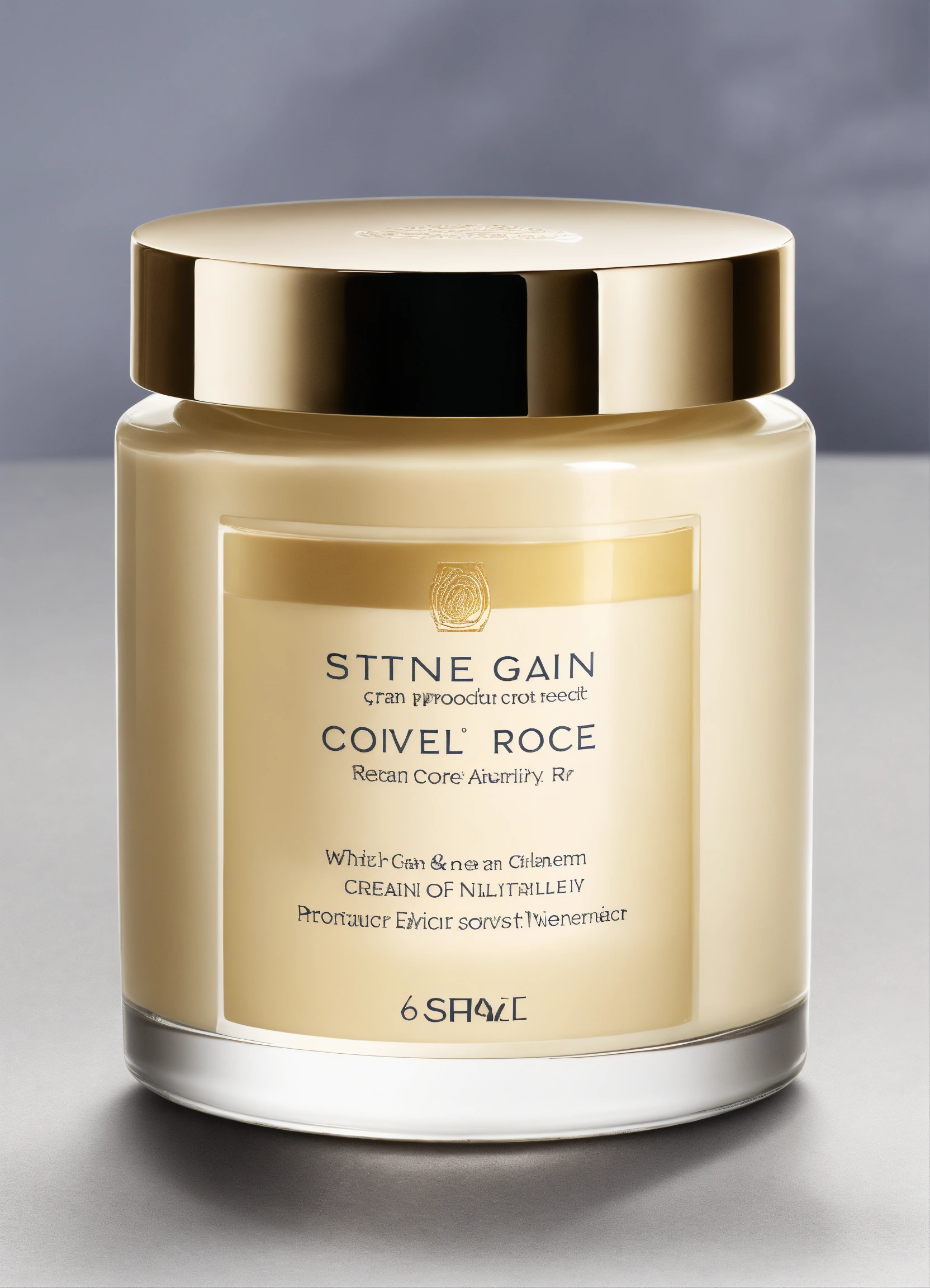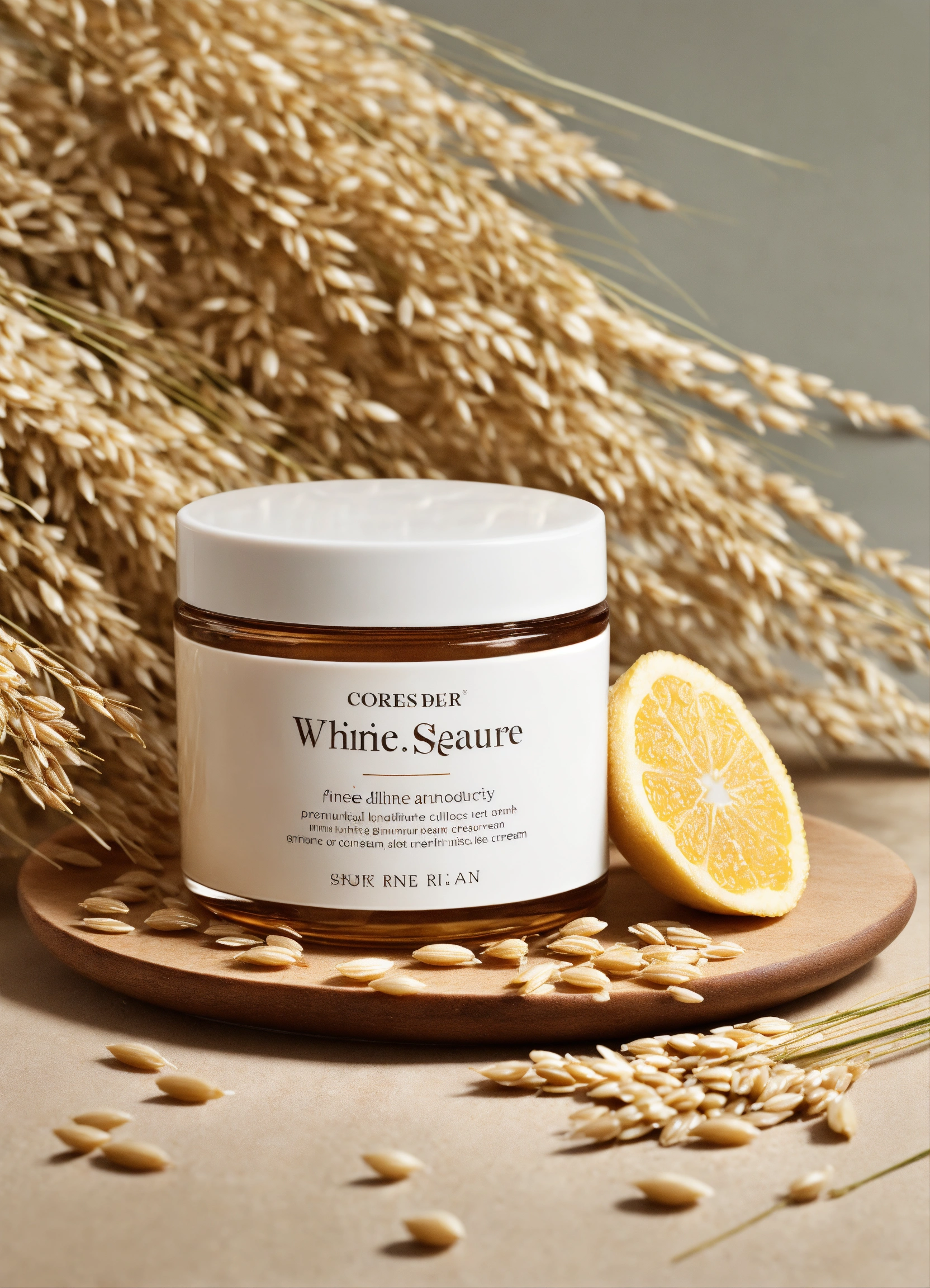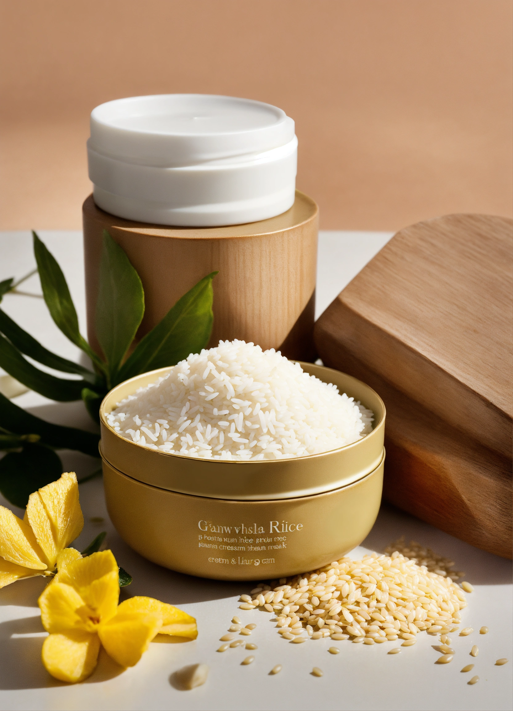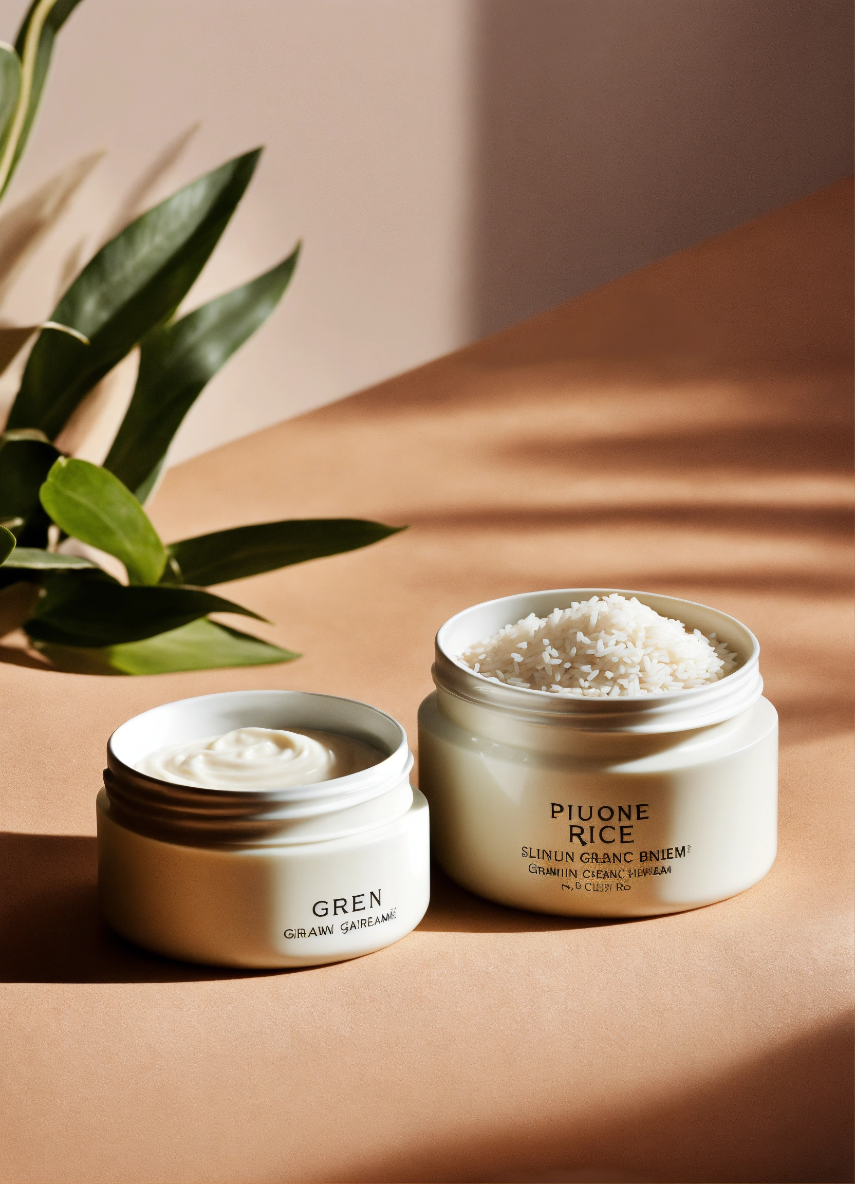 Craft an image showcasing a skincare cream product. the product should stand out, situated centrally against a pristine white background. drawing inspiration from white rice, the design and color scheme should evoke the pure, clean, and nourishing properties of this staple grain. the skincare cream container should subtly hint at the smooth texture and milky color of white rice, ensuring an organic and wholesome feel. details to include the skincare cream container should have a minimalistic label, with perhaps a small white rice grain or motif. the product must be sharply in focus while the background remains a clean white. the cream texture, if visible, should be reminiscent of the creamy consistency often seen in rice-based products. use gentle lighting to amplify the product's purity and connection to white rice. the resulting image should seamlessly convey the benefits of white rice, presenting the skincare cream as a natural, nourishing choice.