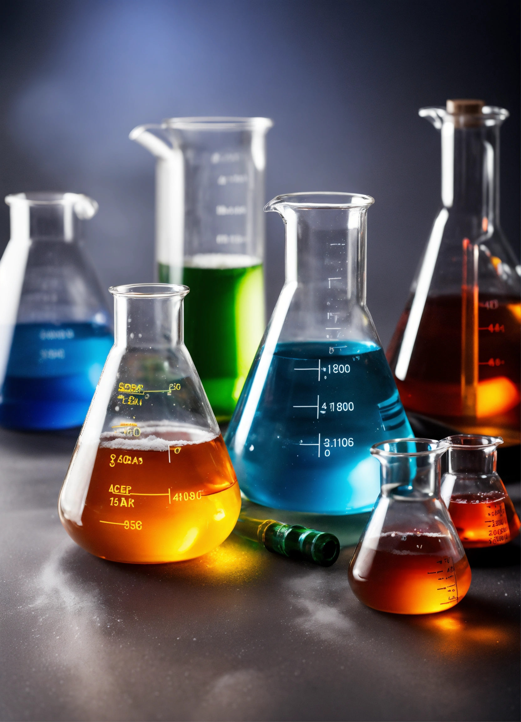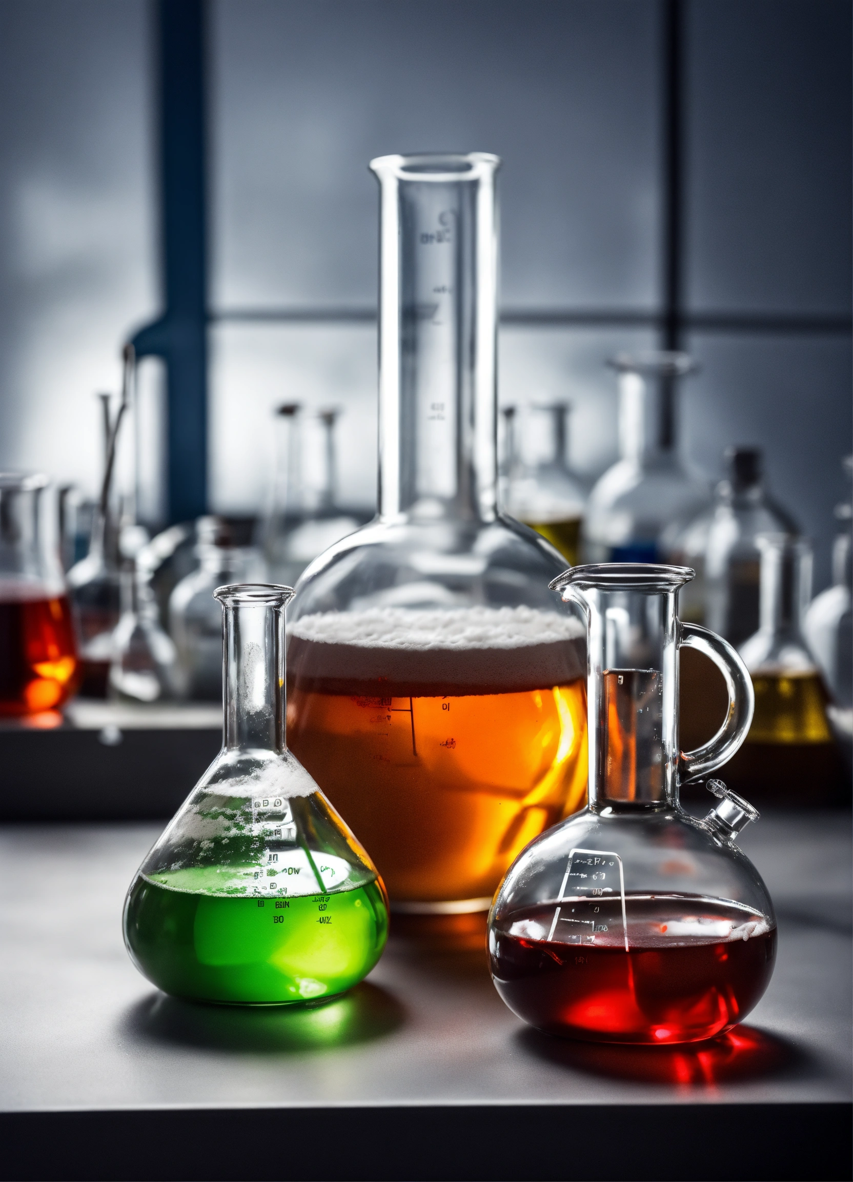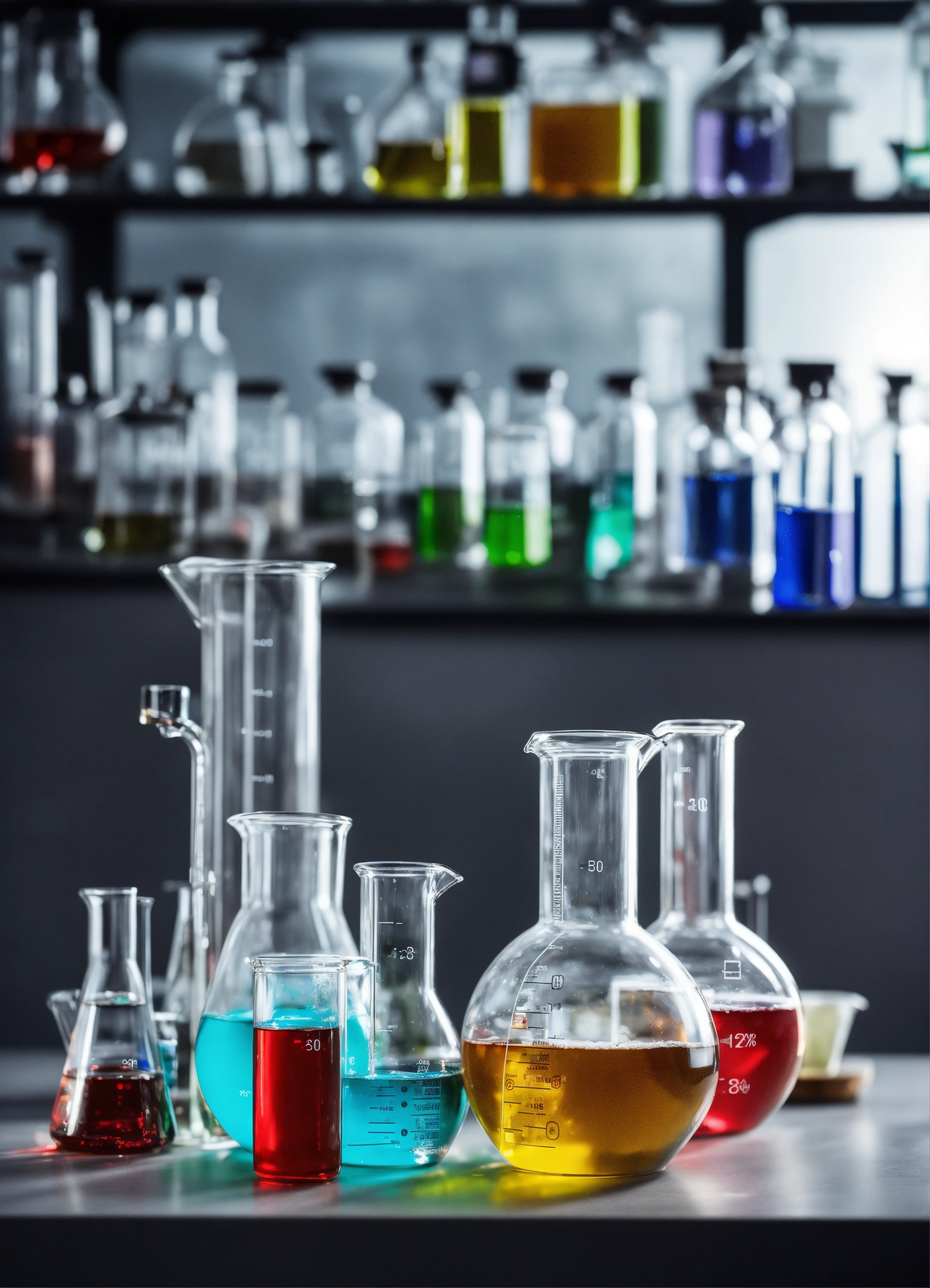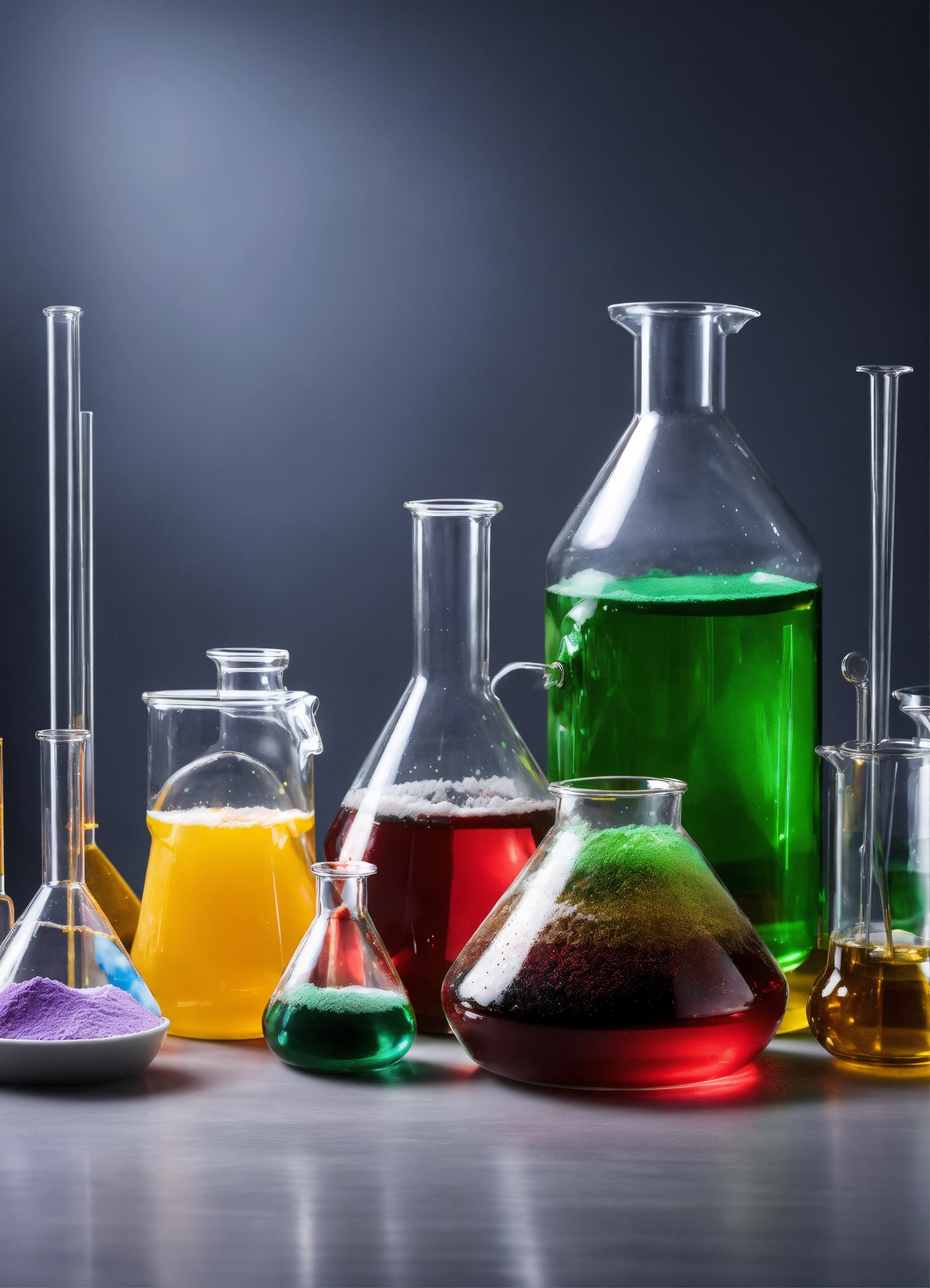 Different chemicals with powders in dishes and liquids in flasks in glassware in a laboratory environment, grey background
