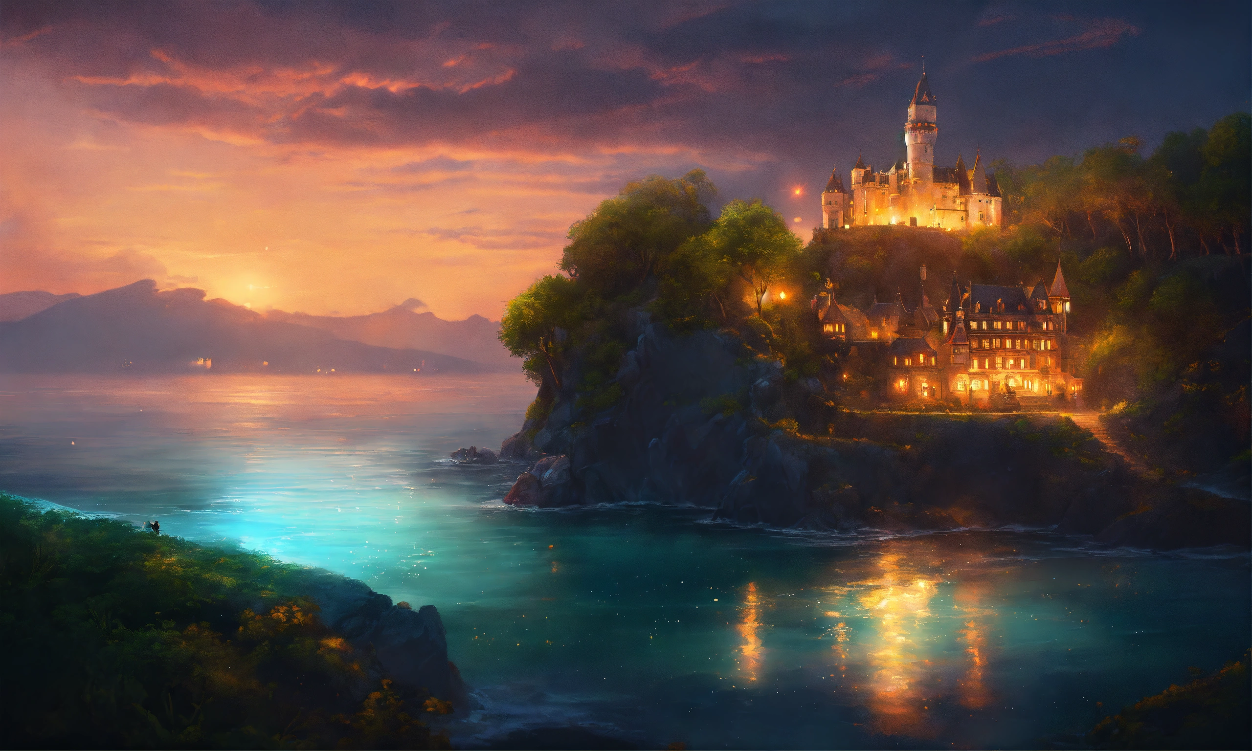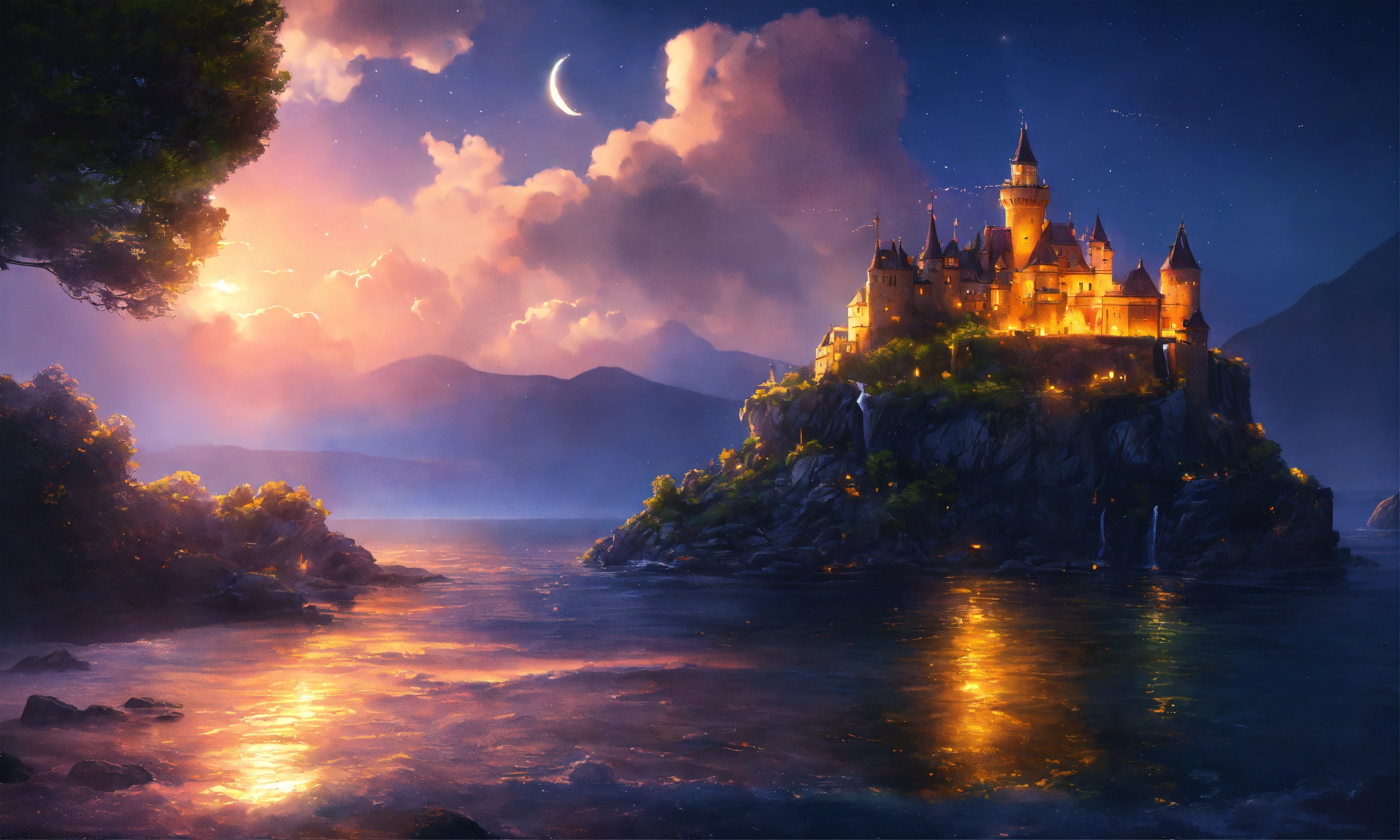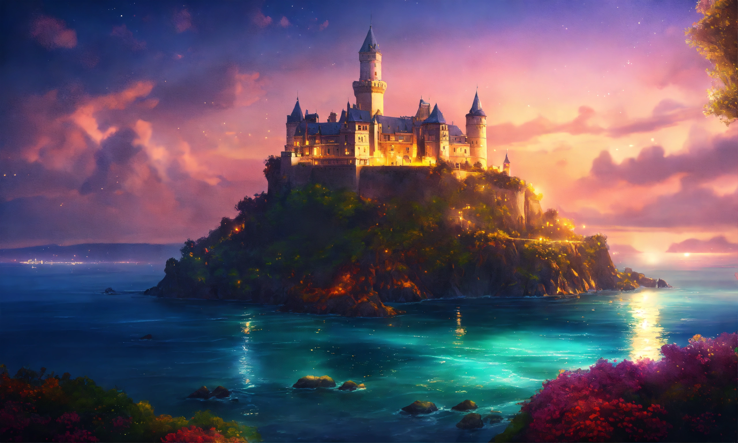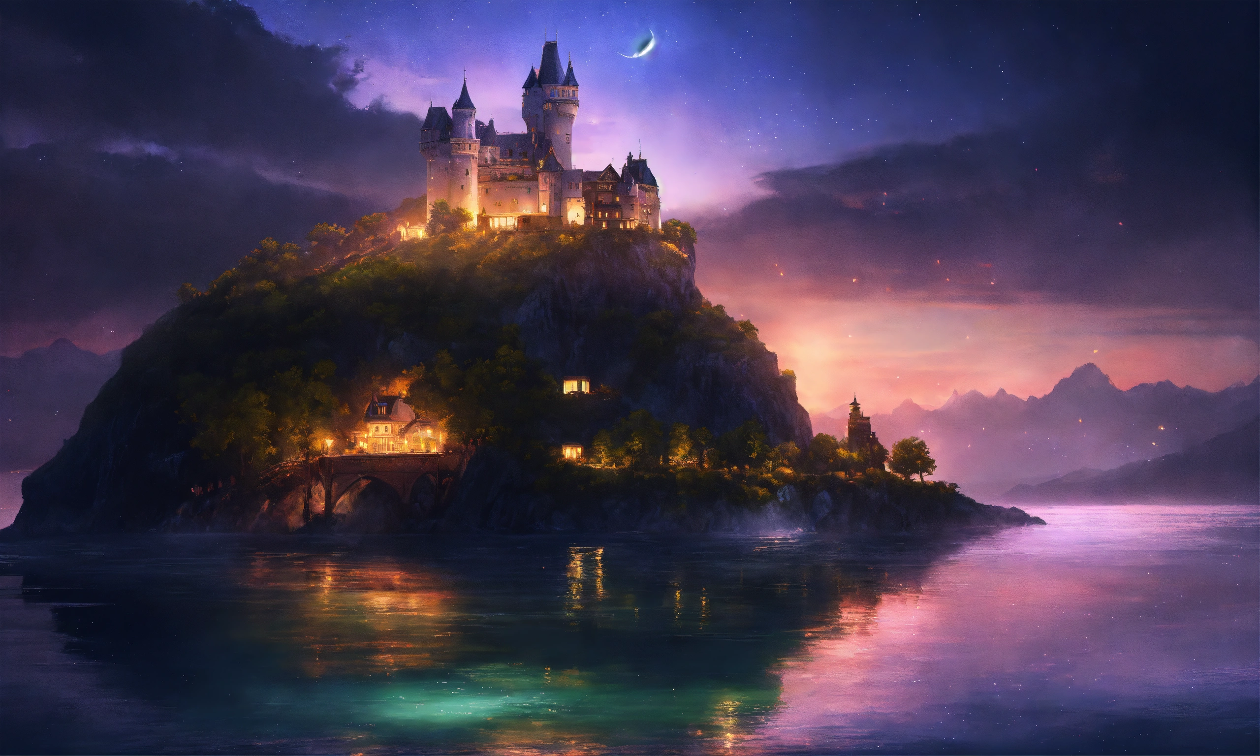 Epic shot of a ultra sea with a castle on a island, ultra cozy and inviting, wonderful night atmosphere, fairy, luminous, little photorealistic, digital painting, sharp focus, ultra cozy and inviting, wish to be there. very detailed, arty, should rank high on youtube for a dream trip.