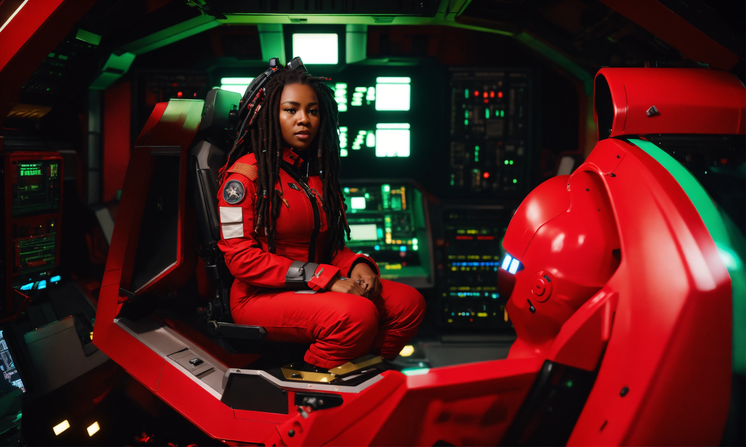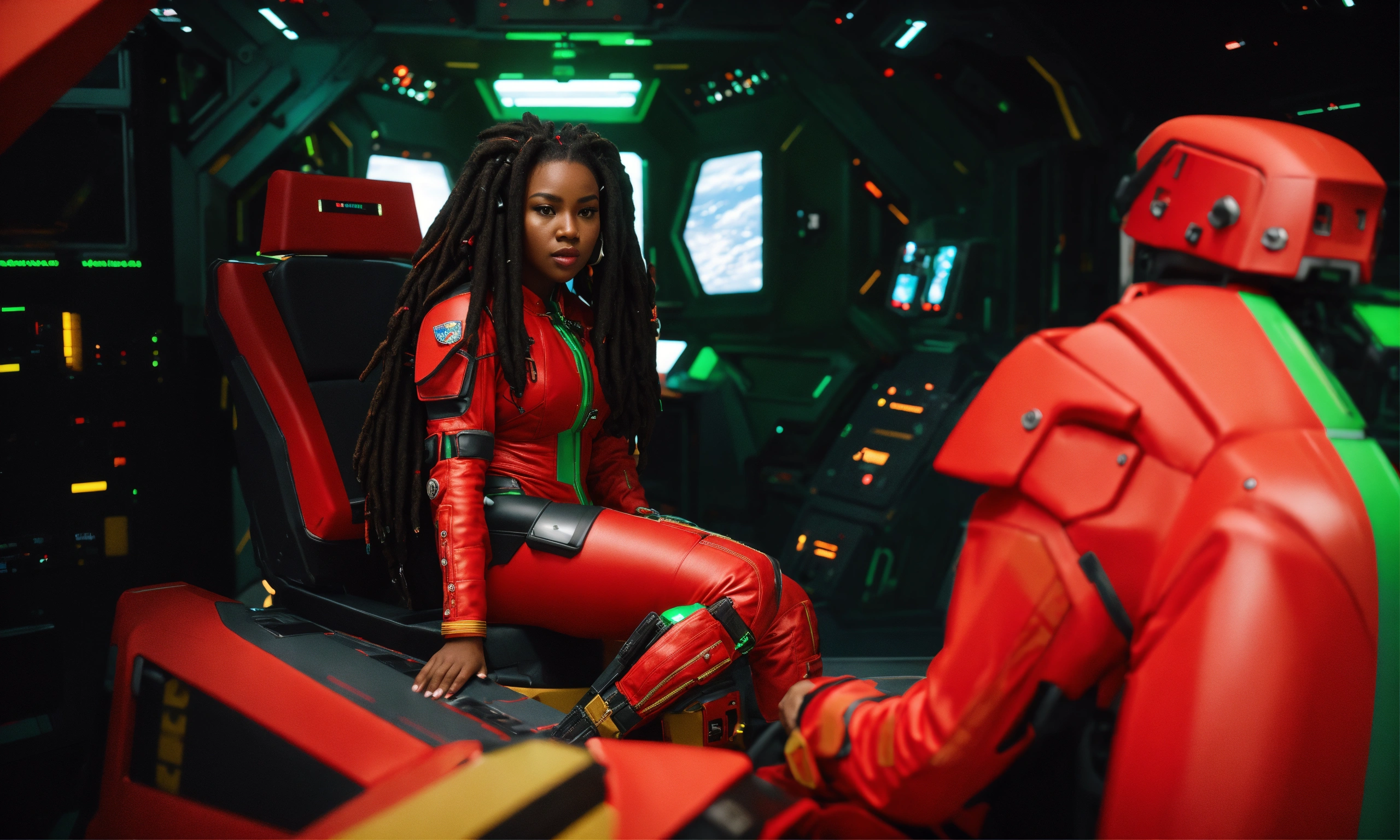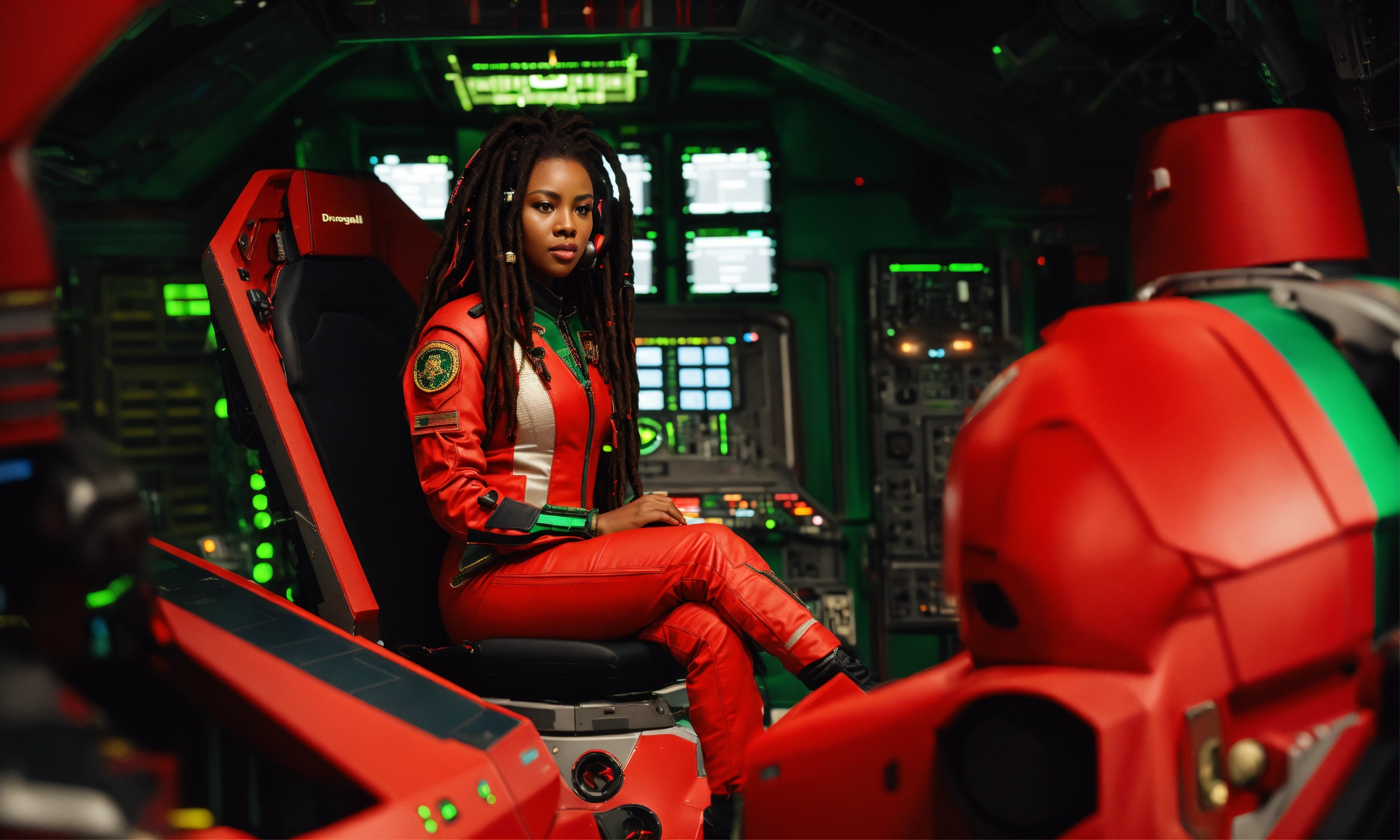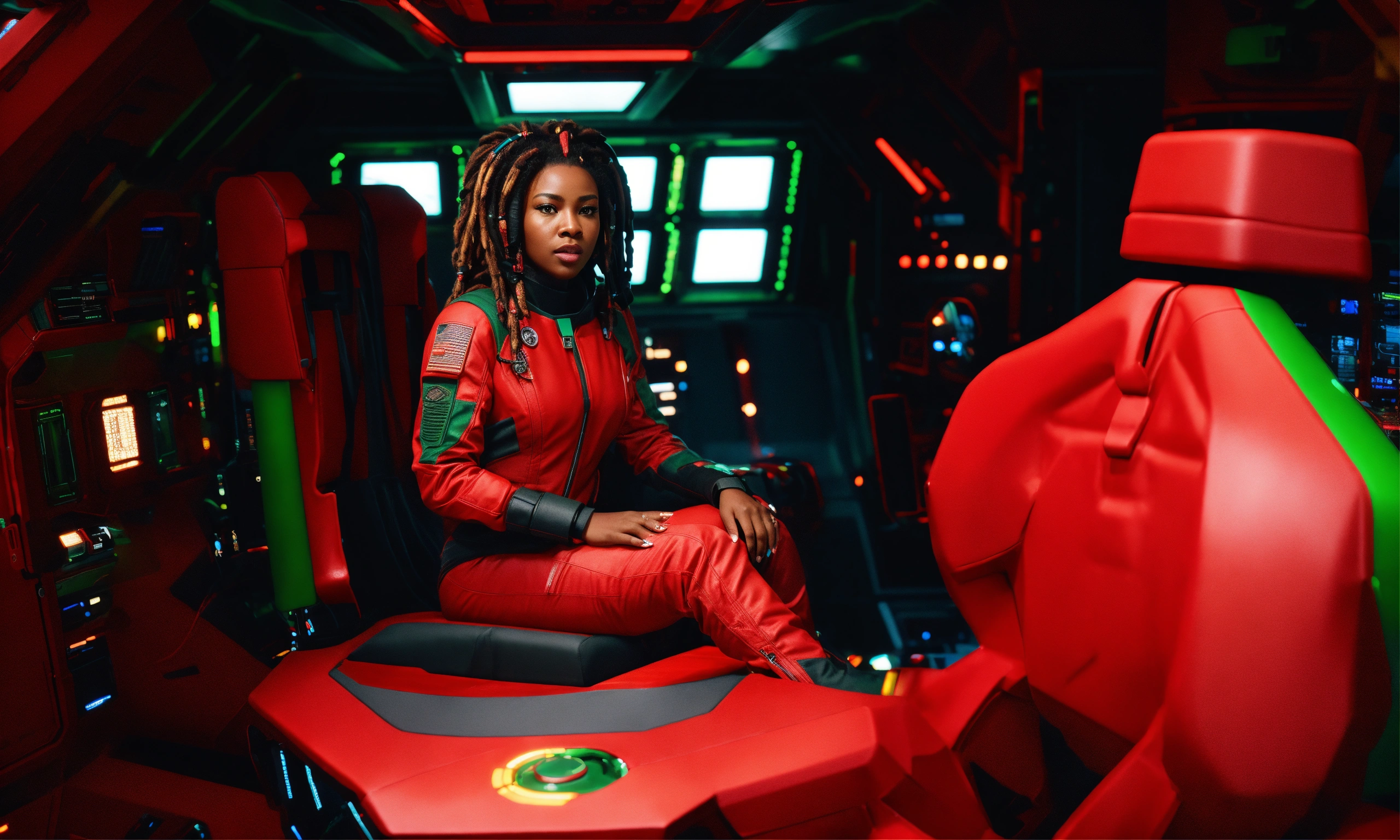 Longshot, full shot, extreme wide shot, full body view of beautiful, beautiful black woman with black dreadlocks, full figured physique, wide hips, large thighs, all natural, as a military starship commander sits in a tight red, green, and black futuristic flight suit and communications headgear at the helm of her spaceship flight deck, insane detail, ultra detail, crisp smooth clean, sharp, hyper realistic, reflection, ray tracing, movie still, particle effects, lightning effect, ultra photorealistic + hasselblad h6d + high definition + cinematic + color grading + depth of field + photo-realistic + film lighting + rim lighting + intricate + realism + maximalist detail + very realistic + masterpiece + sharp + rule of thirds, insane detail, octane render, 16k