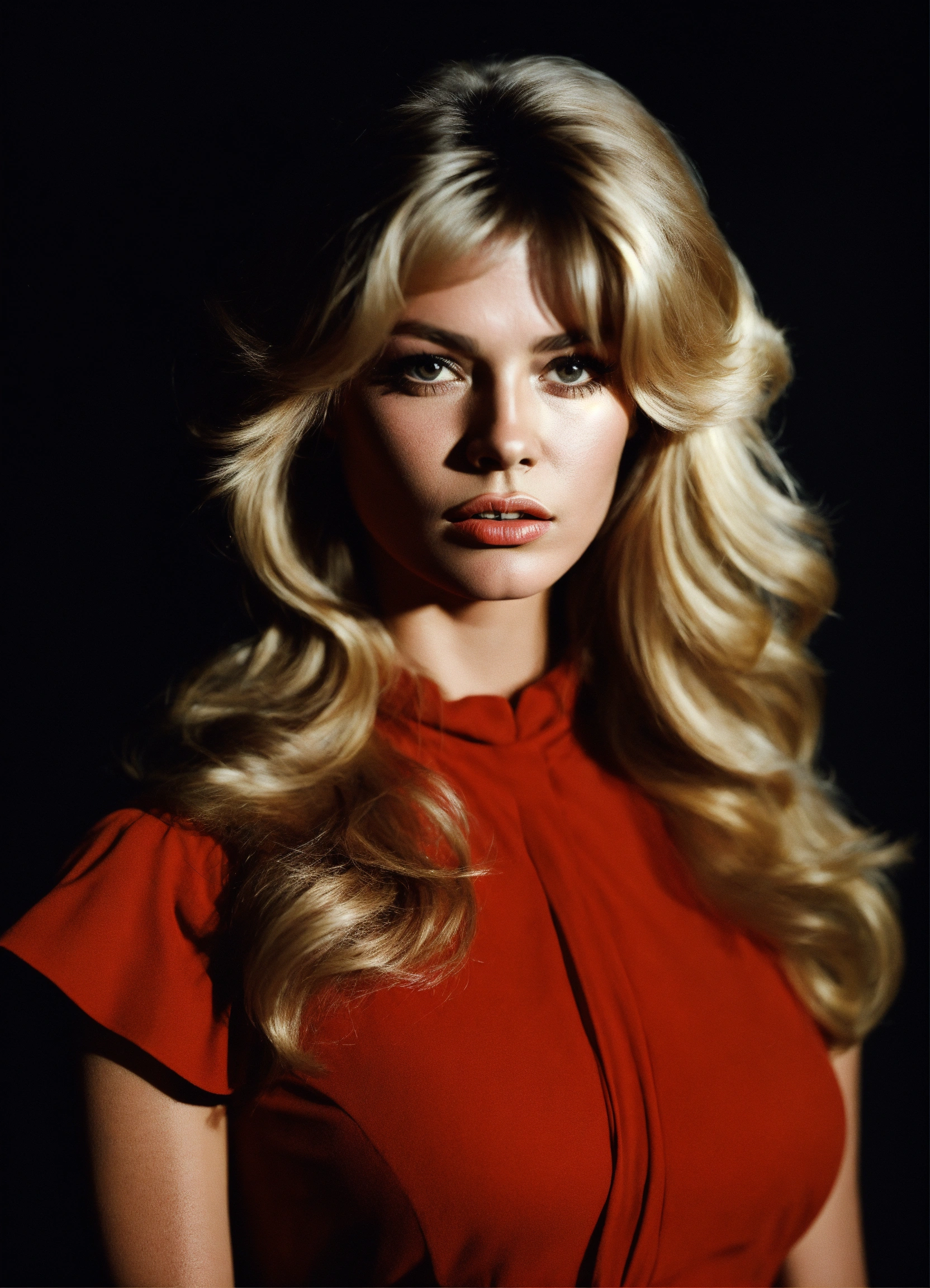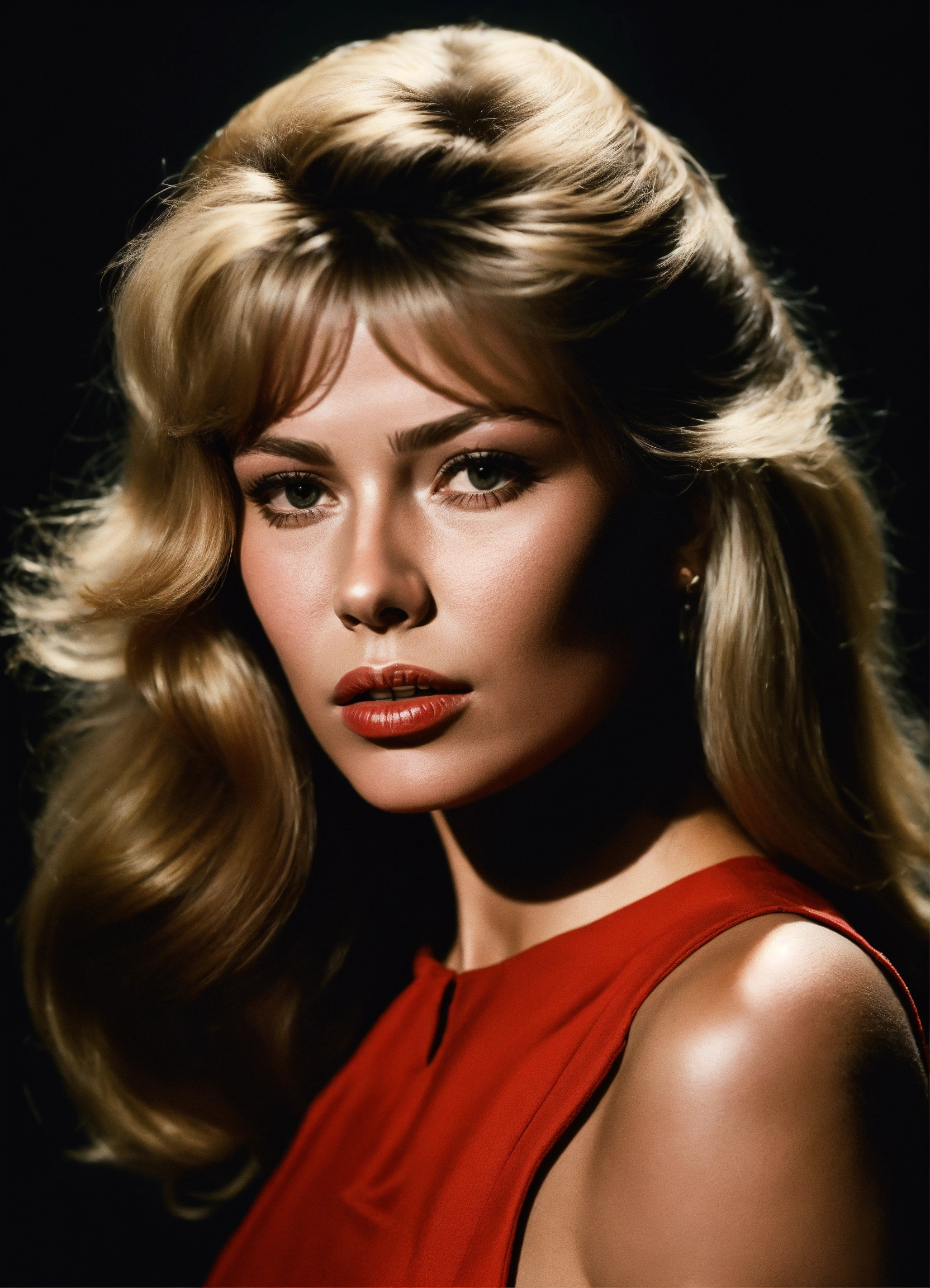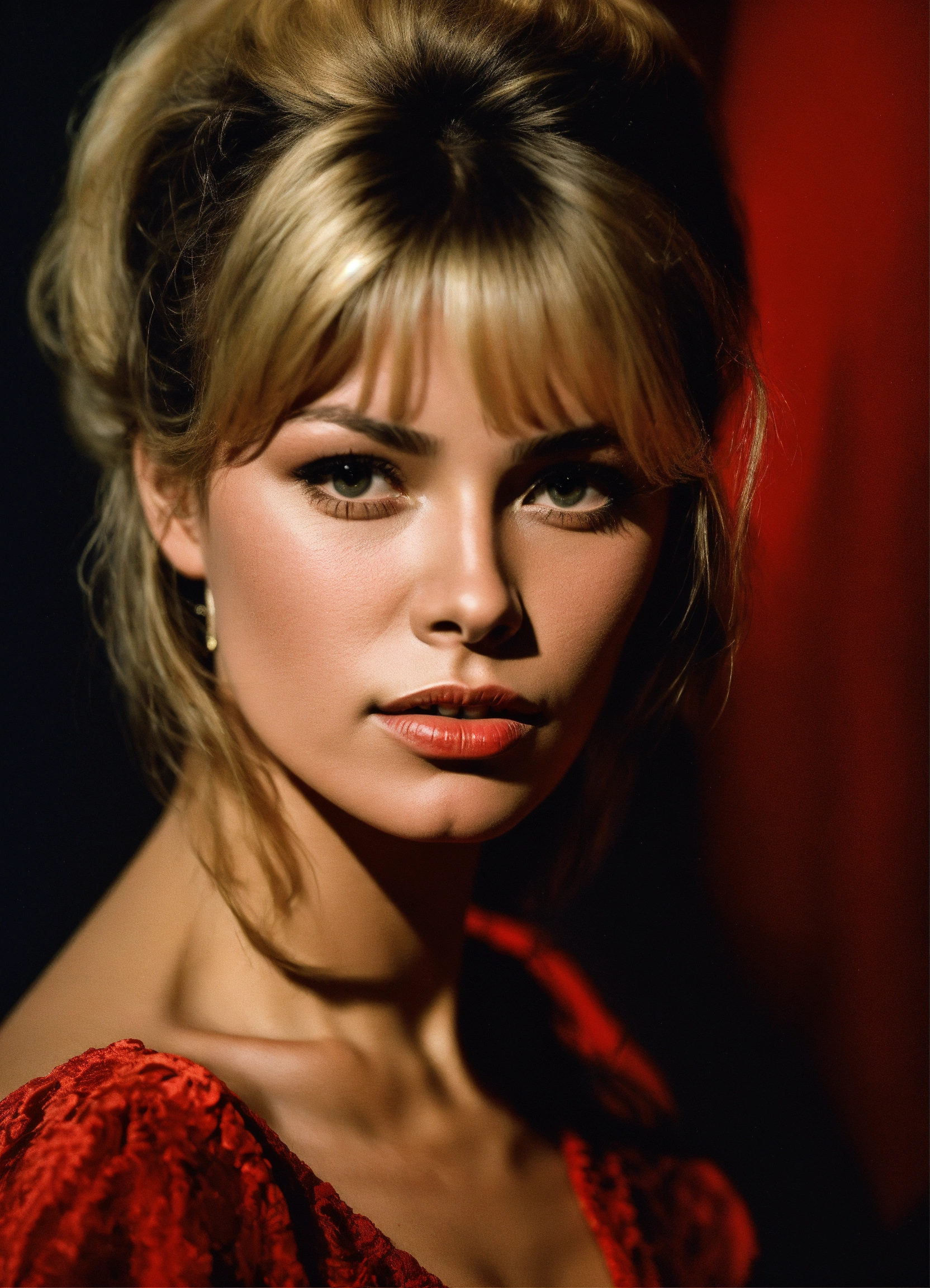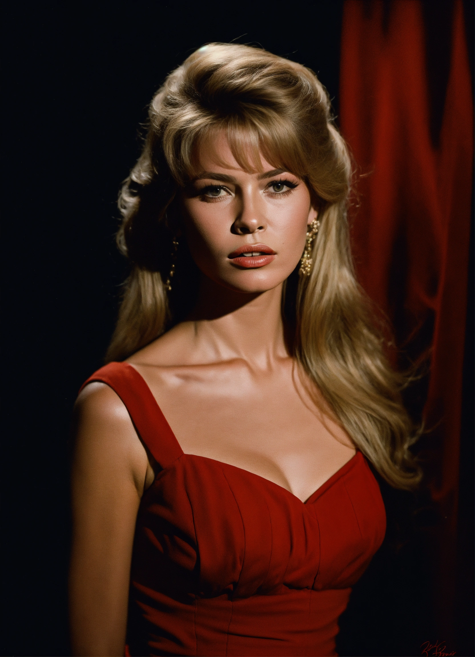 Bust portrait, brigitte bardot young, red dress, black background, harcourt style, dark lighting, realistic, photography