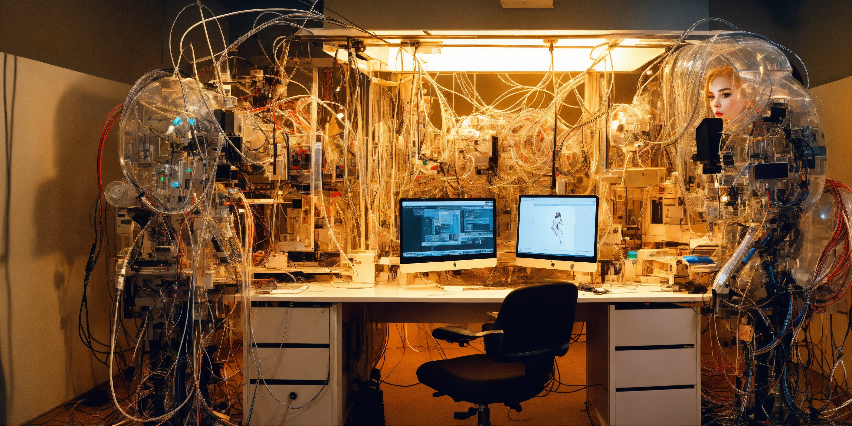 Body face portrait photography, in an office full of cables and wires and led, driving a carbon motor head attractive transparent white plexiglass secretary robots typing, 80 degree view, art by sergio lopez, natalie shau, james jean and salvador dali