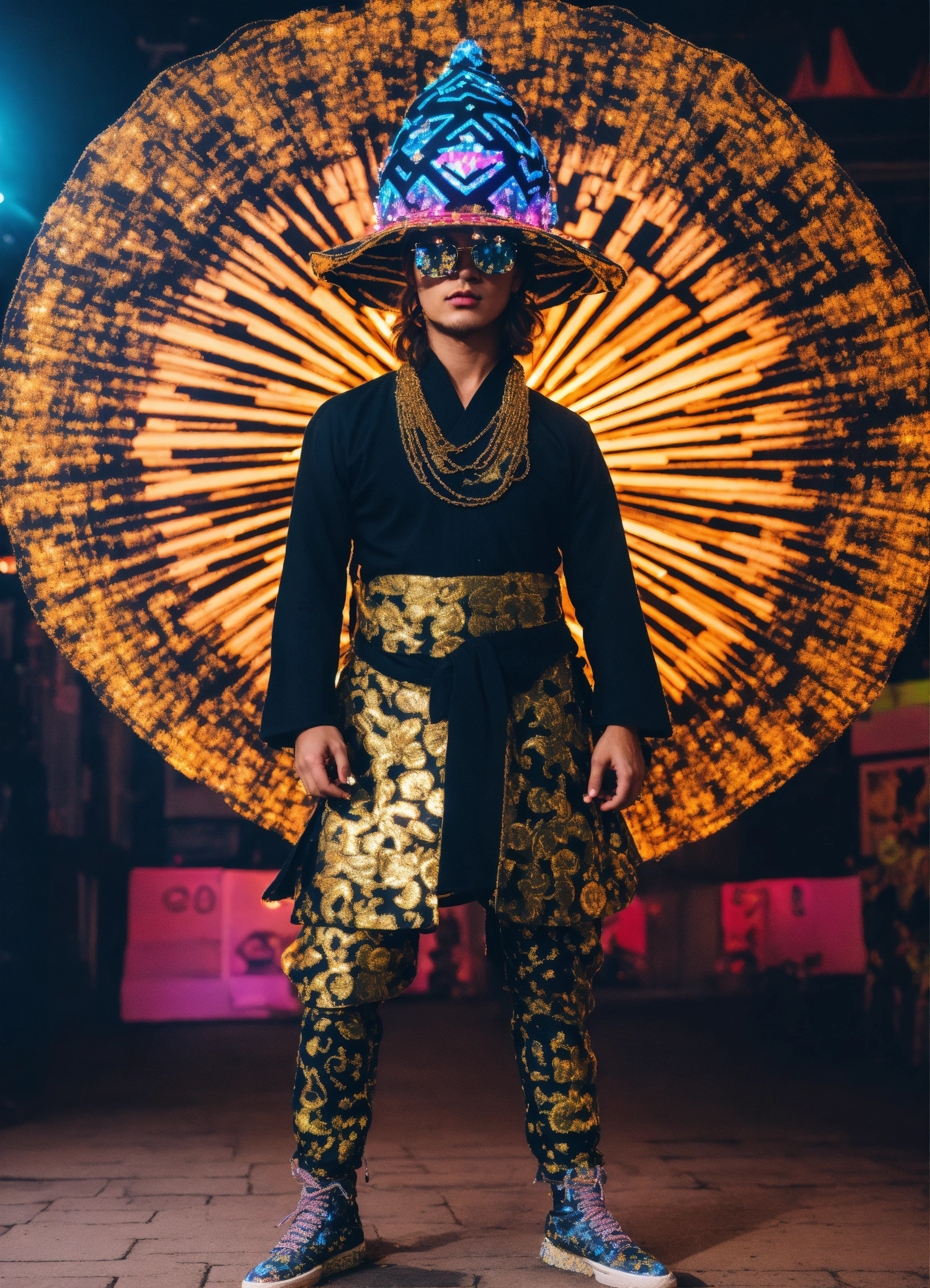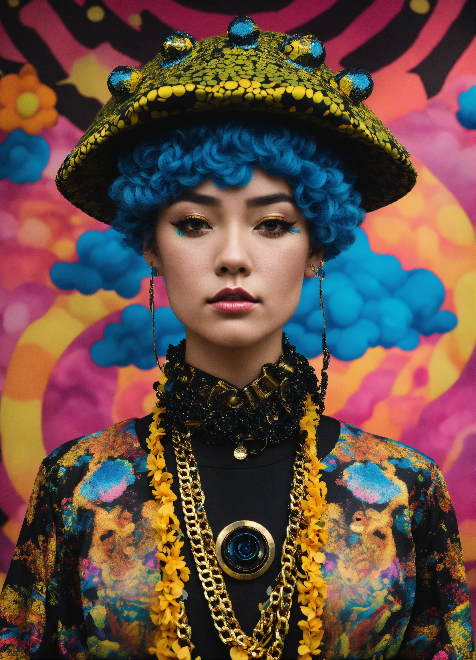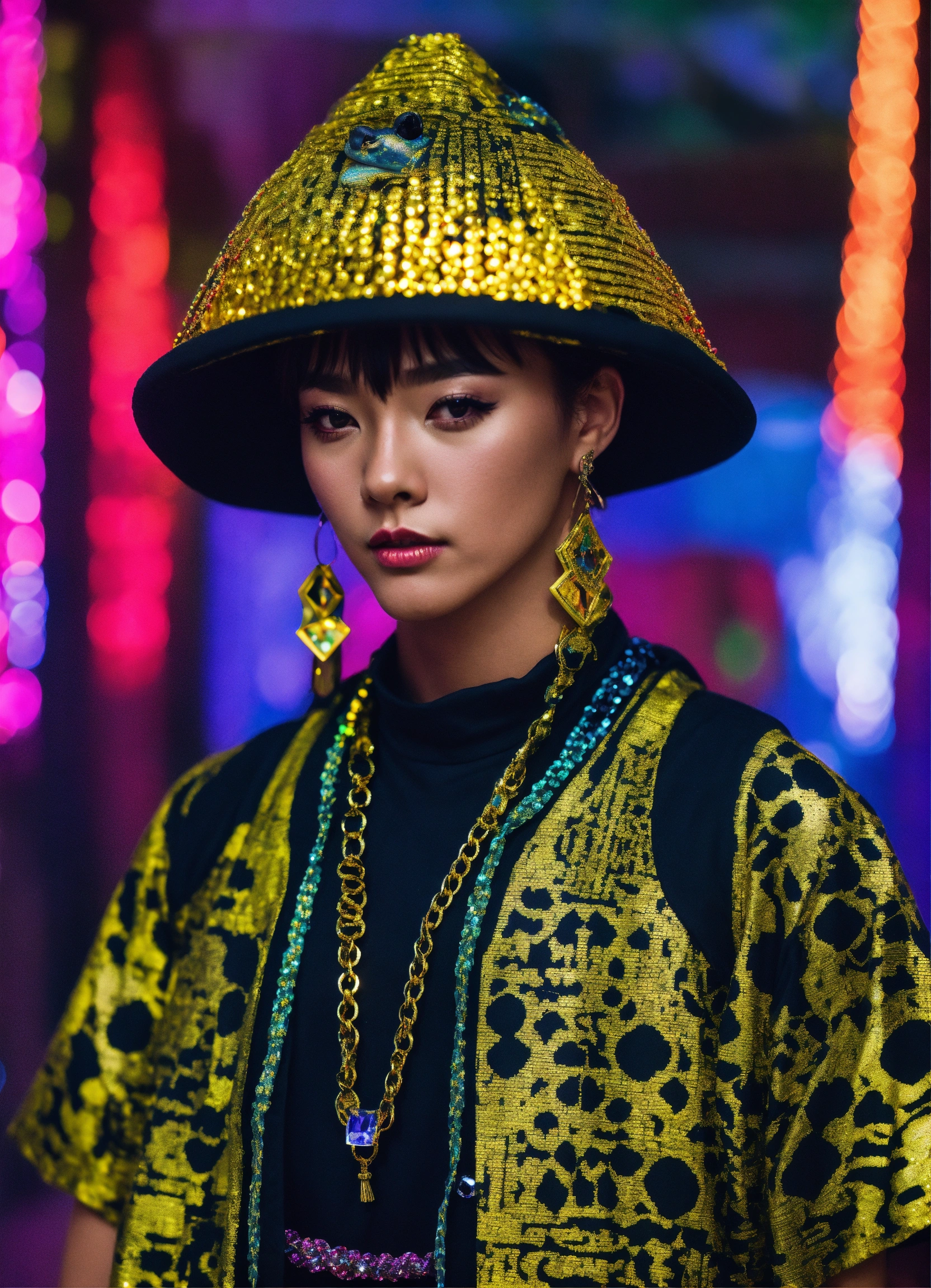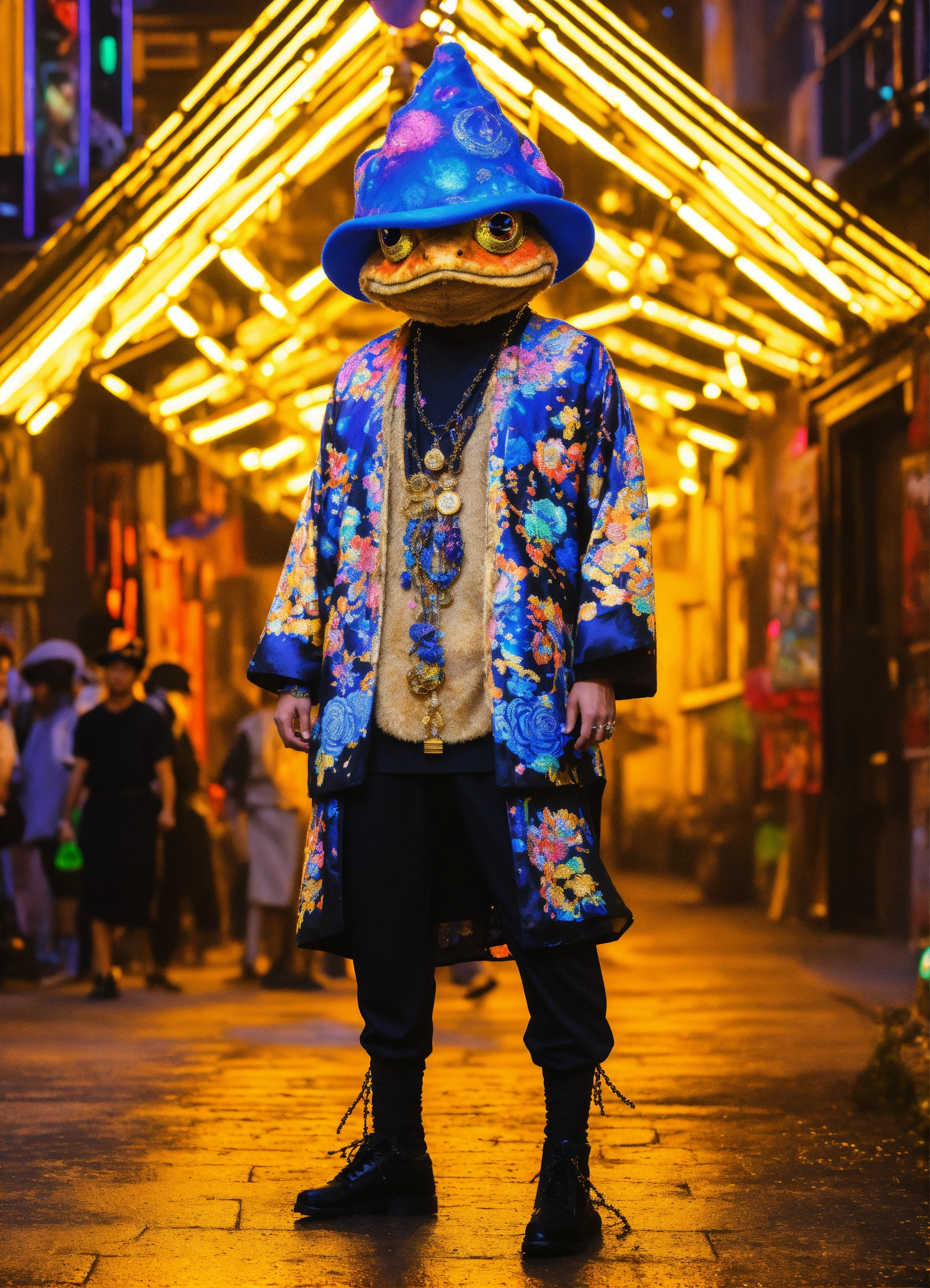 Full body portrait a toad made out of a 3d black and sapphire crystal cloud psychedelic patterned light neon optical illusion, festival raver street wear, kawaii hat with crystal hemp gold black chains, ninja qr code samurai in folk costume in a fashion magazine