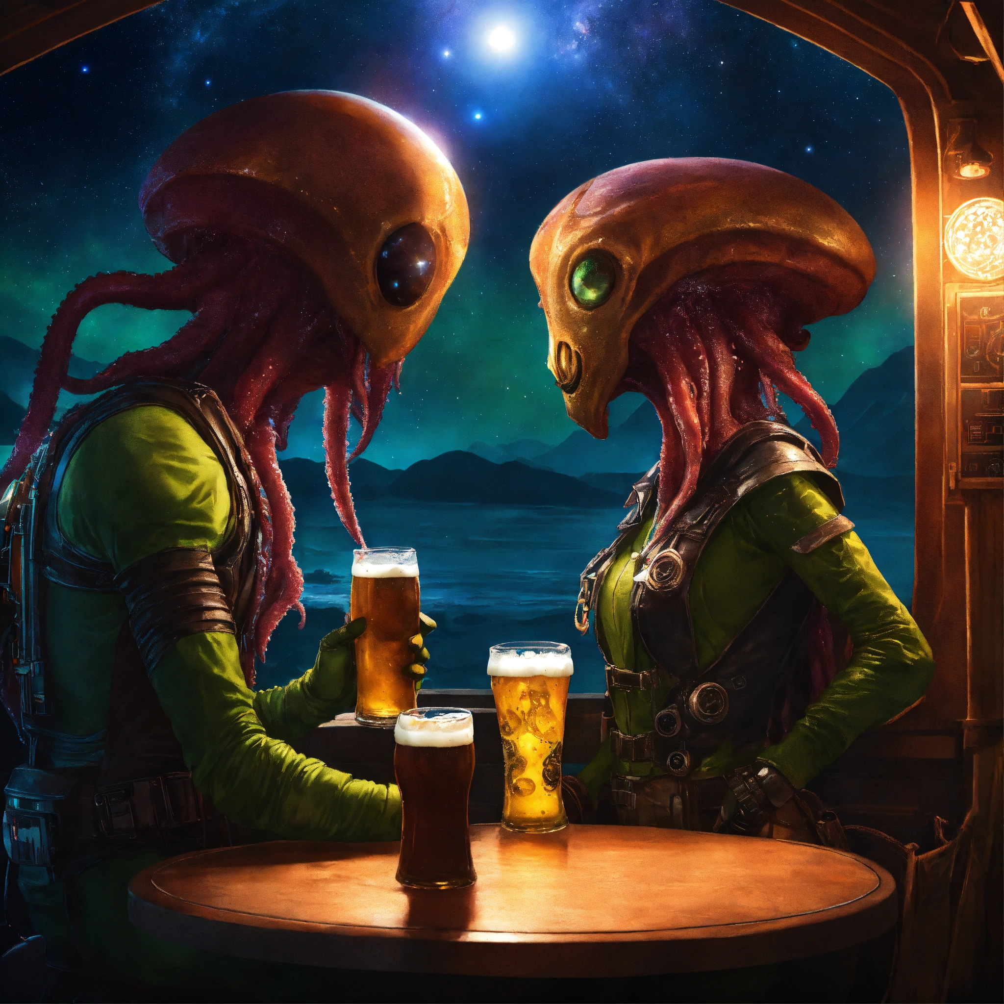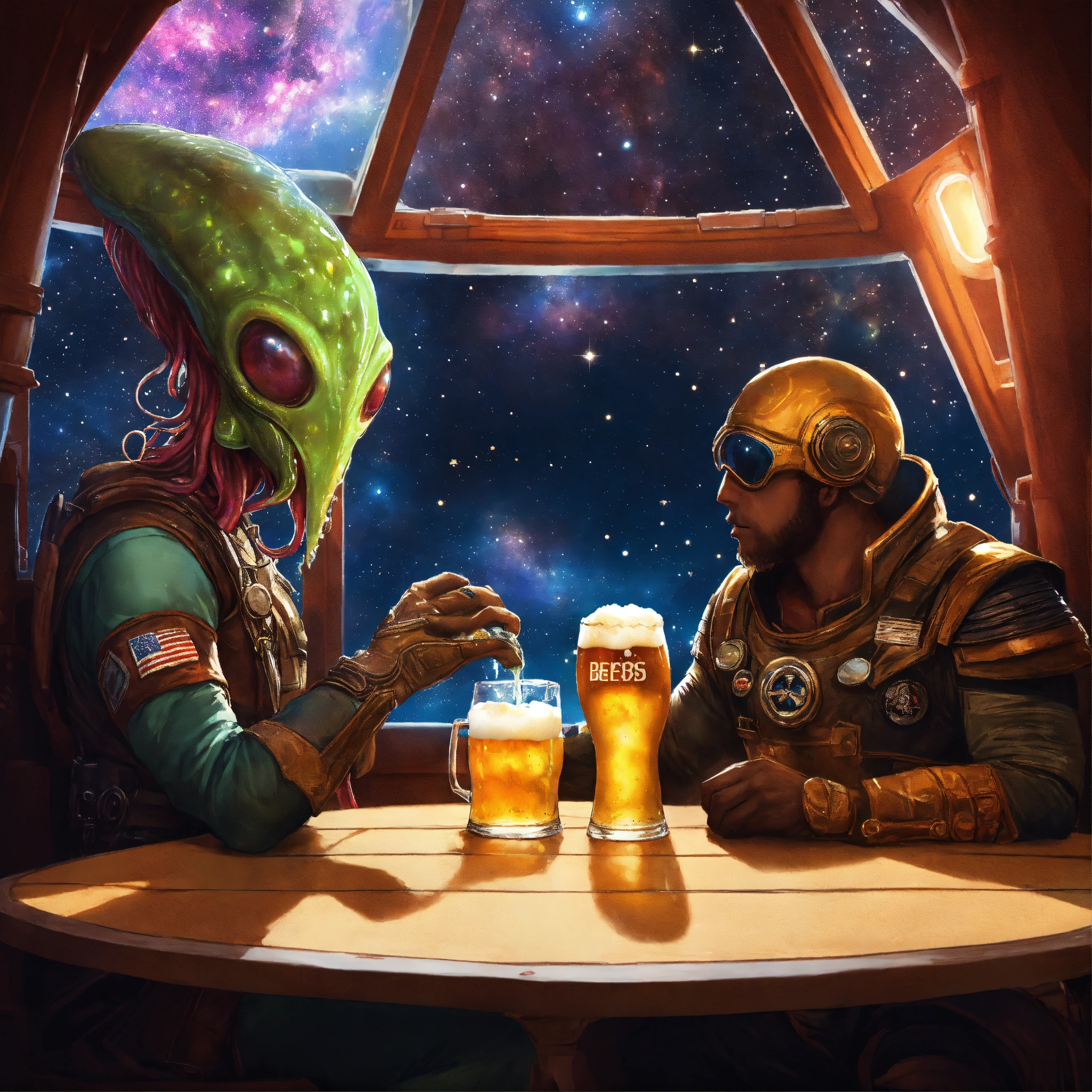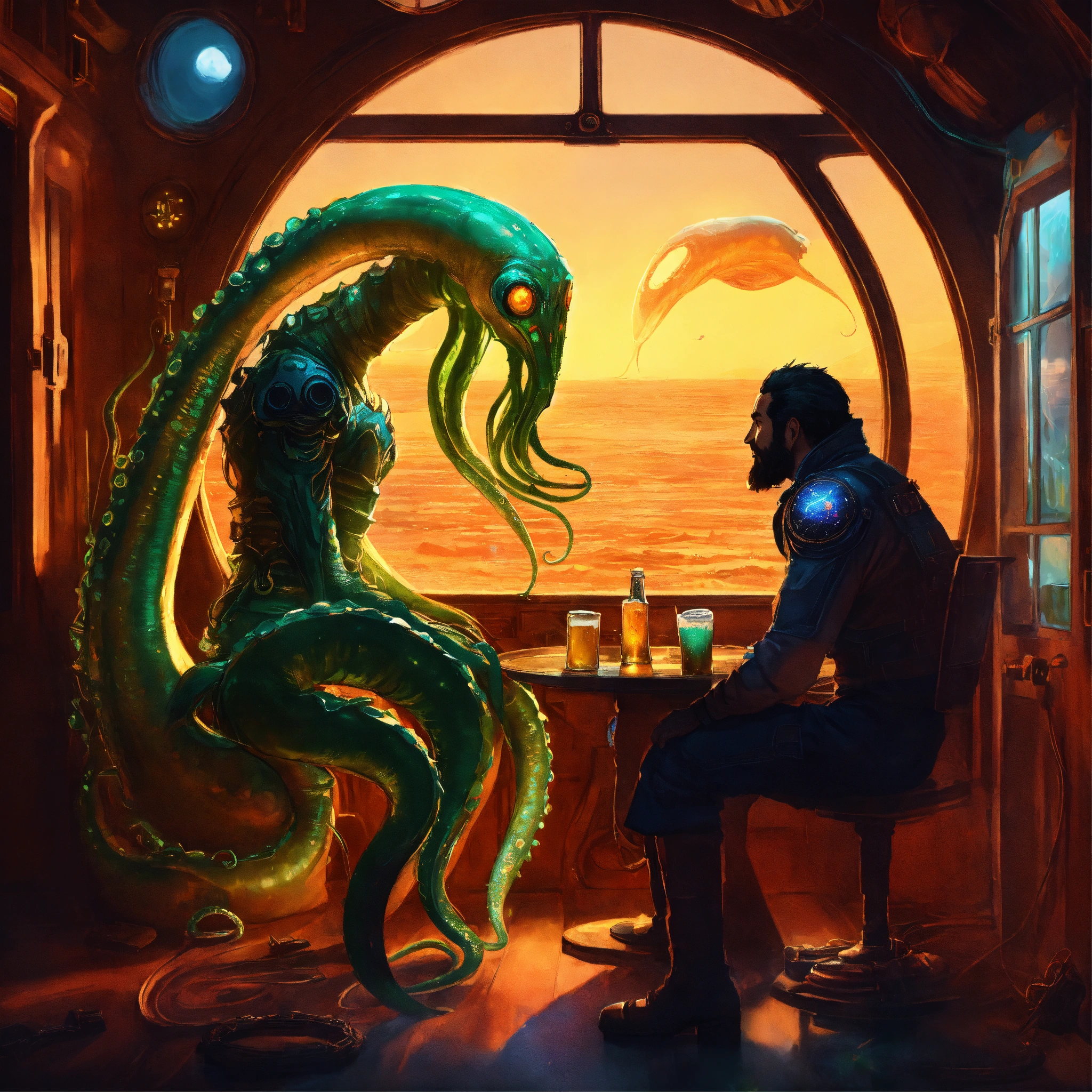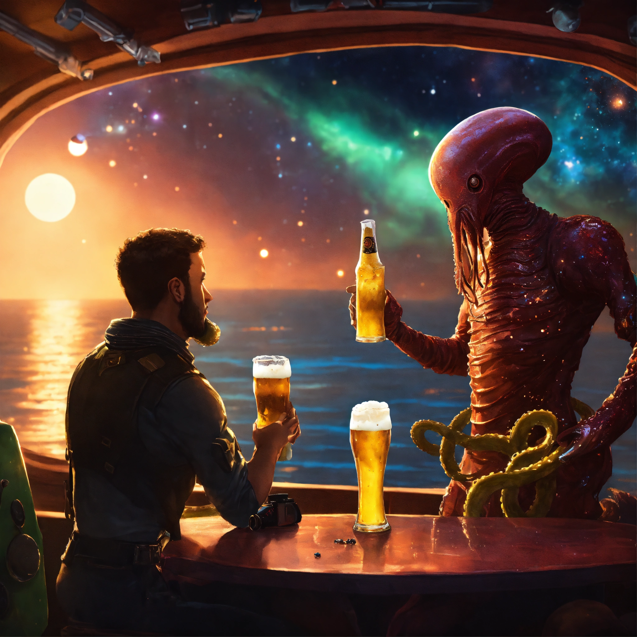 Standing before the dimly lit bay window of their space ship, a massive, tentacled alien and a scrappy human space pirate share a moment of camaraderie over a cold glass of beer, gazing out at the stunning expanse of a solar galaxy.