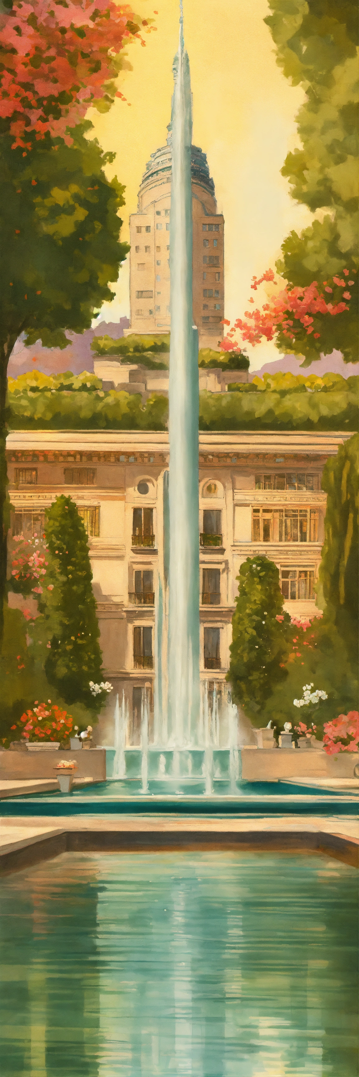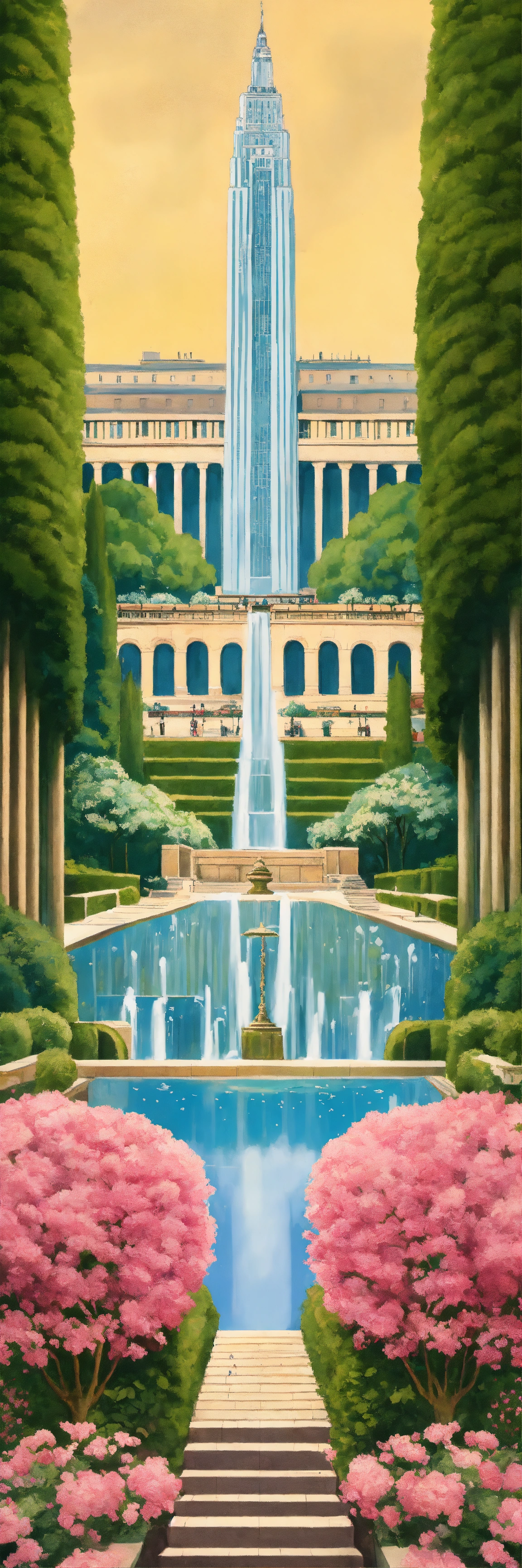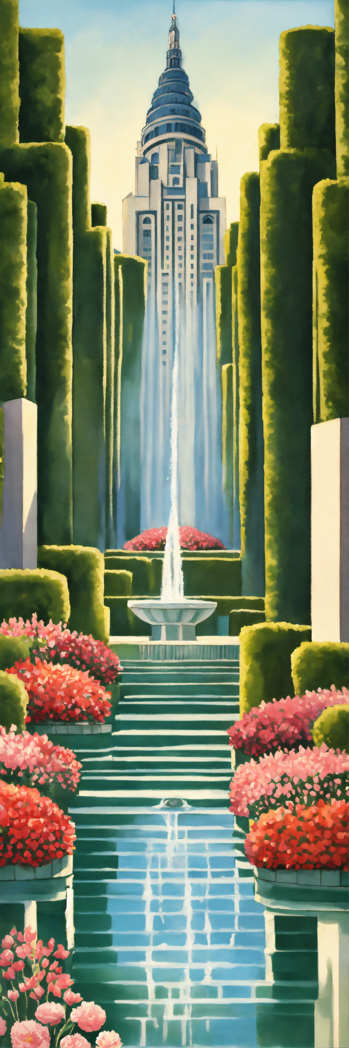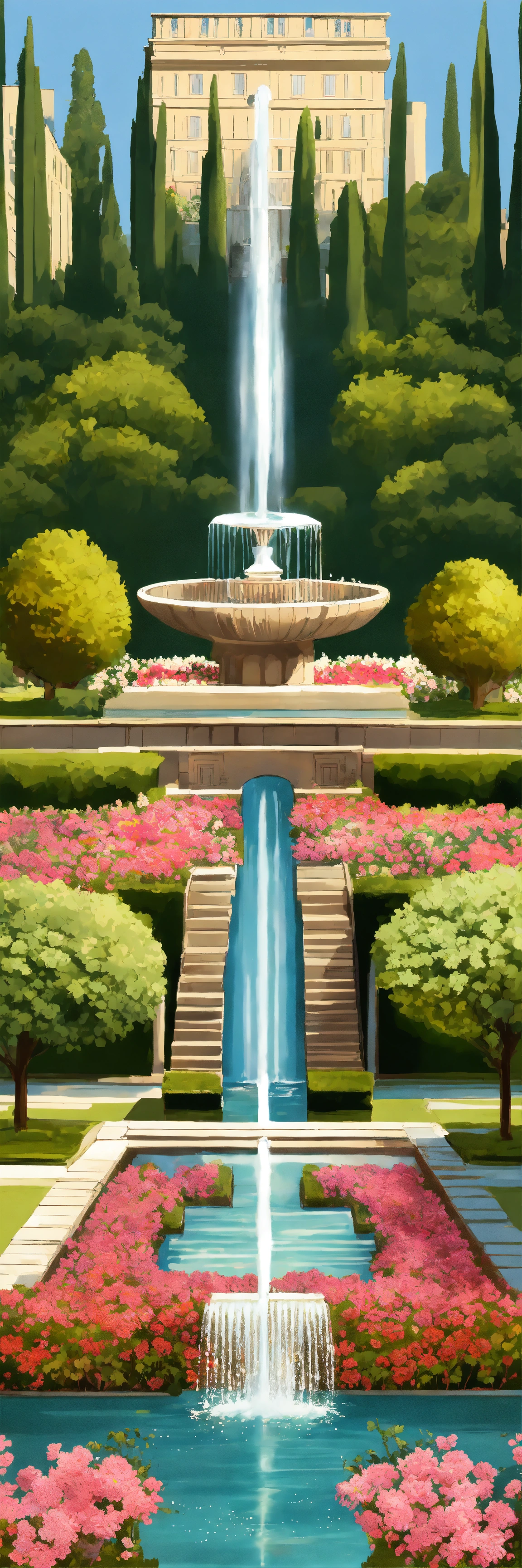 Water falls, the geneva water fountain jet d’eau, cypress trees tall, flowers, art deco pattern maze, pool canal, ornade sculpted stone masonry haussmannian parisian style empire state building with french roof tops, hérgé style illustration, symmetrical symmetry, spanish steps staircase, pillers, hanging gardens, bridges