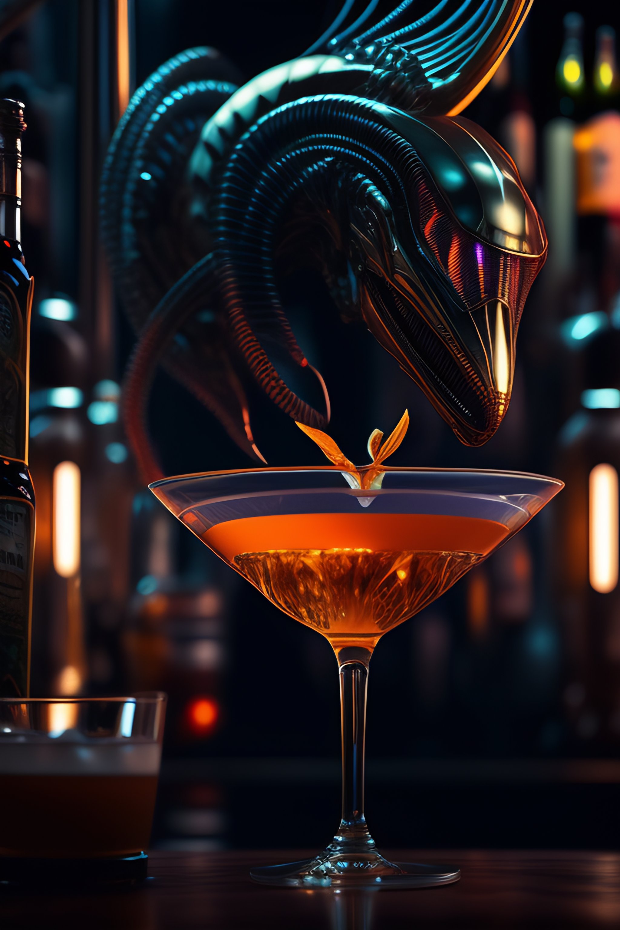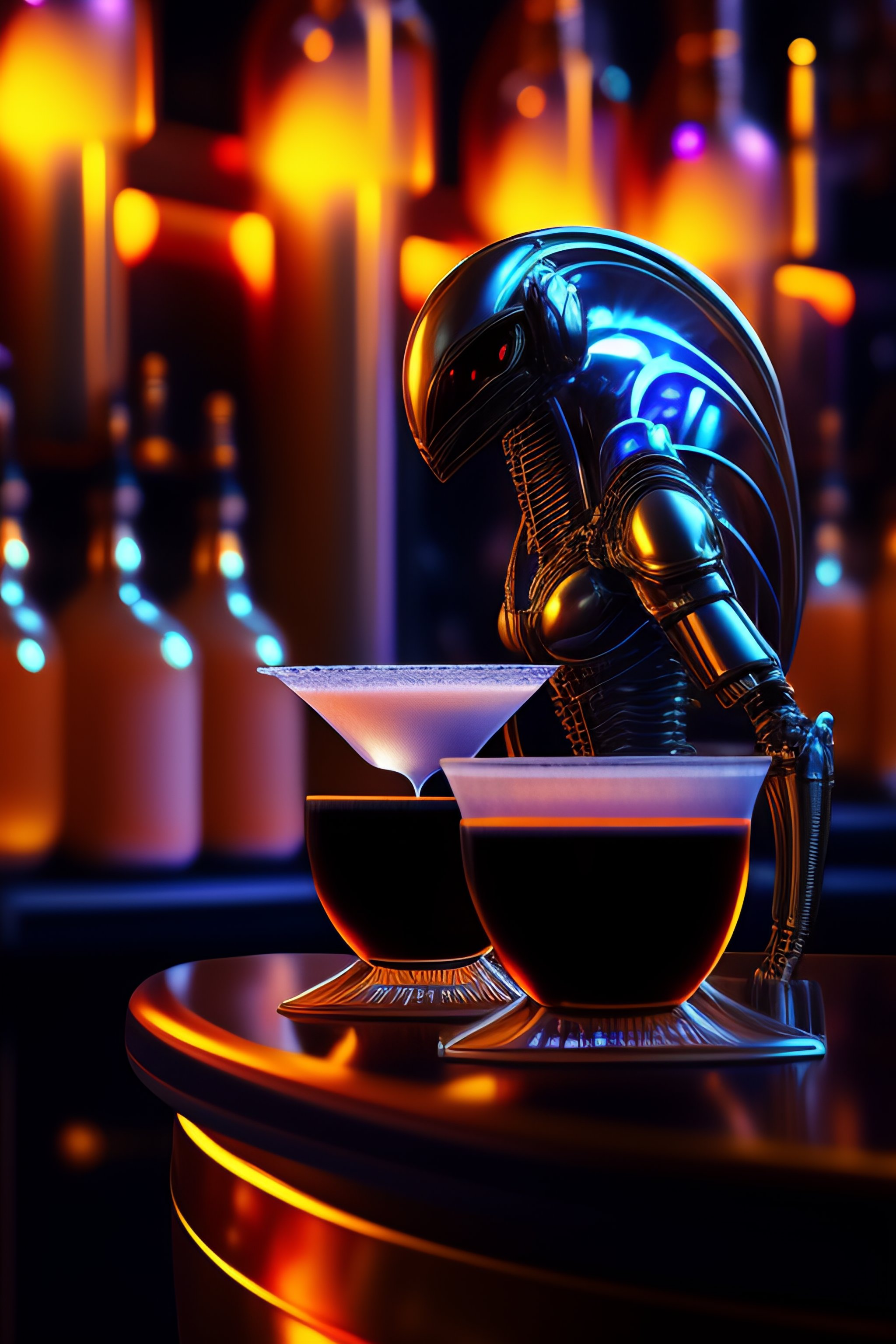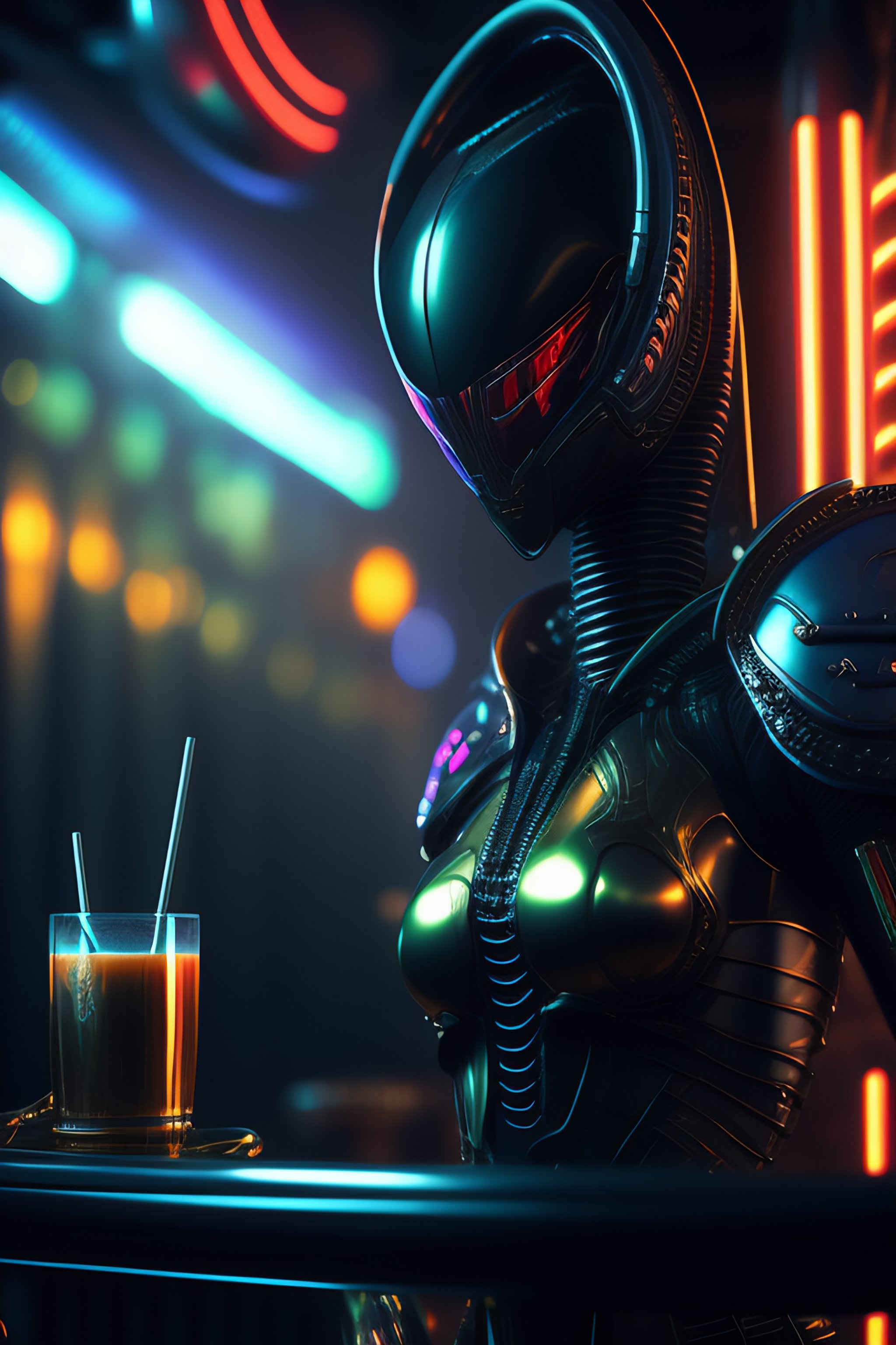Alien and biomechanical drinking cocktails elixir futuristic strong full body cinematic style digital art render with mechanical and futuristic details in a cyberpunk underworld, sci-fi bar, moody atmospheric lighting, techno horror, dangerous, art by yoshiyuki sadamoto and matt banning, batt, directed by roger deakins