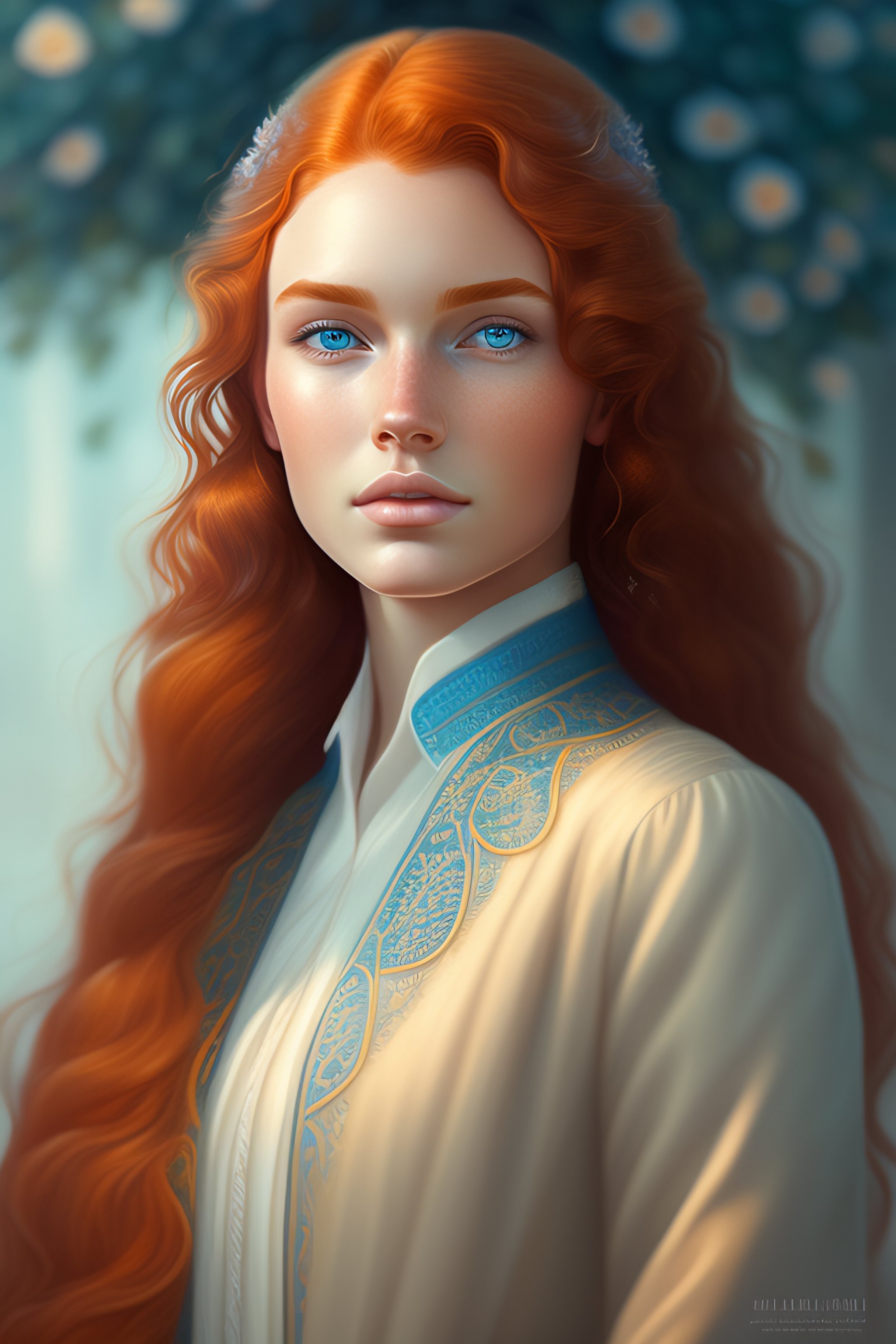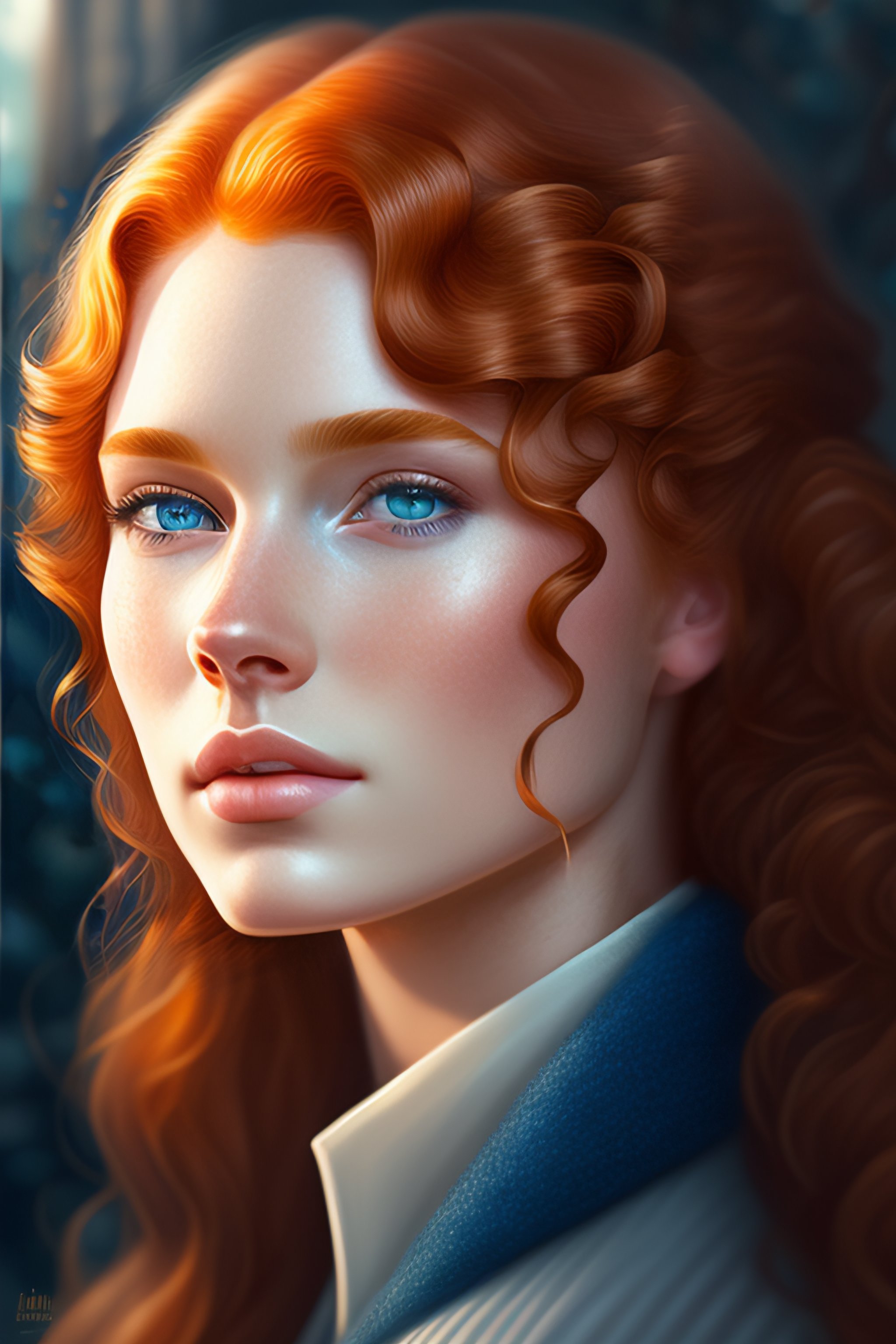 Highly detailed illustration of a natural ginger haired young lady with blue eyes and a sad face, natural beauty, sad face, intricate, sad, elegant, highly detailed, lyly bloom, centered, digital painting, artstation, concept art, smooth, sharp focus, concept art, wlop.