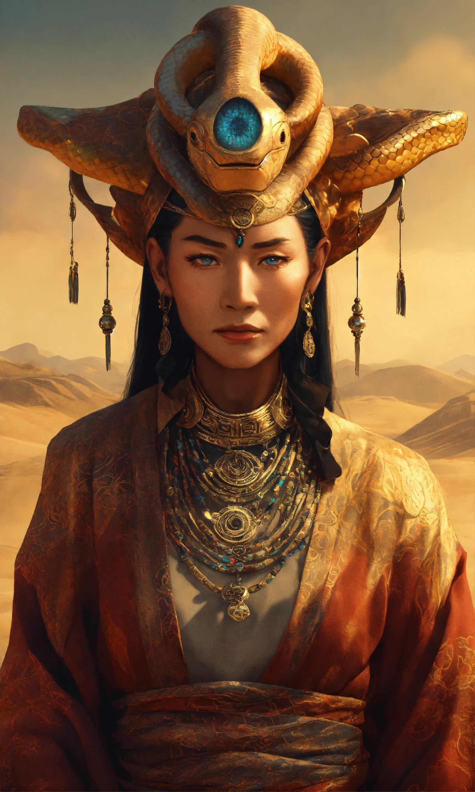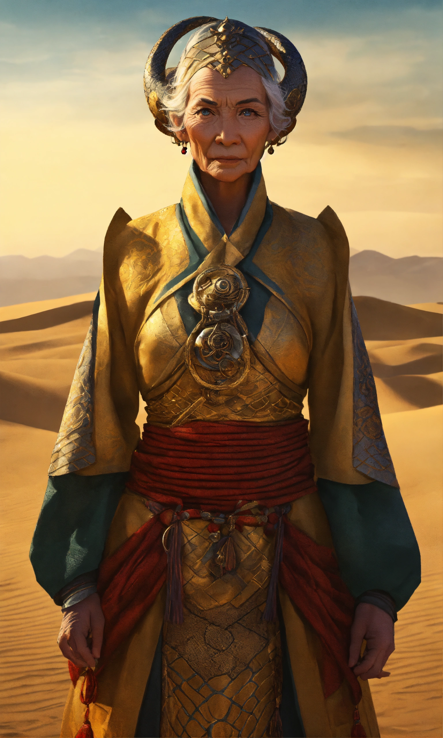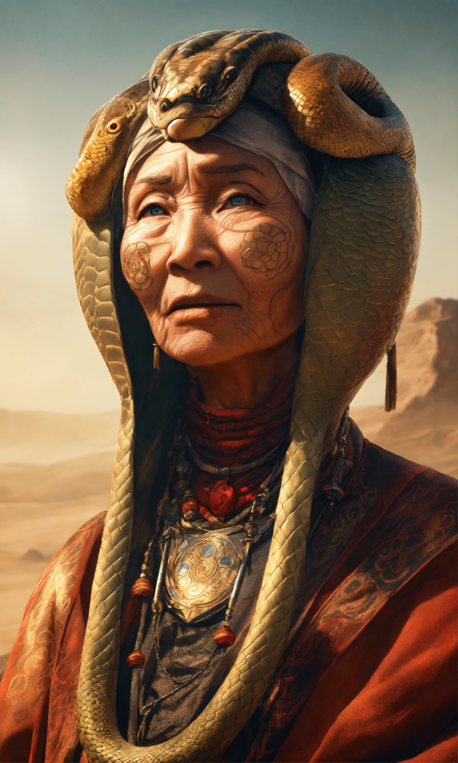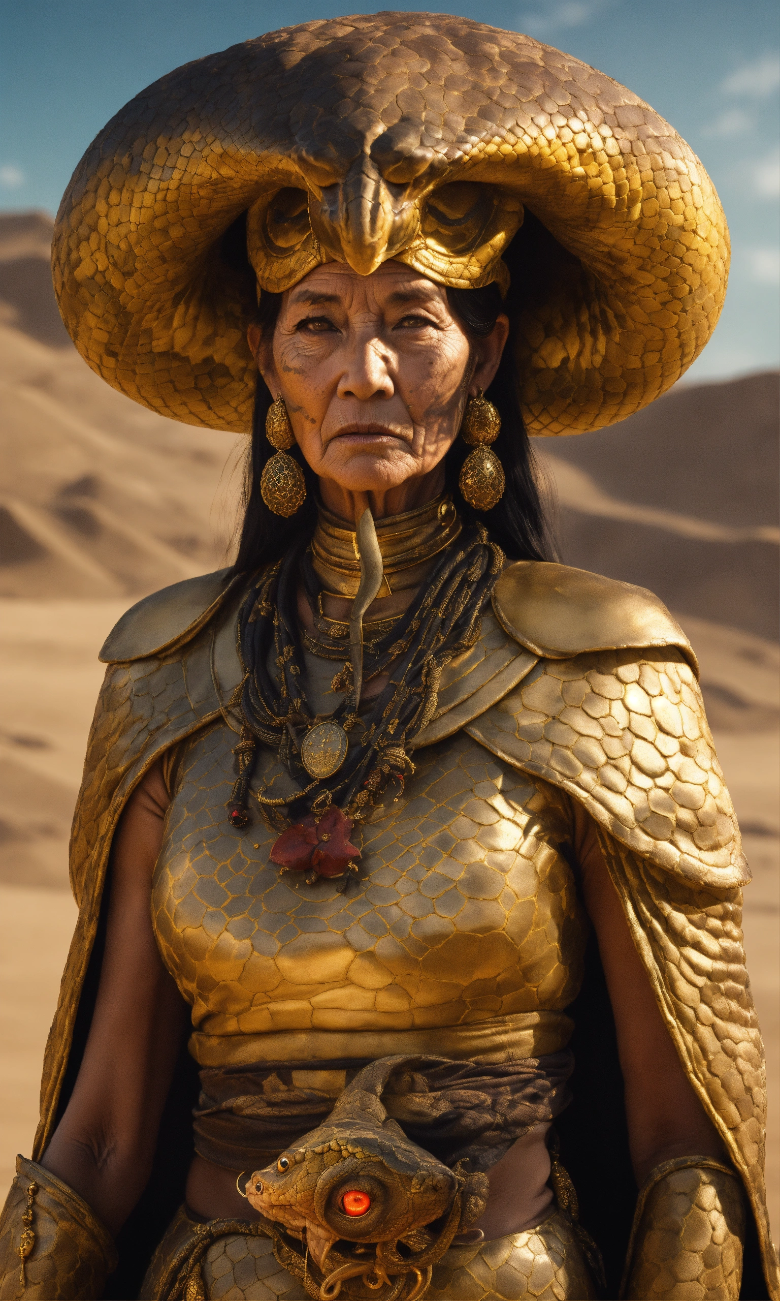 Draw an elderly yuan-ti woman who embodies both the menacing aura of a snake and the cunning intelligence of a humanoid. their eyes should be hypnotic, and their attire should look like it's made for arcane rituals. standing in a desert village, golden ratio, smooth, highly detailed, sharp focus, cinematic, 4k