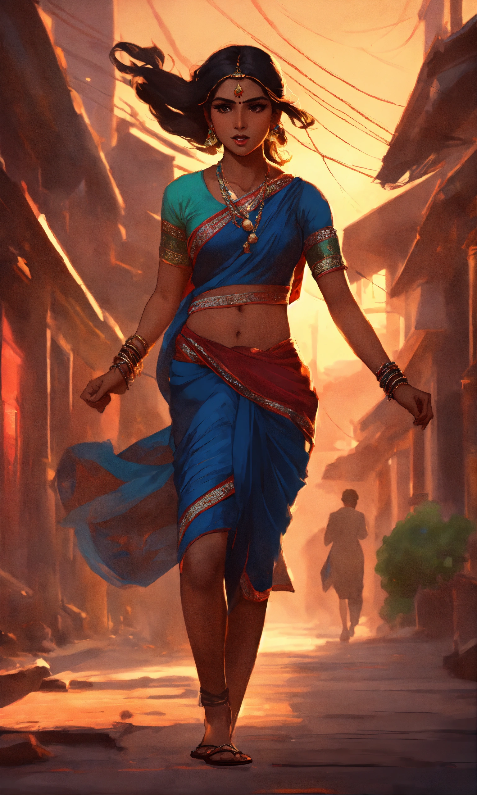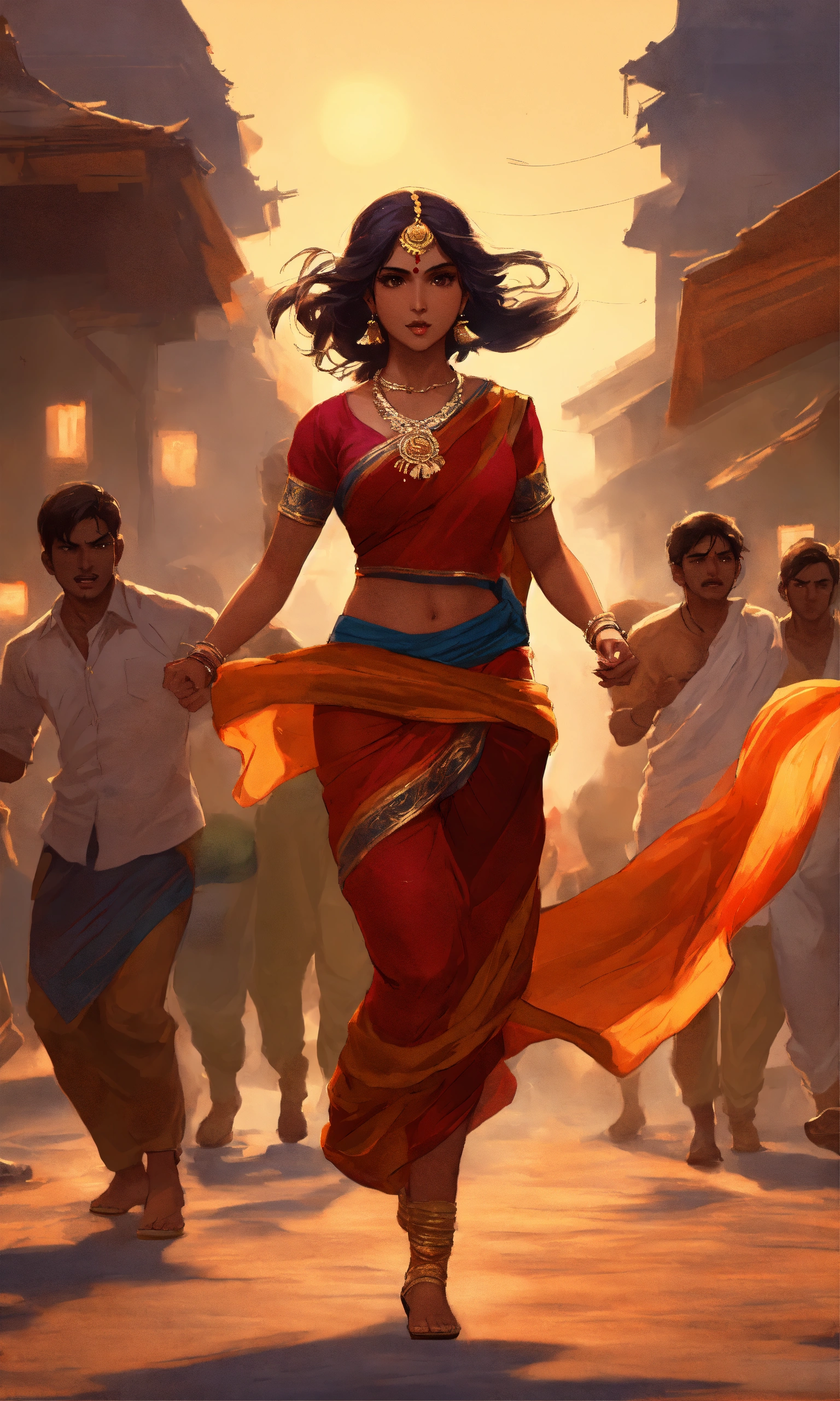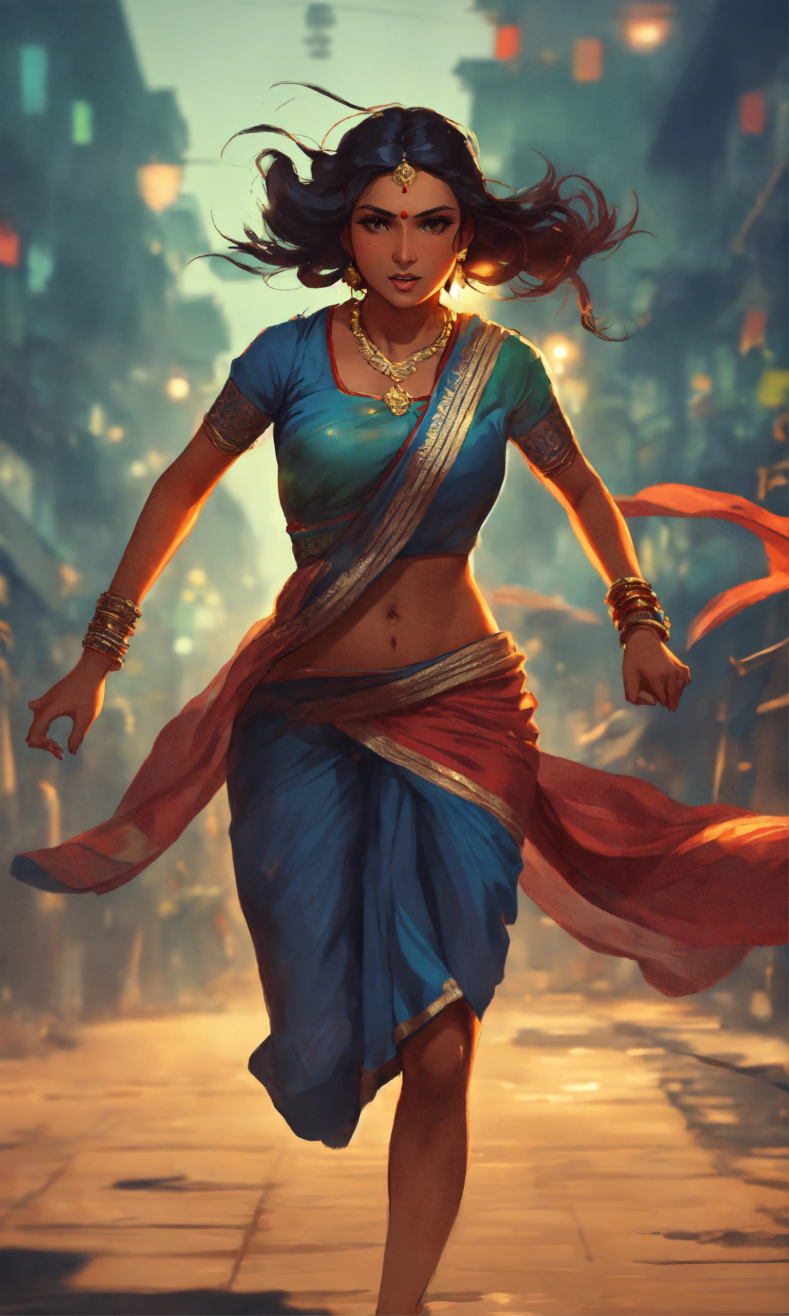 Indian woman, sari, running away, chased by goons, night, 1920, 8k photo, animestyle, by artgerm, trending on artstation