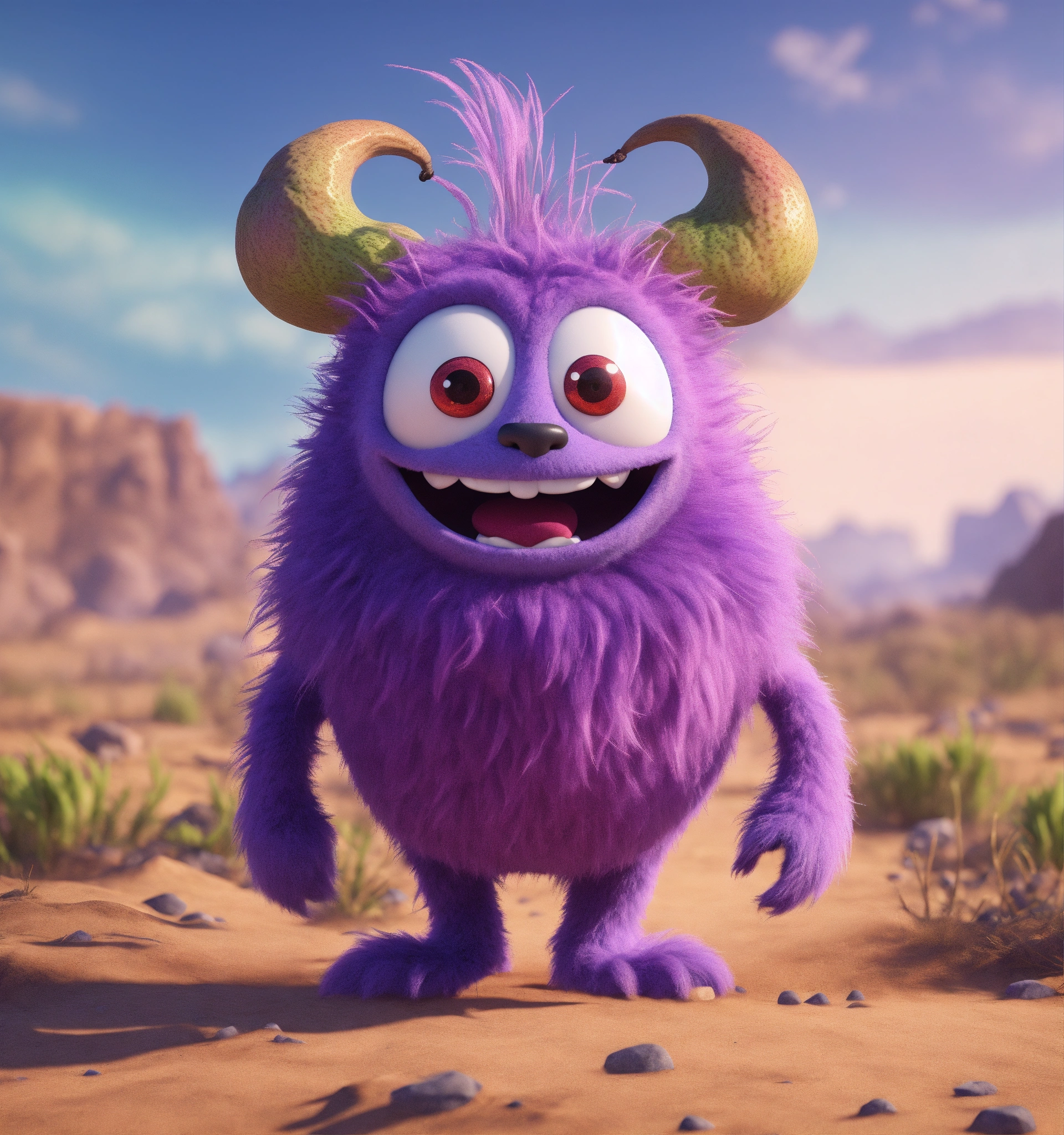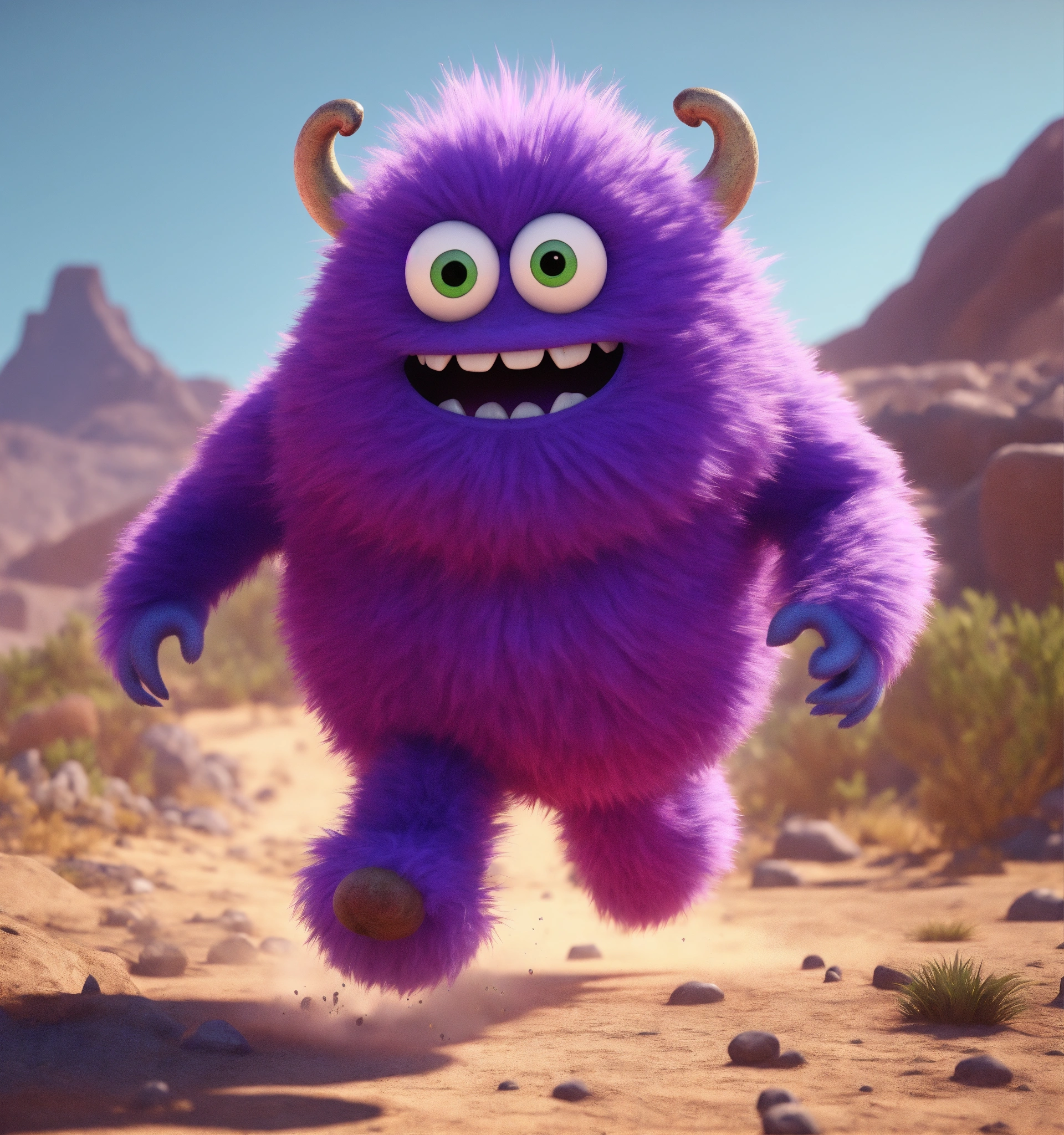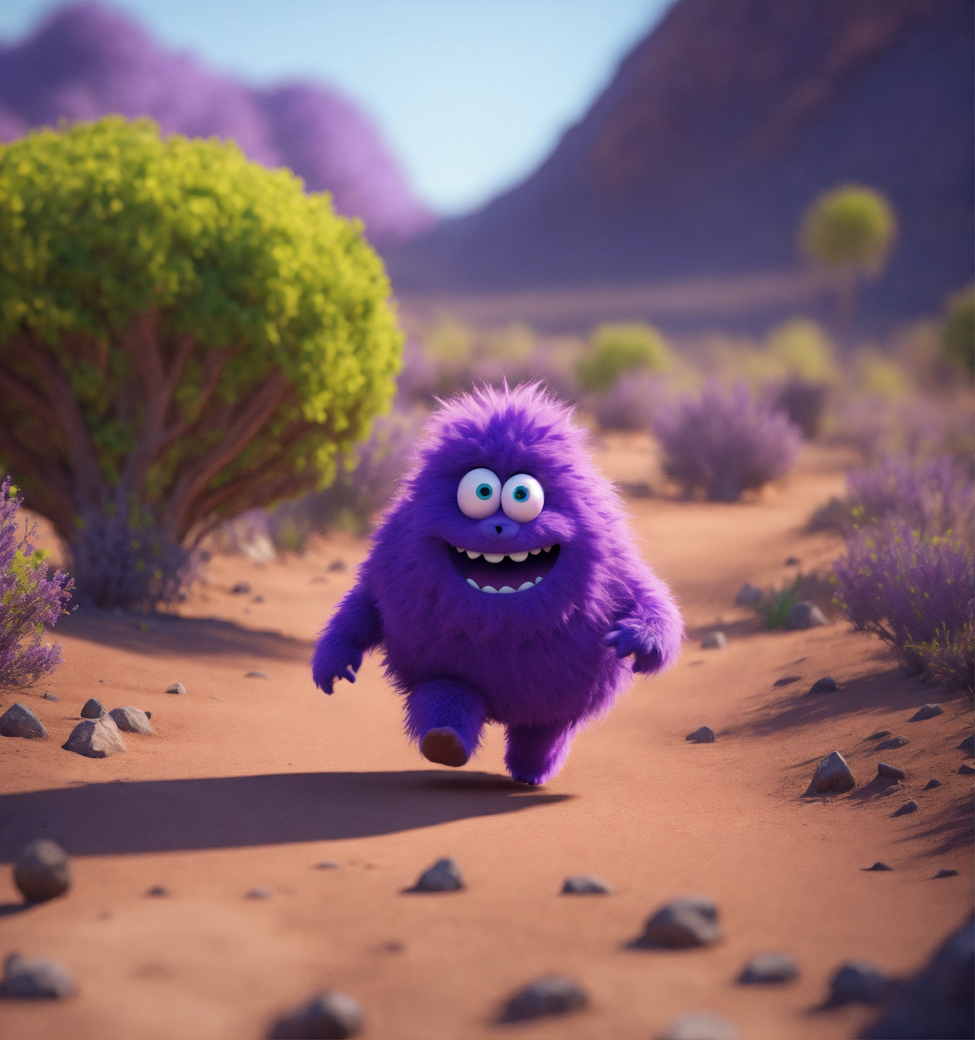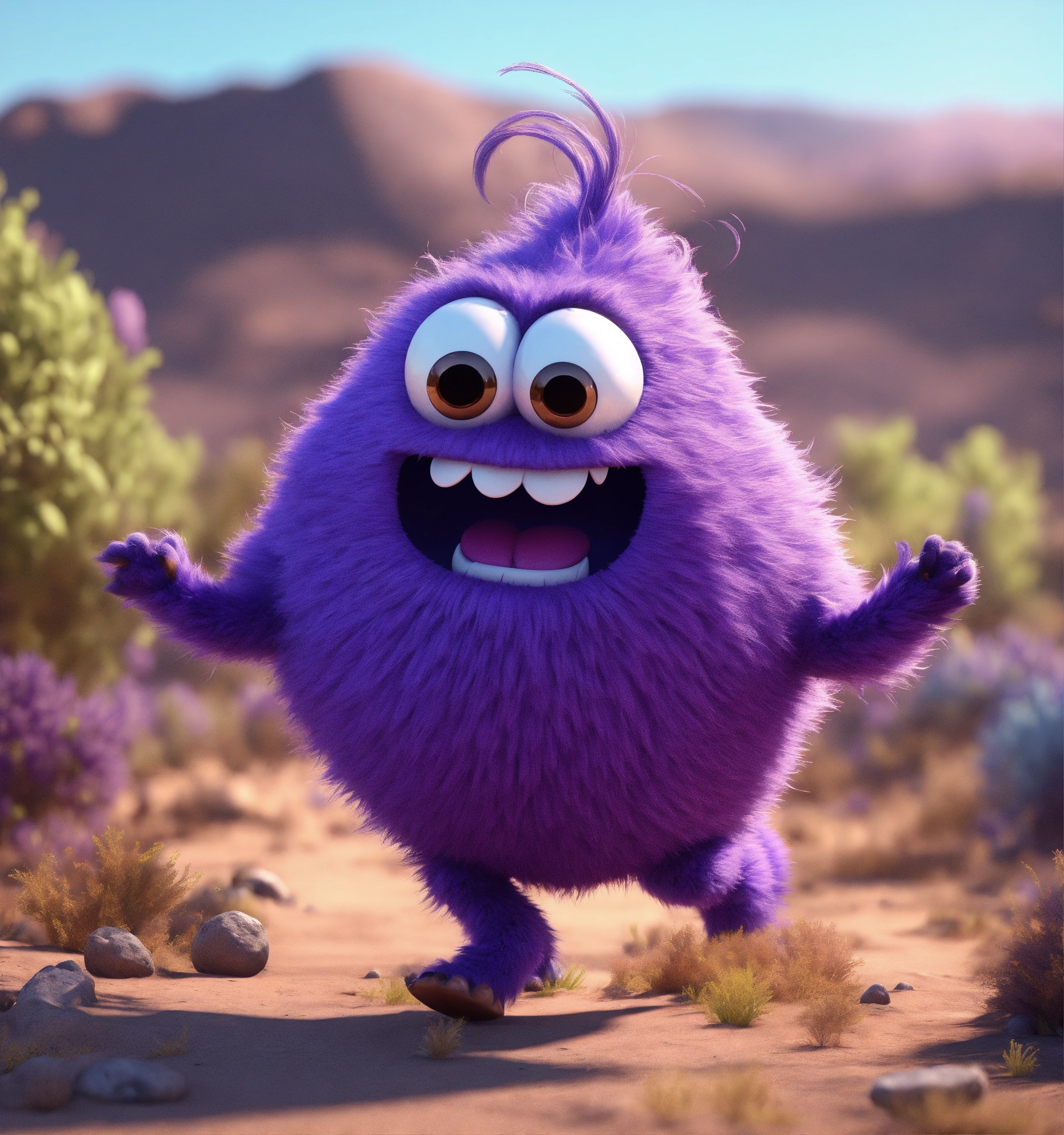Zoom out on a friendly, fun loving, pear shaped, hairy, violet colored monster cartoon character, running in a wasteland sci-fi, 8k, unreal engine, pixar