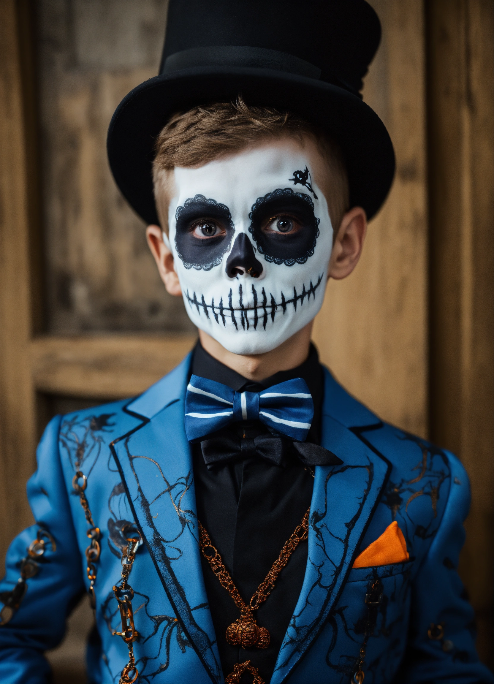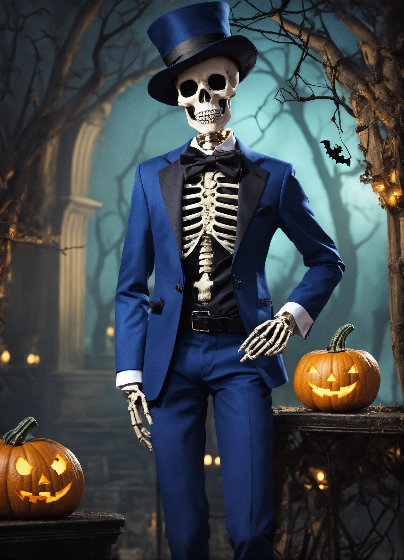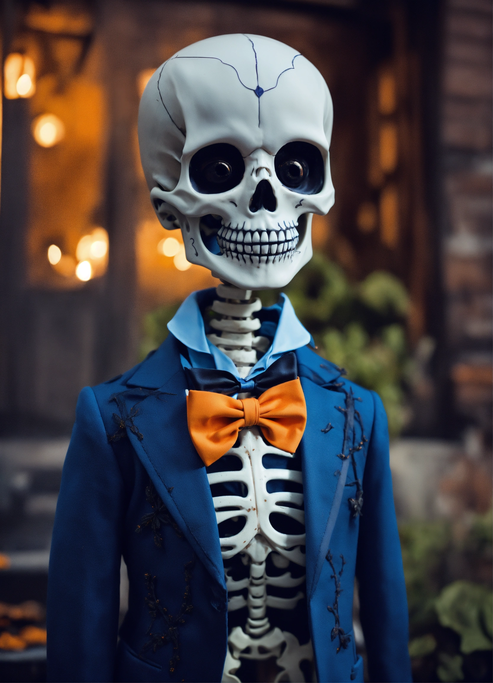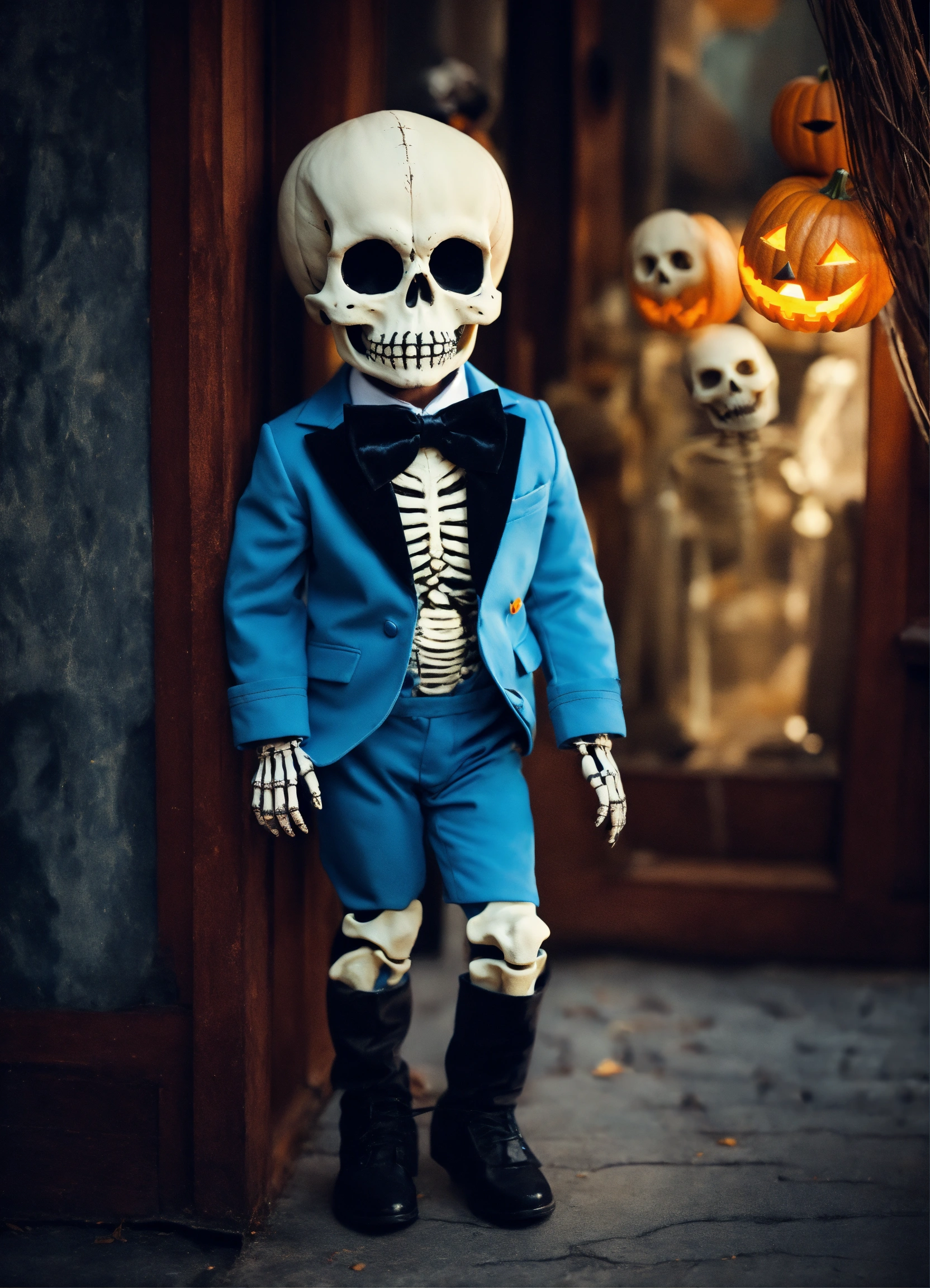 Halloween, skeleton boy, big friendly eyes, a blue open suit, you can see the skeleton, bow tie on the neck, whole body