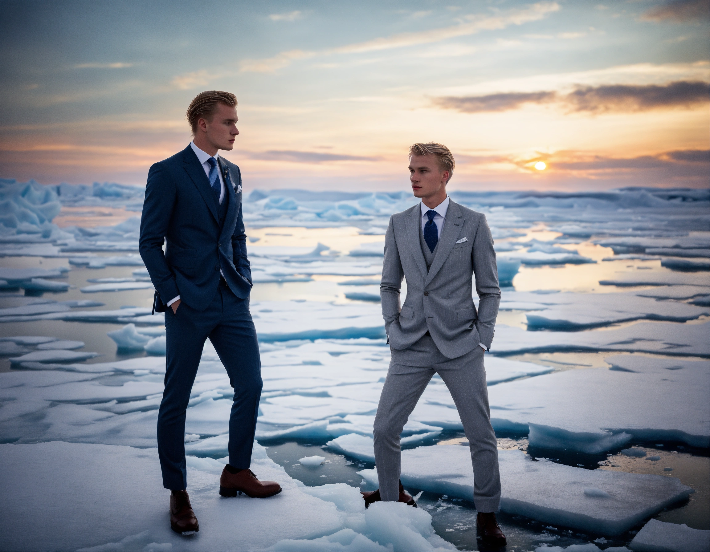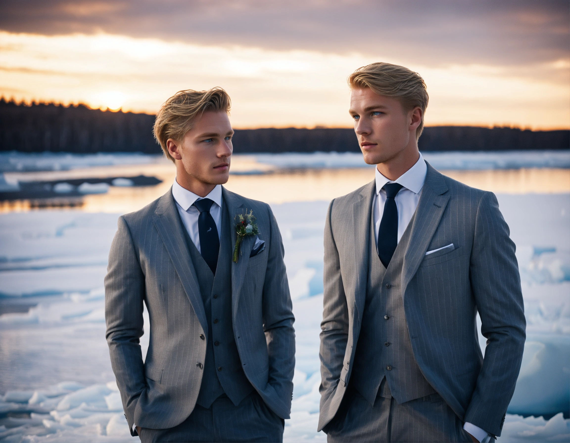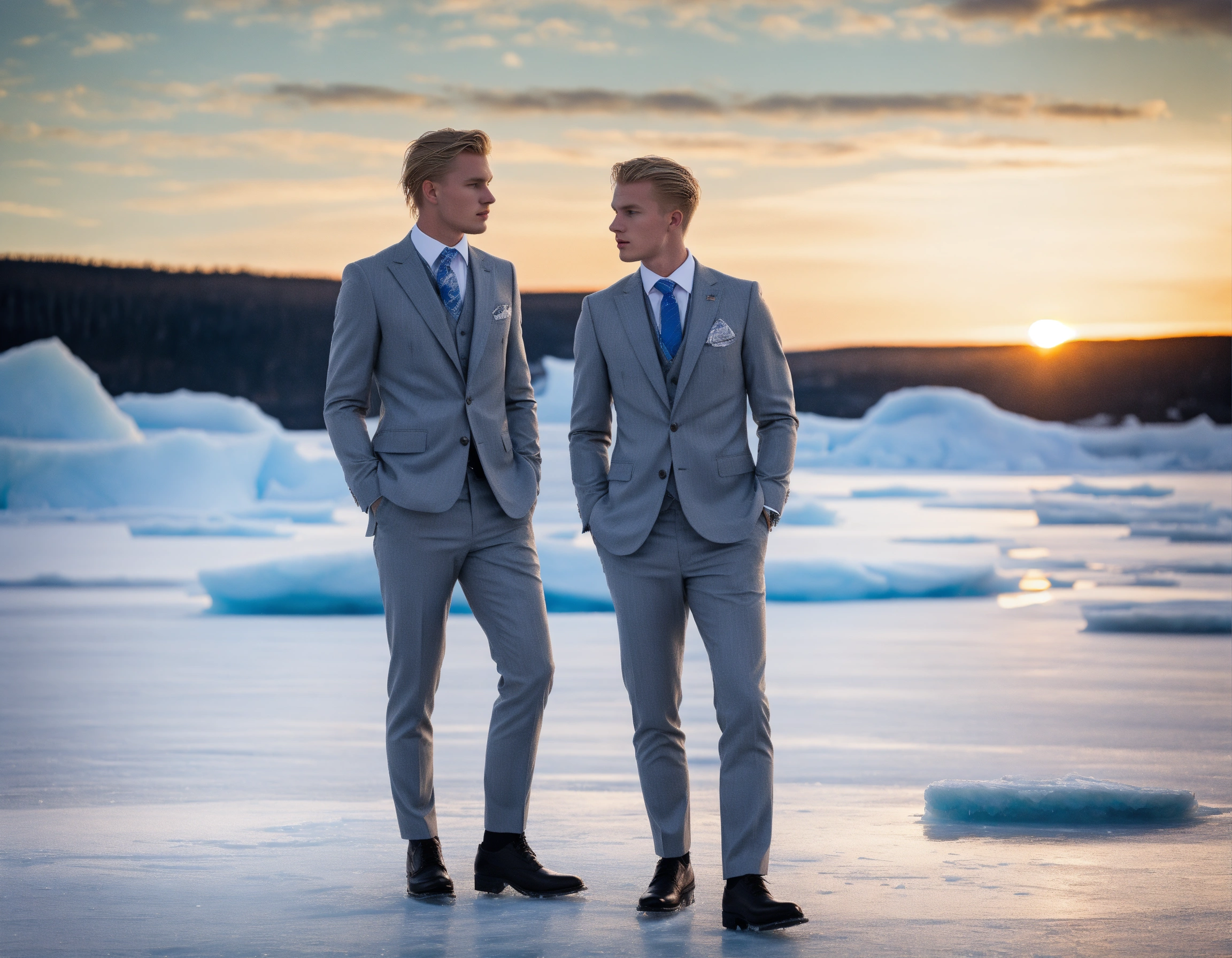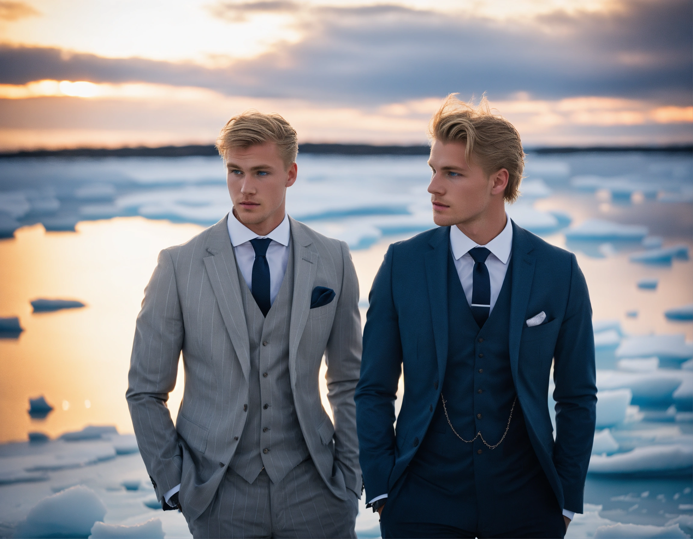 Two young blonde danish male models in light grey pinstripe vested suit and tie, blue eyes, looking at the sunset on the ice floe