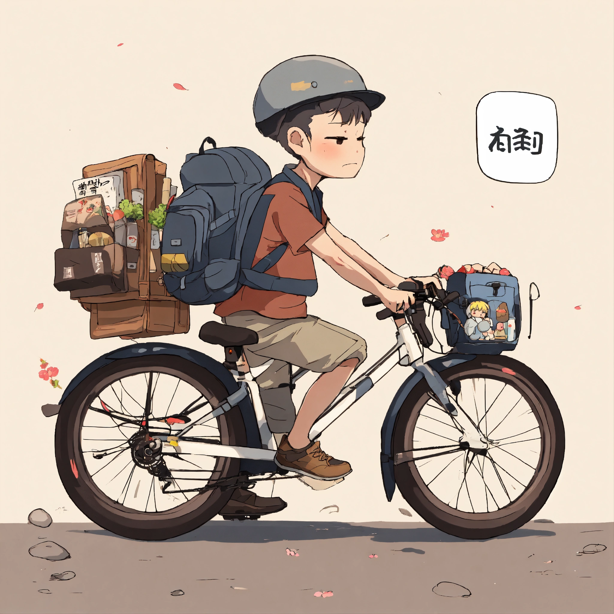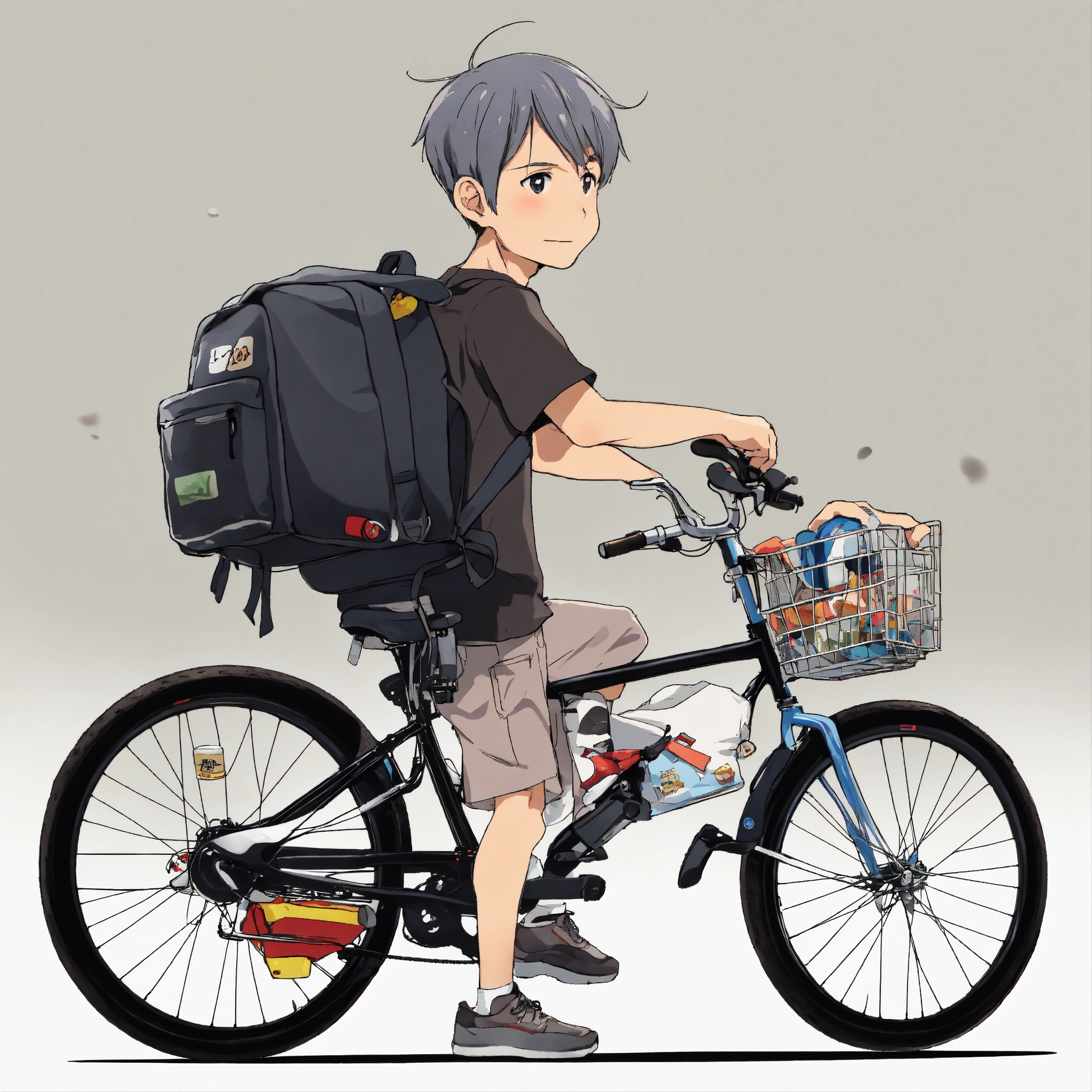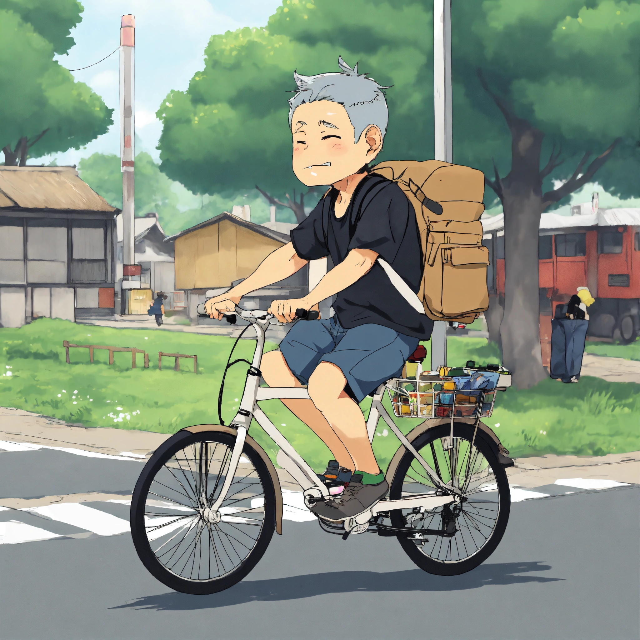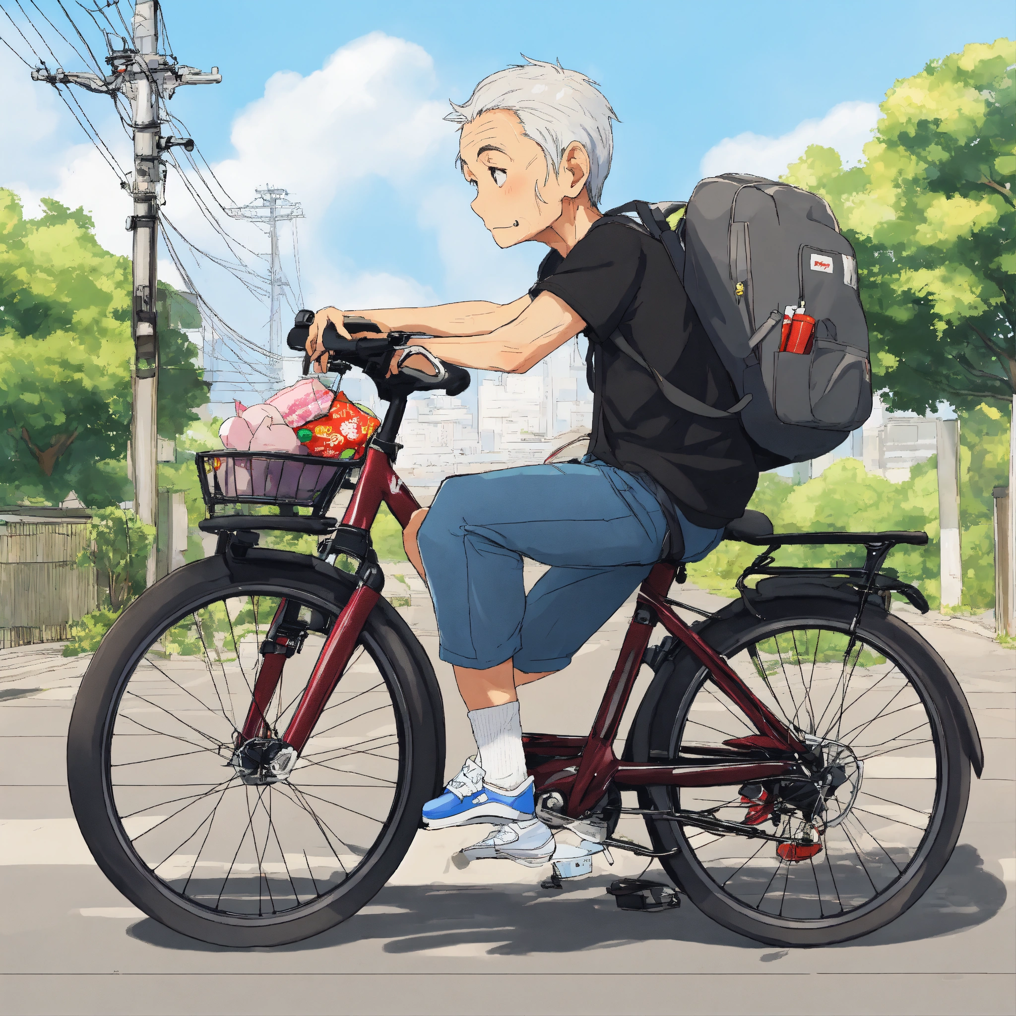 Poor japanese man, ride on the bicycle, black t-shirt, chibi character, anime style, 50 years old, short hair, no cap, white background, no backpack, a lot of stuff on the back of the bicycle