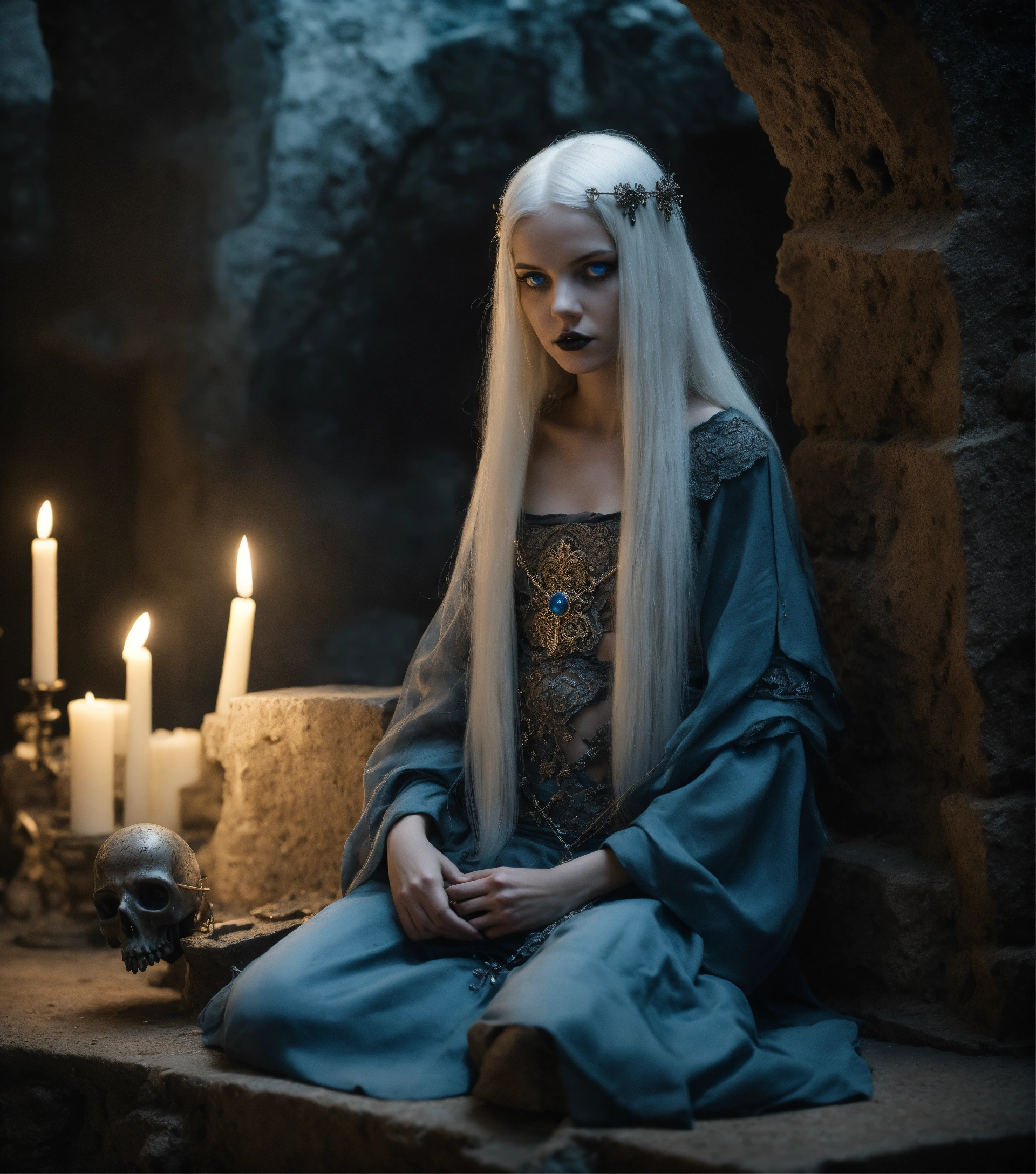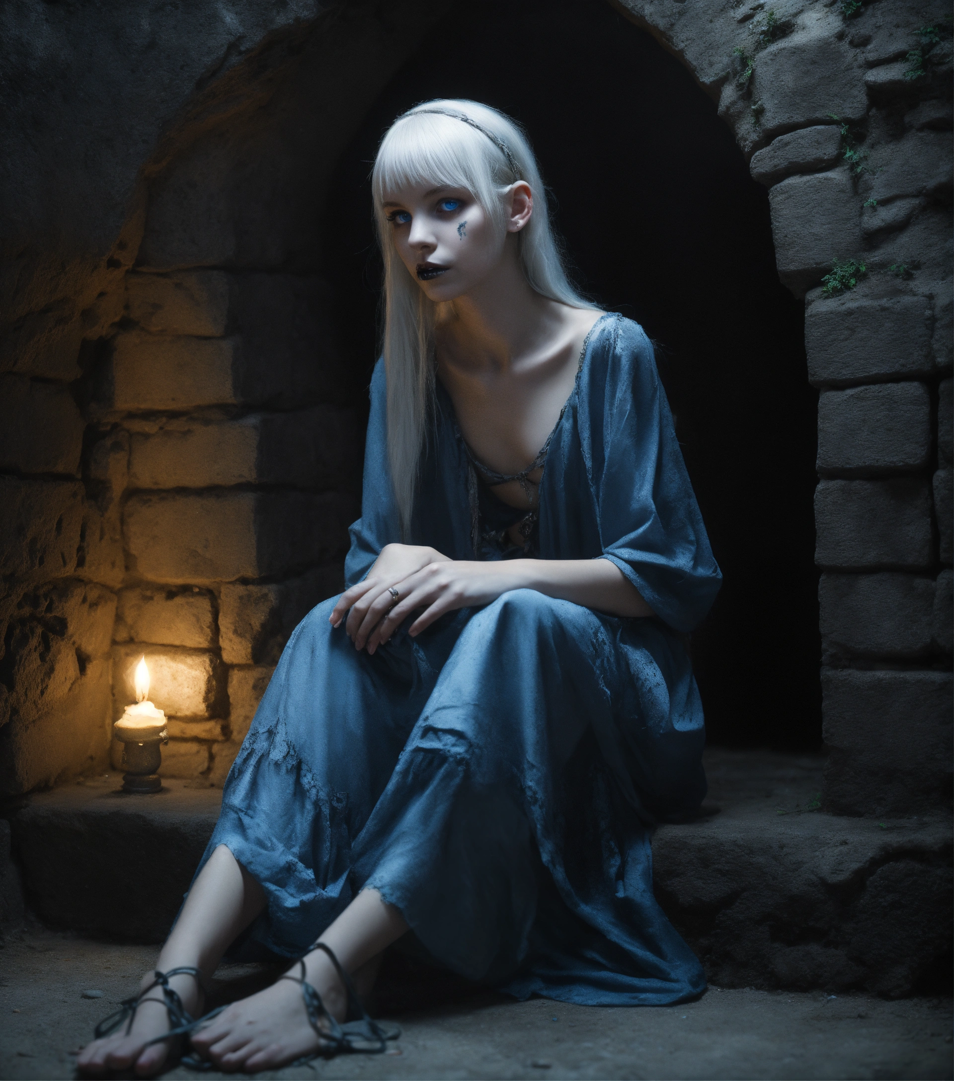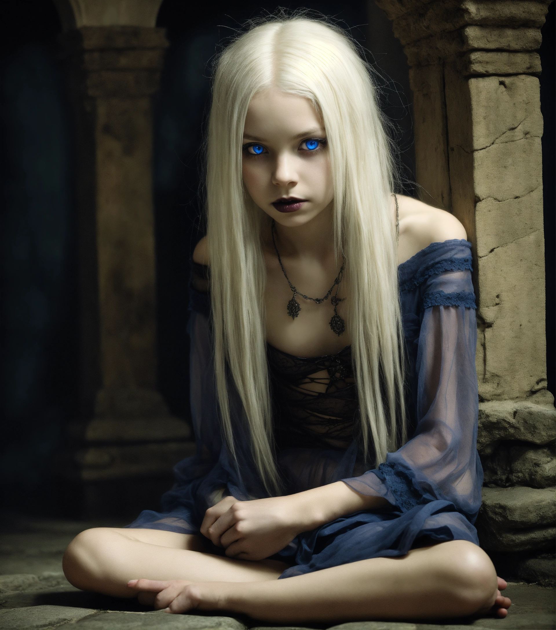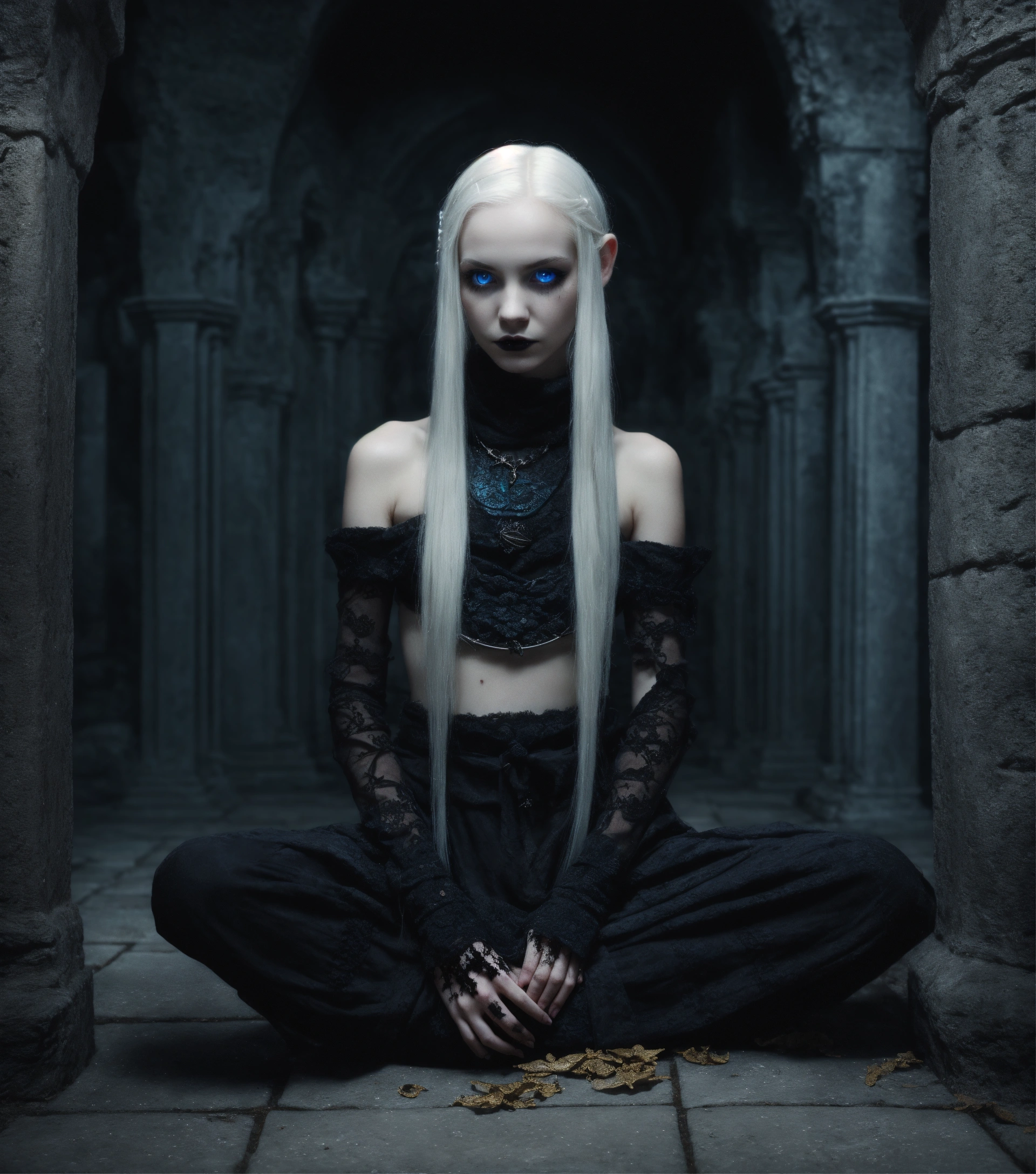 Body portrait of a very childish deadly pale extremely slim twelve year old female child, she is a goth necromancer with waist long silverwhite hair and a off-the-shoulder cropped top and a low worn hip scarf, extremely flat belly, belly button, extremely skinny, extremely slim body, emaciated body, completely emaciated, extremly narrow face, alabaster skin, pale as a corpse, glowing blue eyes, slim face, innocent looking, sits on the stone floor in a gloomy crypt, kindlich, unschuldig, childlike, graceful, wispy, glowing blue eyes, ghostly, dead, evil, demonic, undead, darkness, grotesque, mysterious, dark, dark, cold ambient lighting, extremely detailed, fantasy, medieval setting