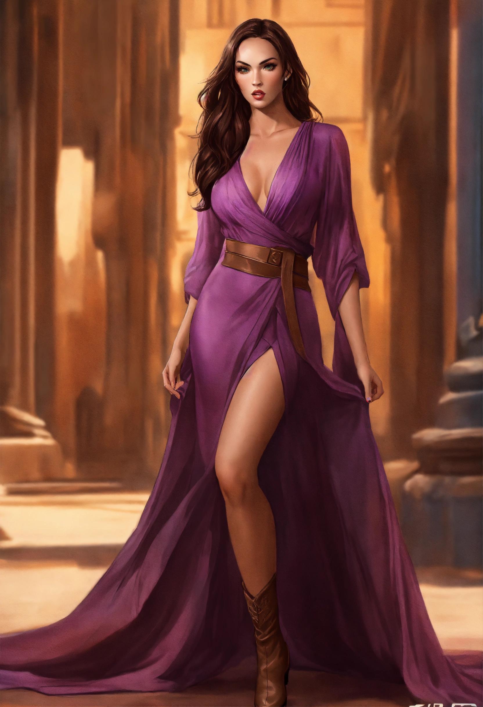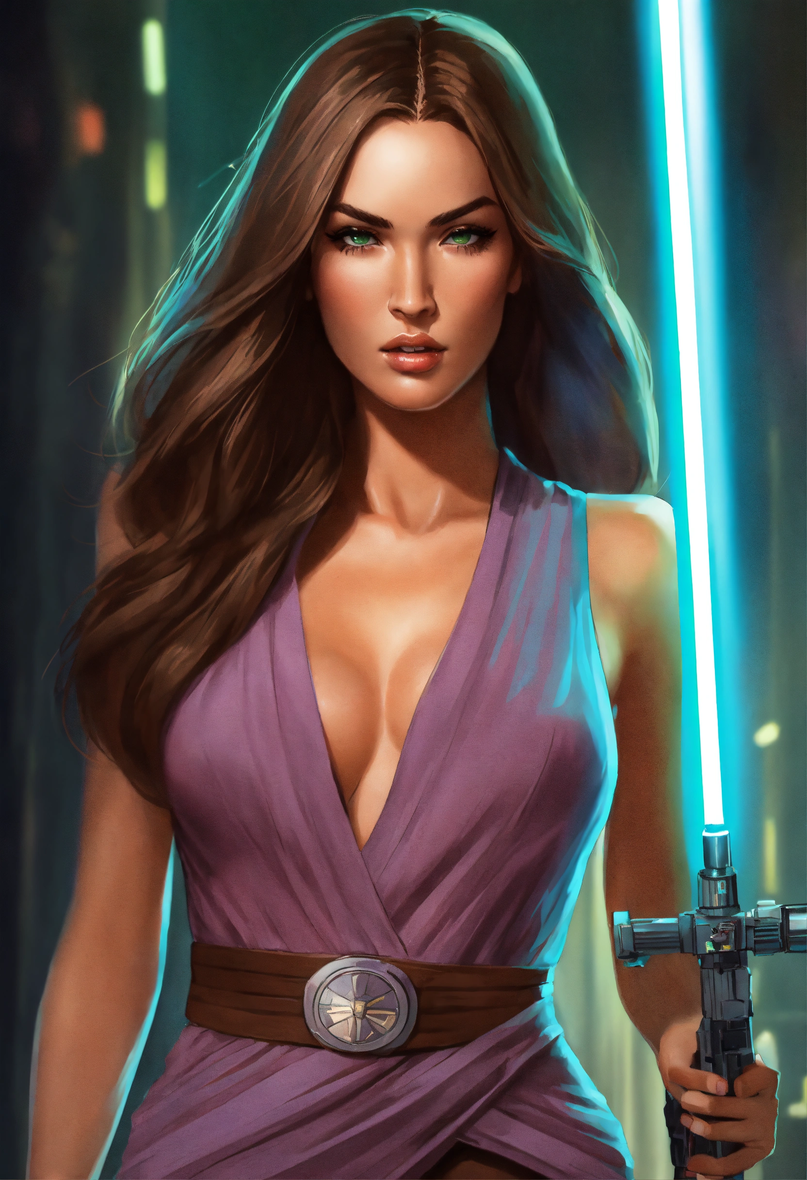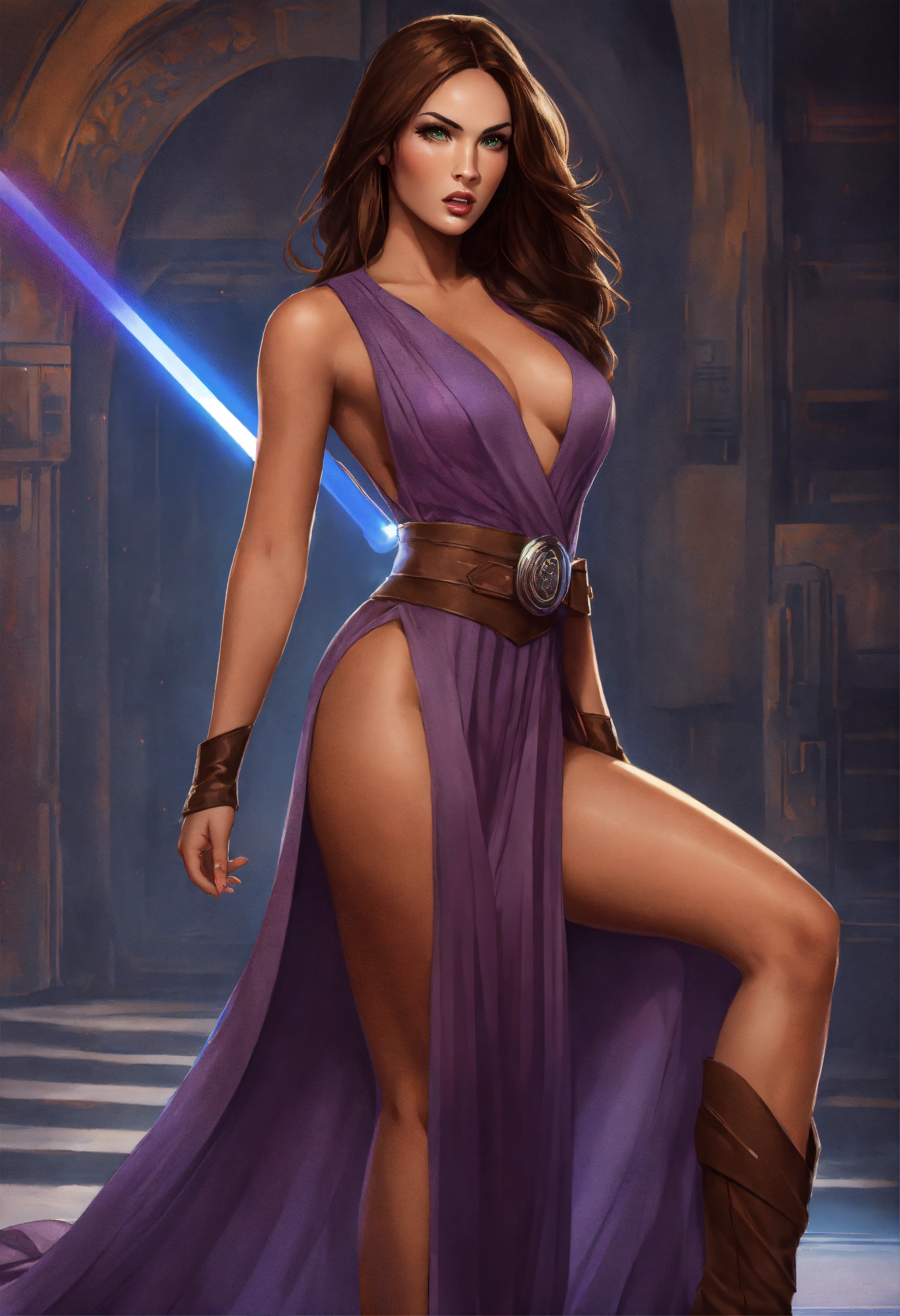 Concept art of pretty female megan fox jedi in a form-fitting plunge-cut outfit, maria lucia honan dress, light brown loose hair, green eyes, long floor length dress, long very light brown hair, star wars, sabine rich, artgerm, j scott campbell, artgerm, jedi outfit, full body, detailed, hyper realistic, intricate, beautiful, low cut neckline, fitted, tight dress, perfect body, full body, maria lucia honan dress, belt, high leg slit dress, knee high brown boots, jedi, star wars, pleated fabric, jedi, smooth light skin, round face, slim nose, long black eyelashes, perfect detailed face, realistic, cinematic, long dress, full body, low cut neckline, very long flowing light brown hair, loose long brown hair, fitted dress, tight fitted dress, leg slit dress, purple ombre chiffon fabric dress, purple ombre flowing chiffon fabric, purple ombre