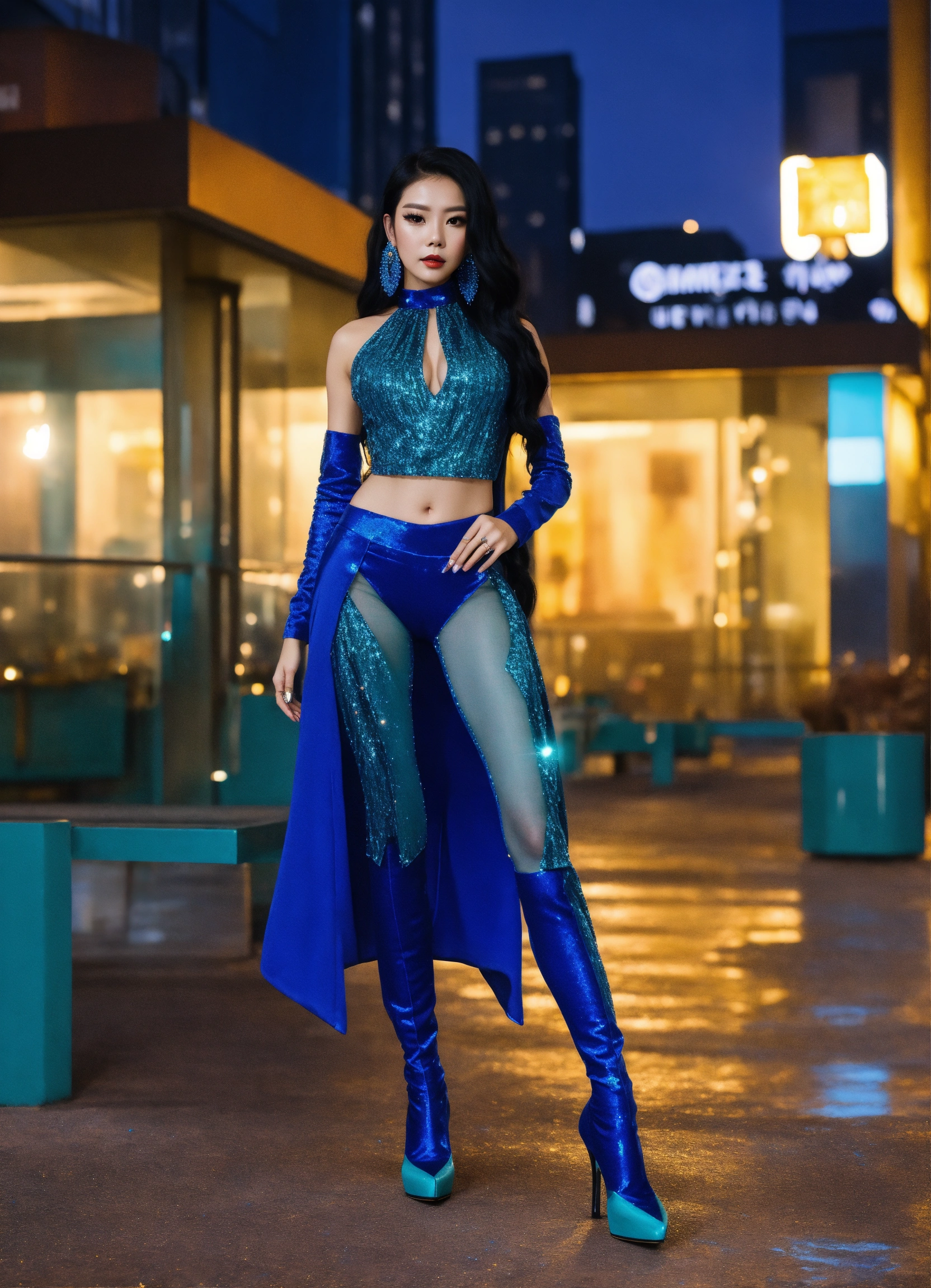 Dreamcatcher jiu glamorous sparkly mesh ultramarine and teal full outfit with high heels with black hair