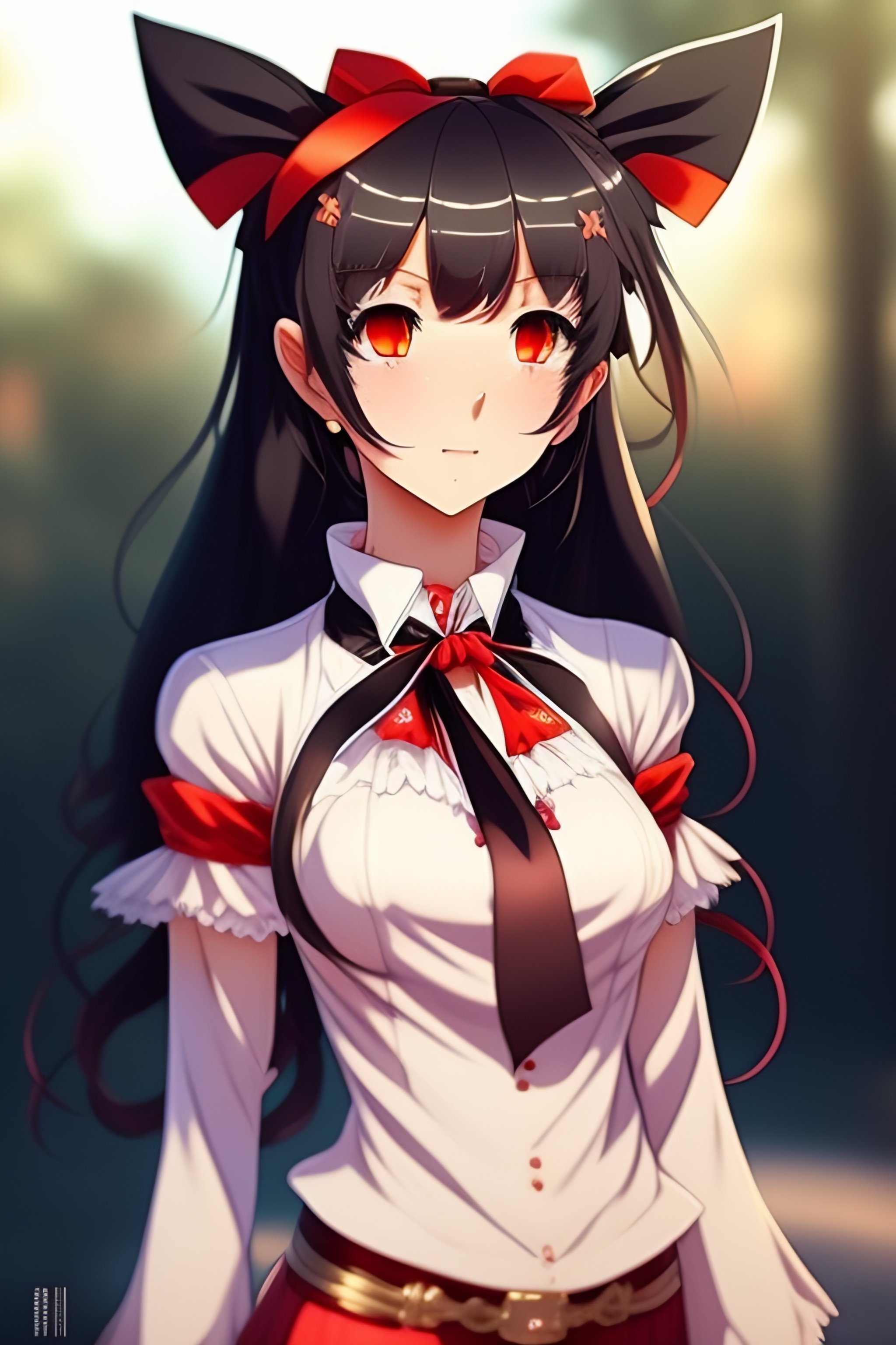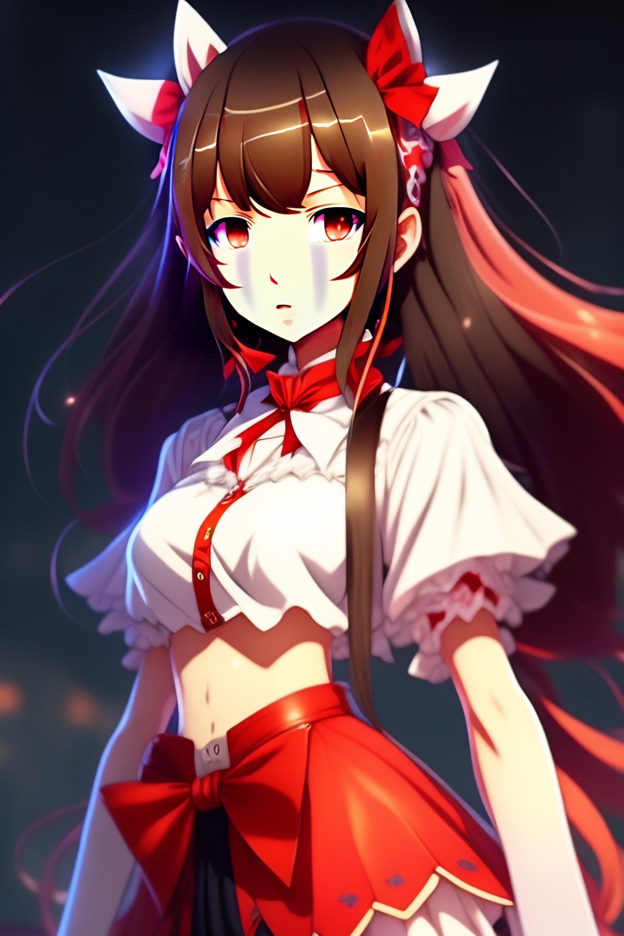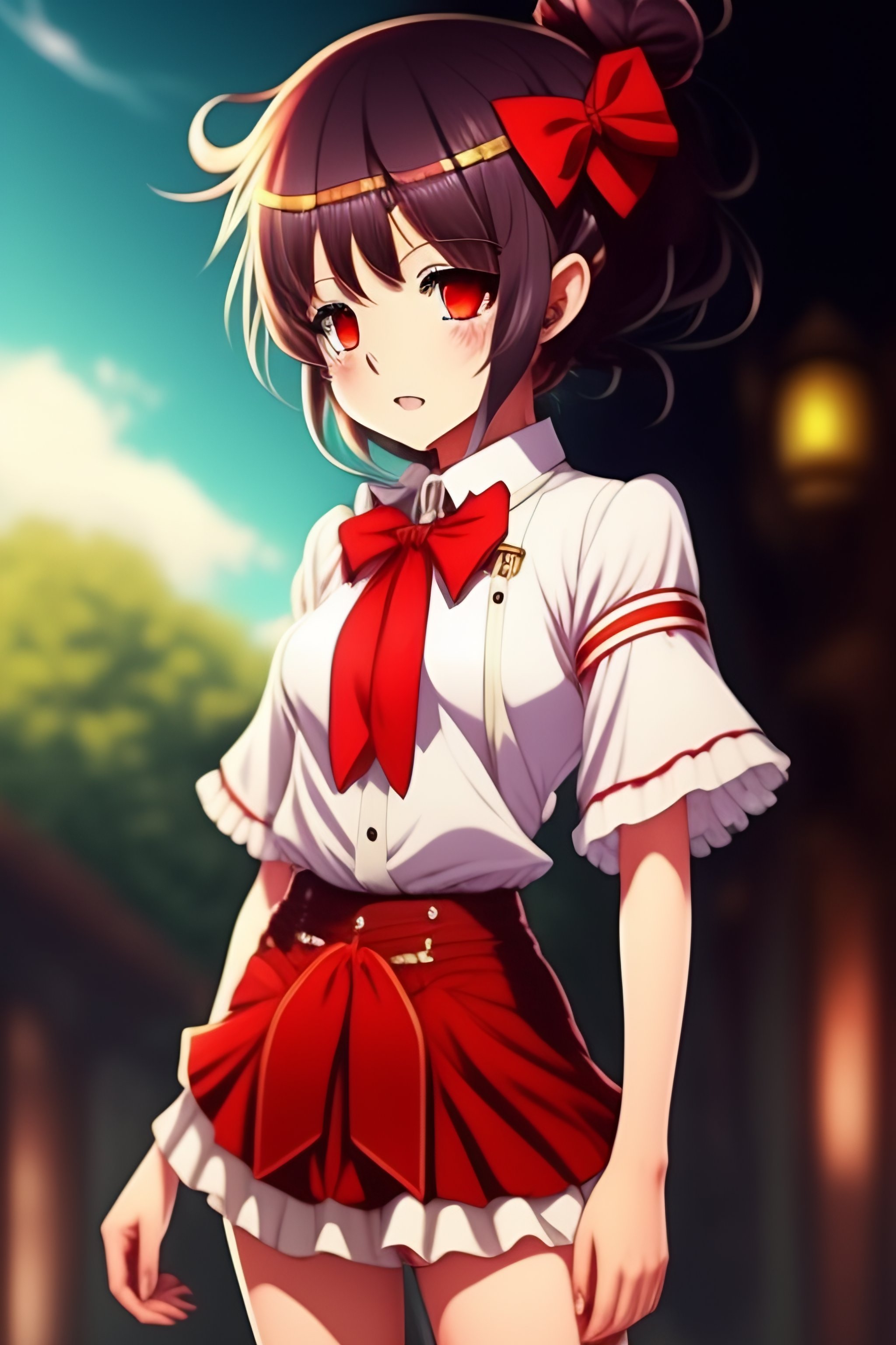 Anime girl, evil, hairband with bow, demonic, loose white shirt with red accents, short red pants, short brown hair, brown eyes