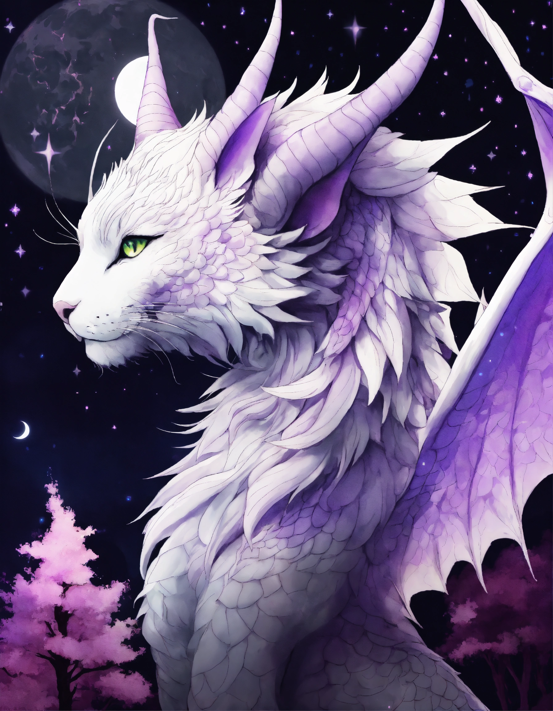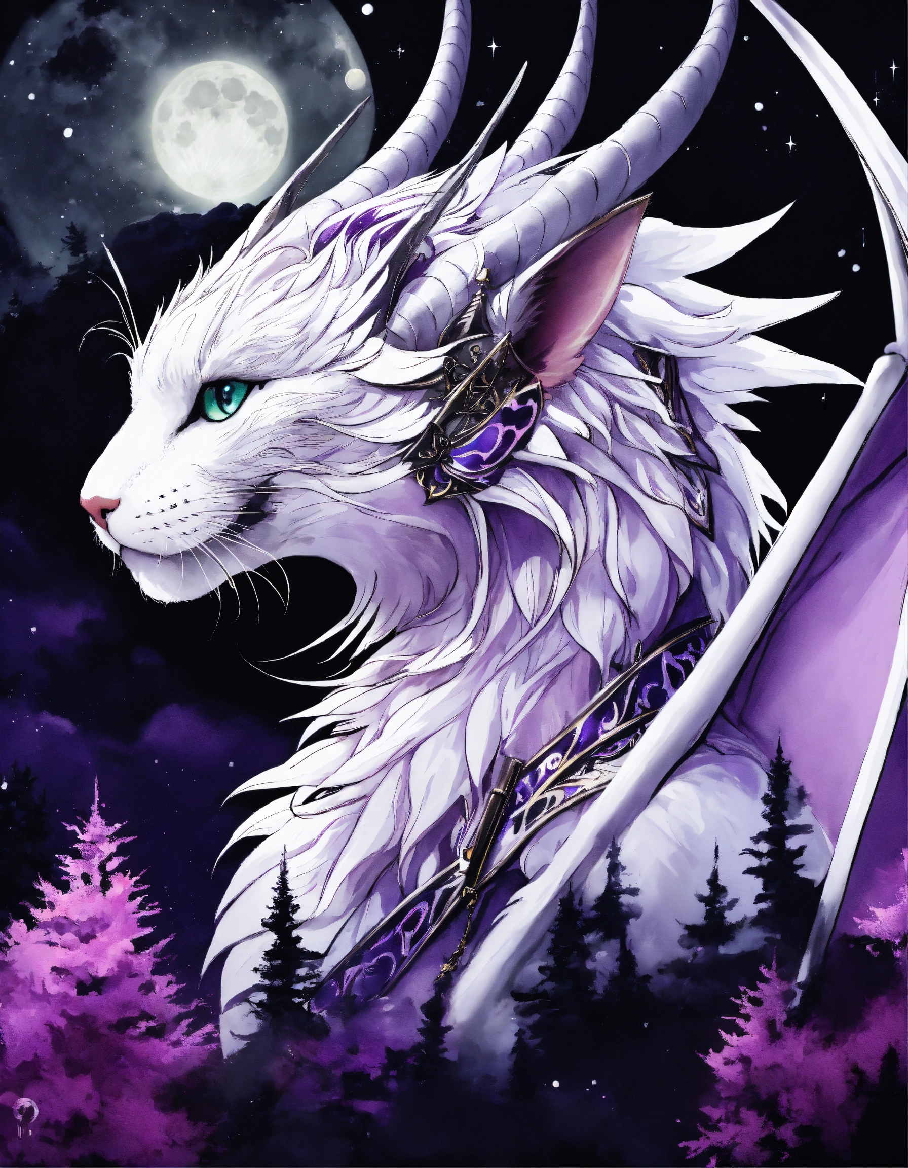 White black purple dragon cat with wings the wizard, fantasy, anime 90 style, forest, moon night, profile