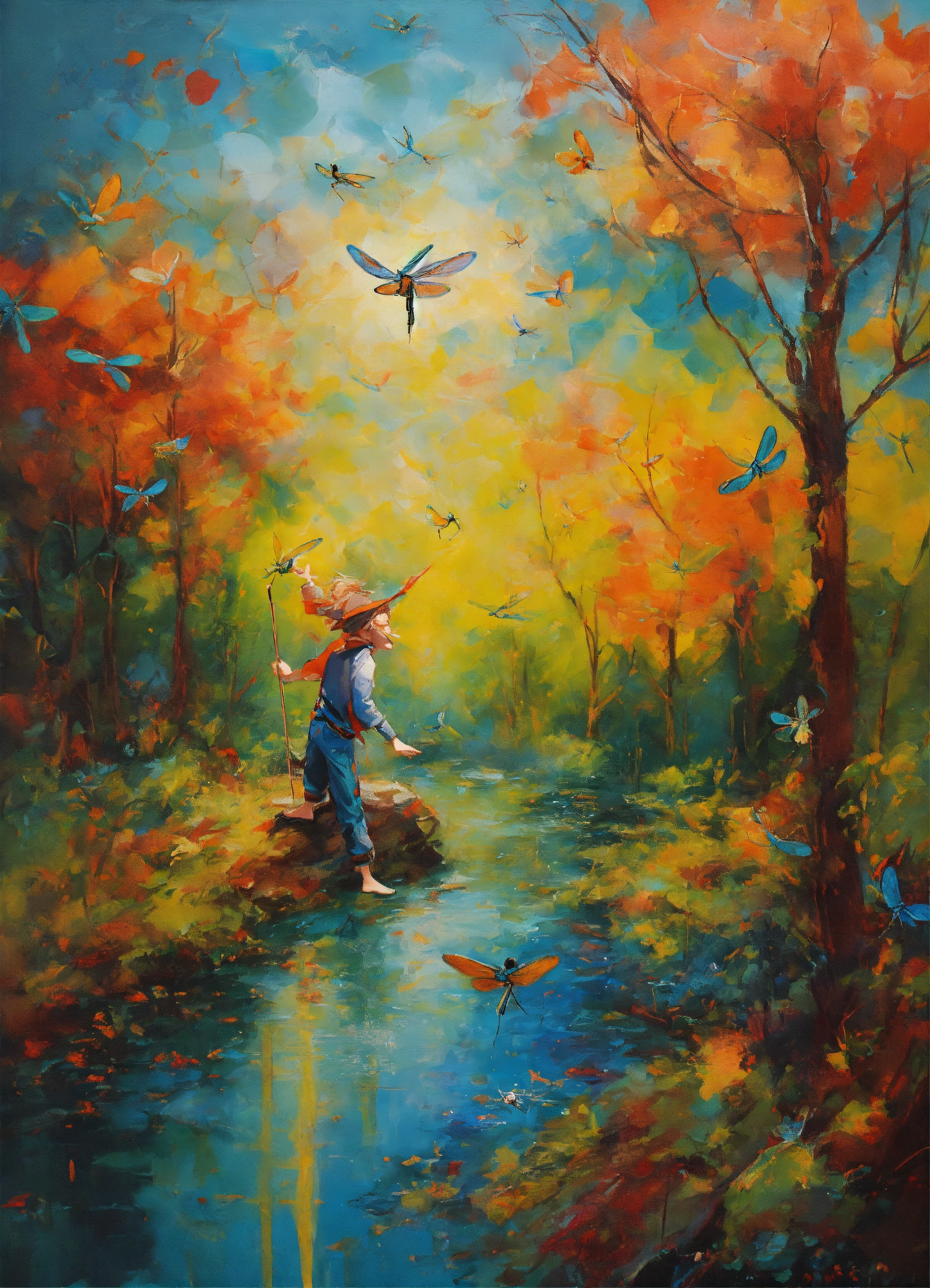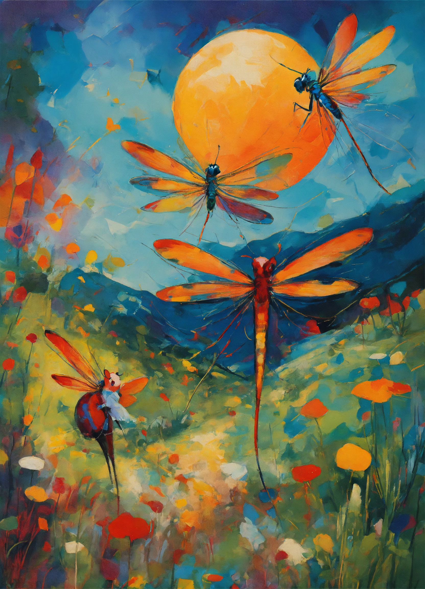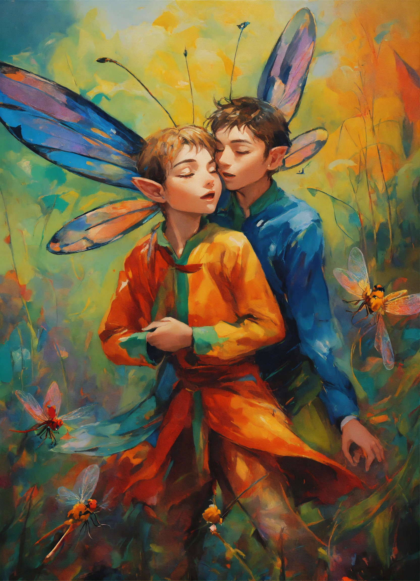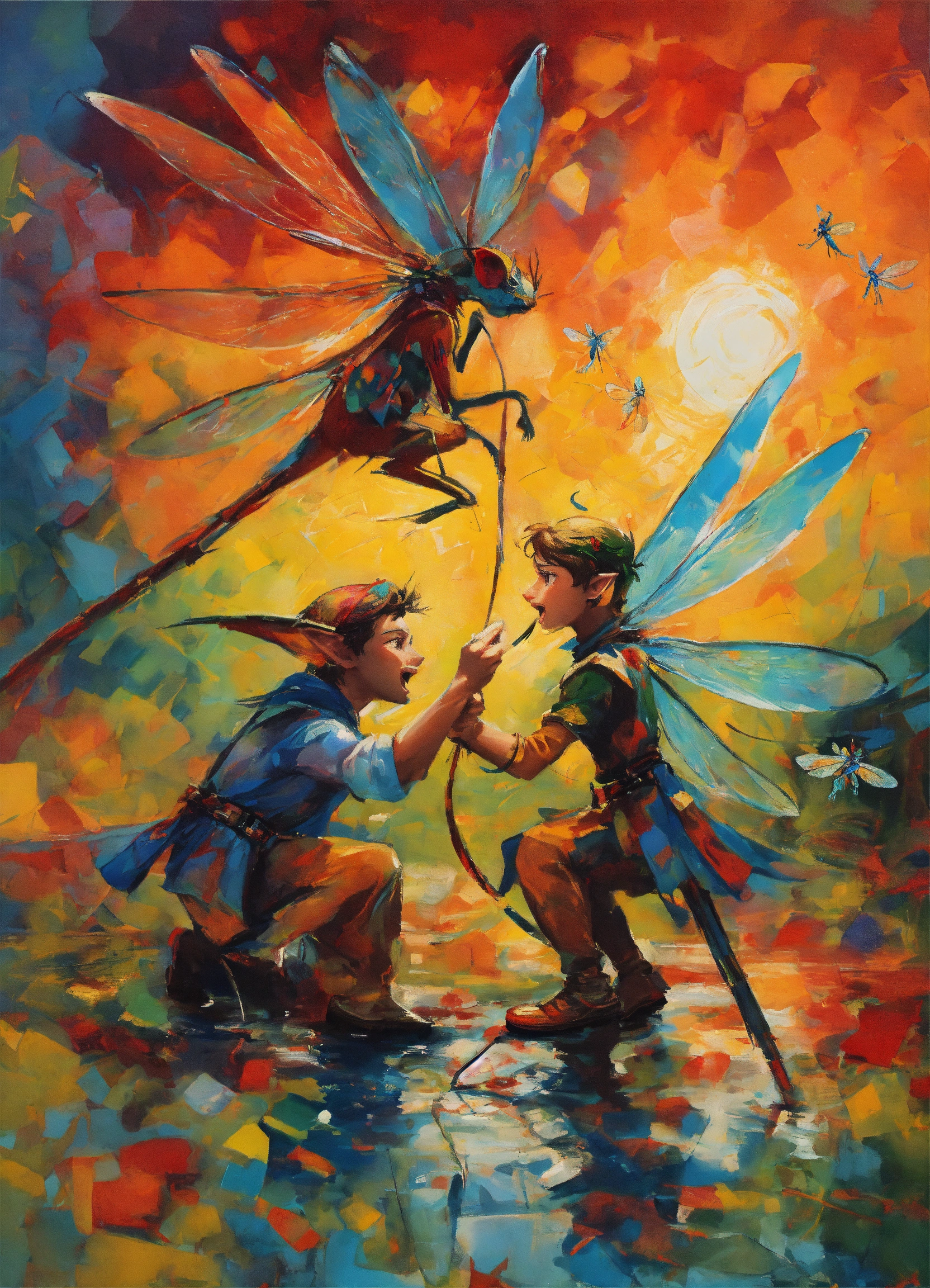 In a neo-expressionist interpretation, an elf engages in a spirited conversation with his small mouse friend. their animated dialogue is accentuated by bold strokes and vibrant colors, reflecting the intensity of their interaction. above them, dragonflies create a whirl of energetic motion. this neo-expressionist depiction captures the vivid and passionate emotions of their friendship as they share a magical moment under the expressive sky.