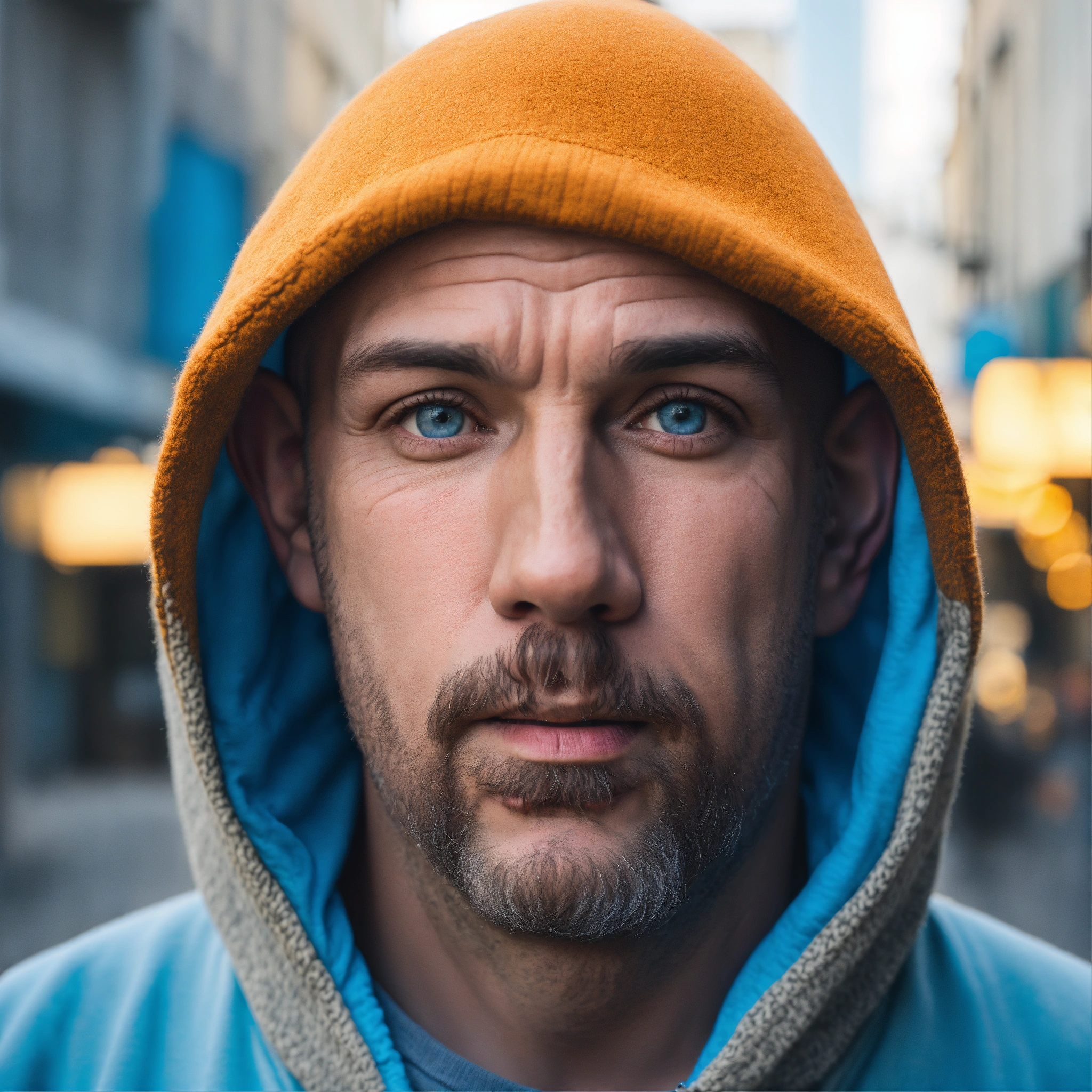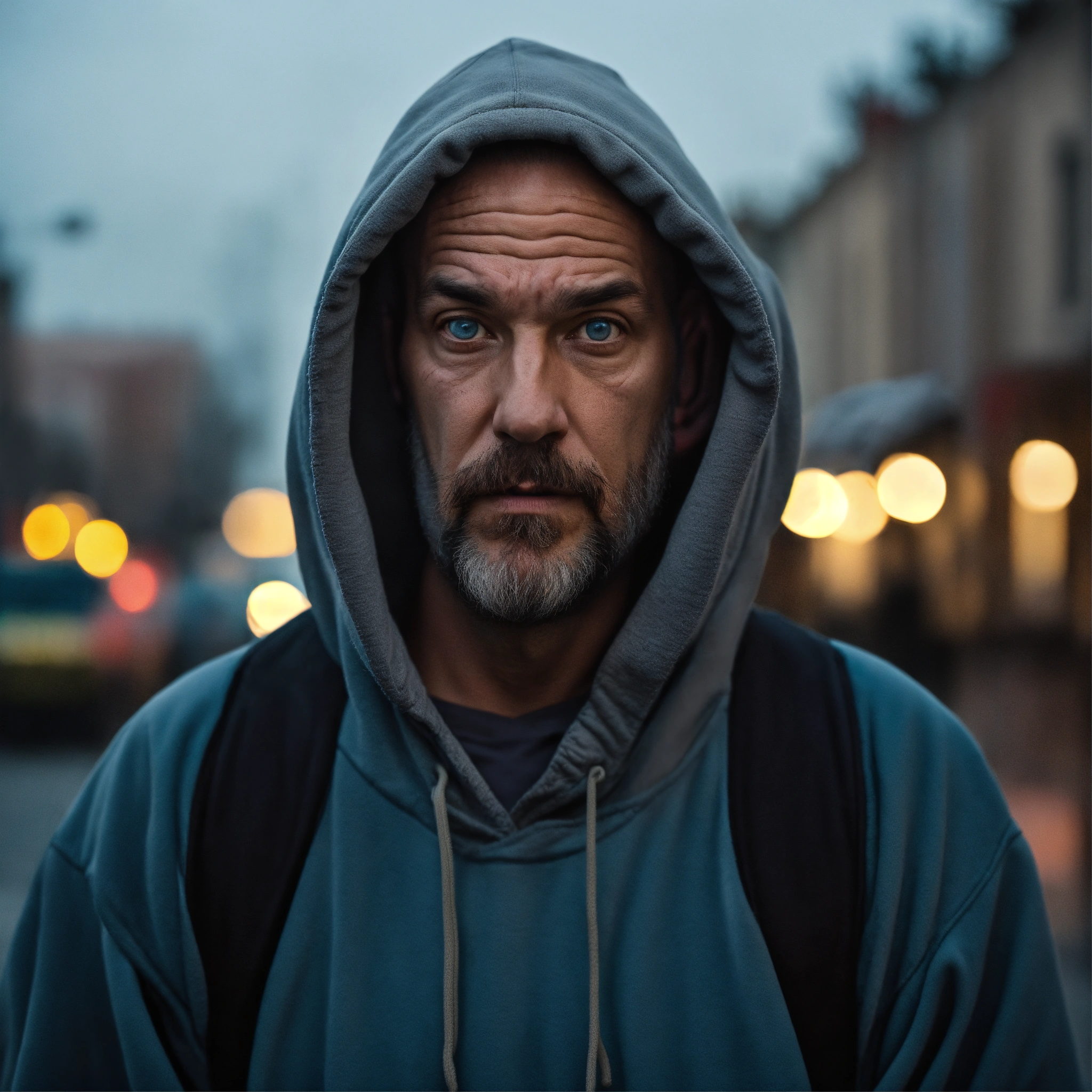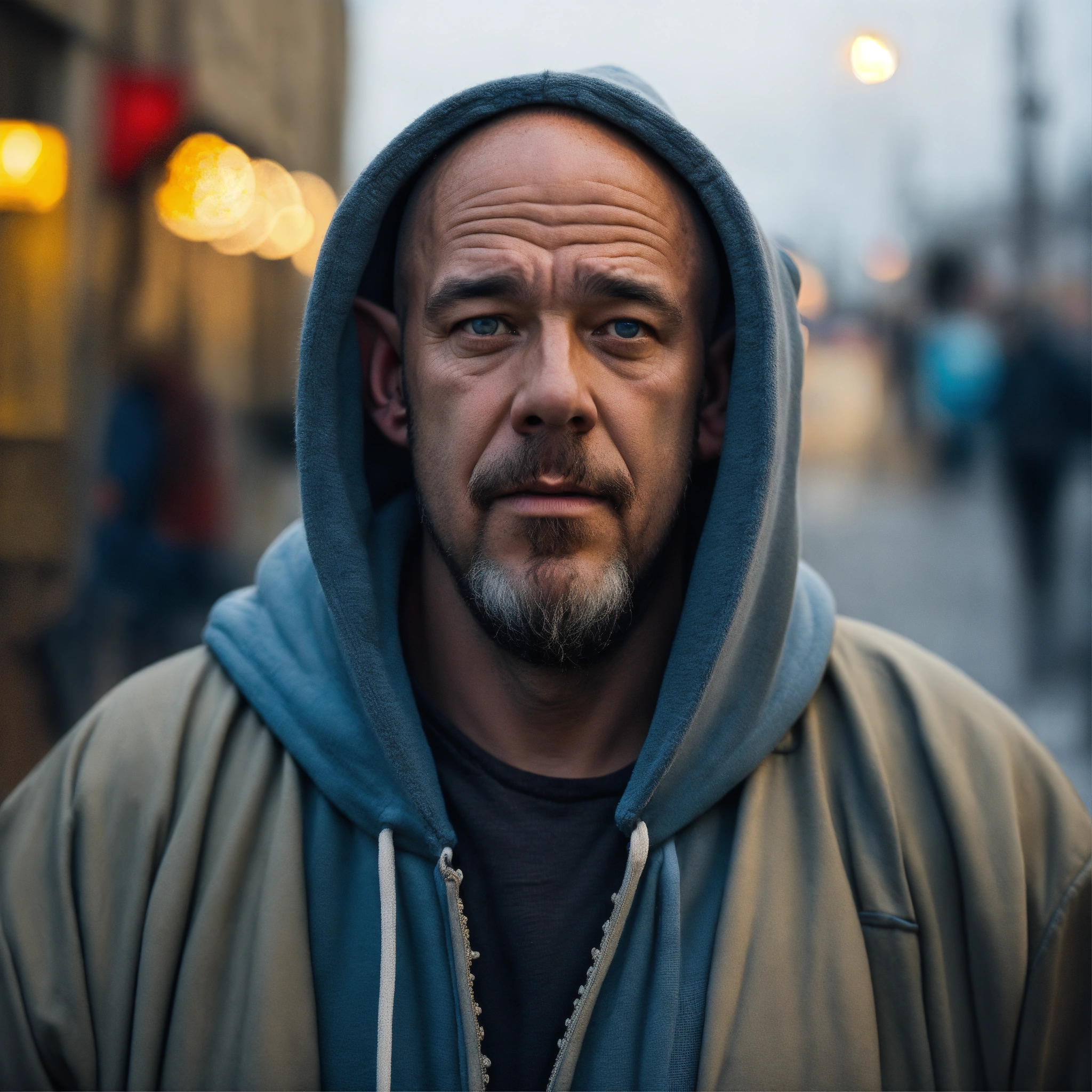 A homeless huge man with a huge lumpy bald head, a tiny goatee, protruding forehead, sunken light gray-blue eyes, crooked mouth, large ears, wearing a hoodie up over his head, standing in the street