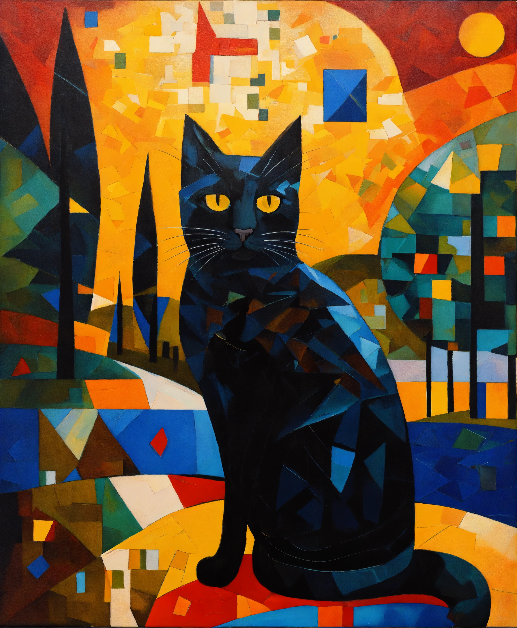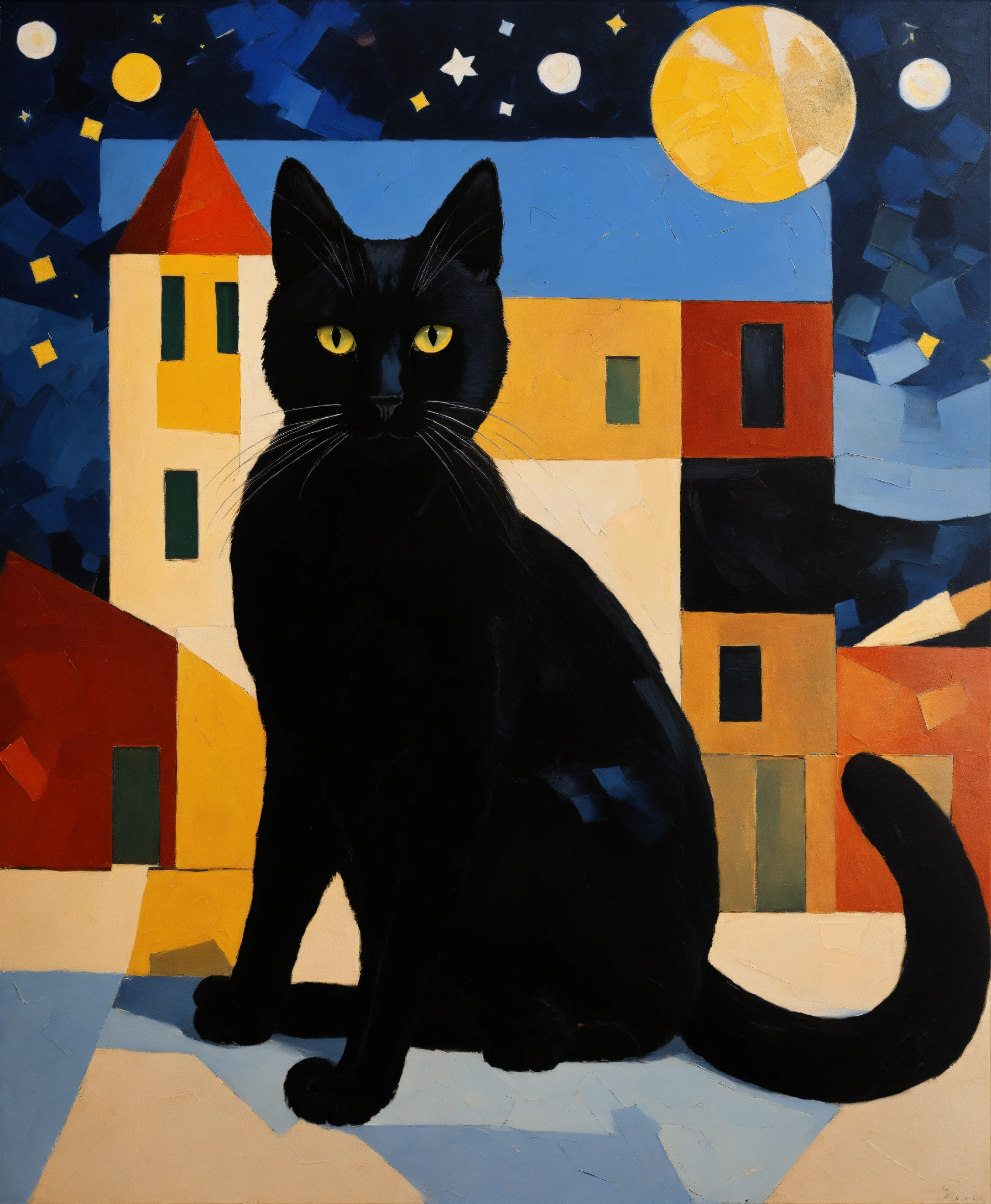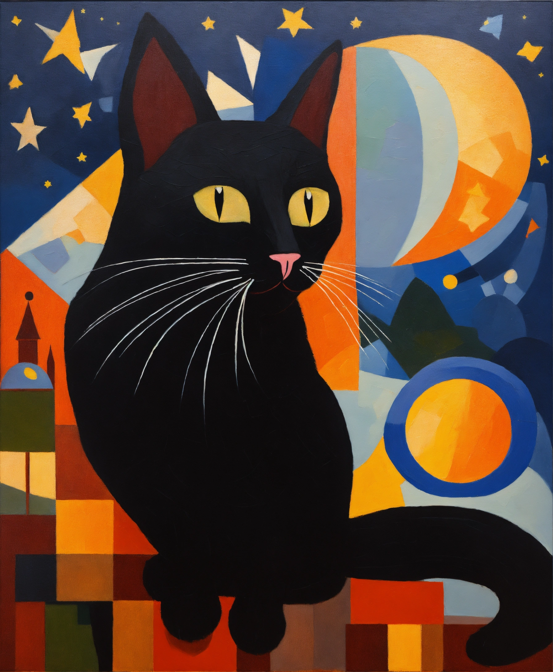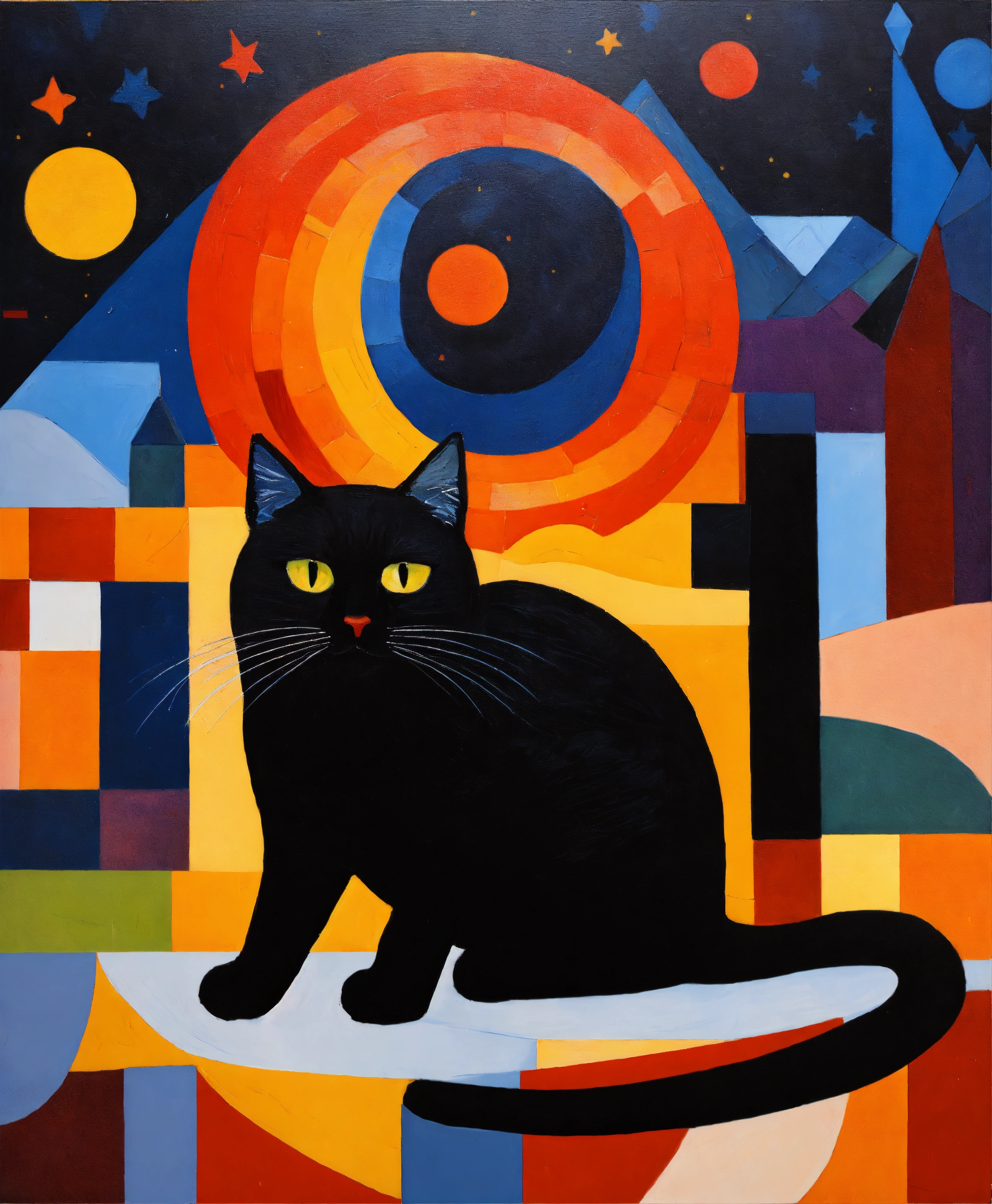 Oil painting on the theme of the real elena zinchenko with a black cat against the backdrop of a starry night in the style of suprematism