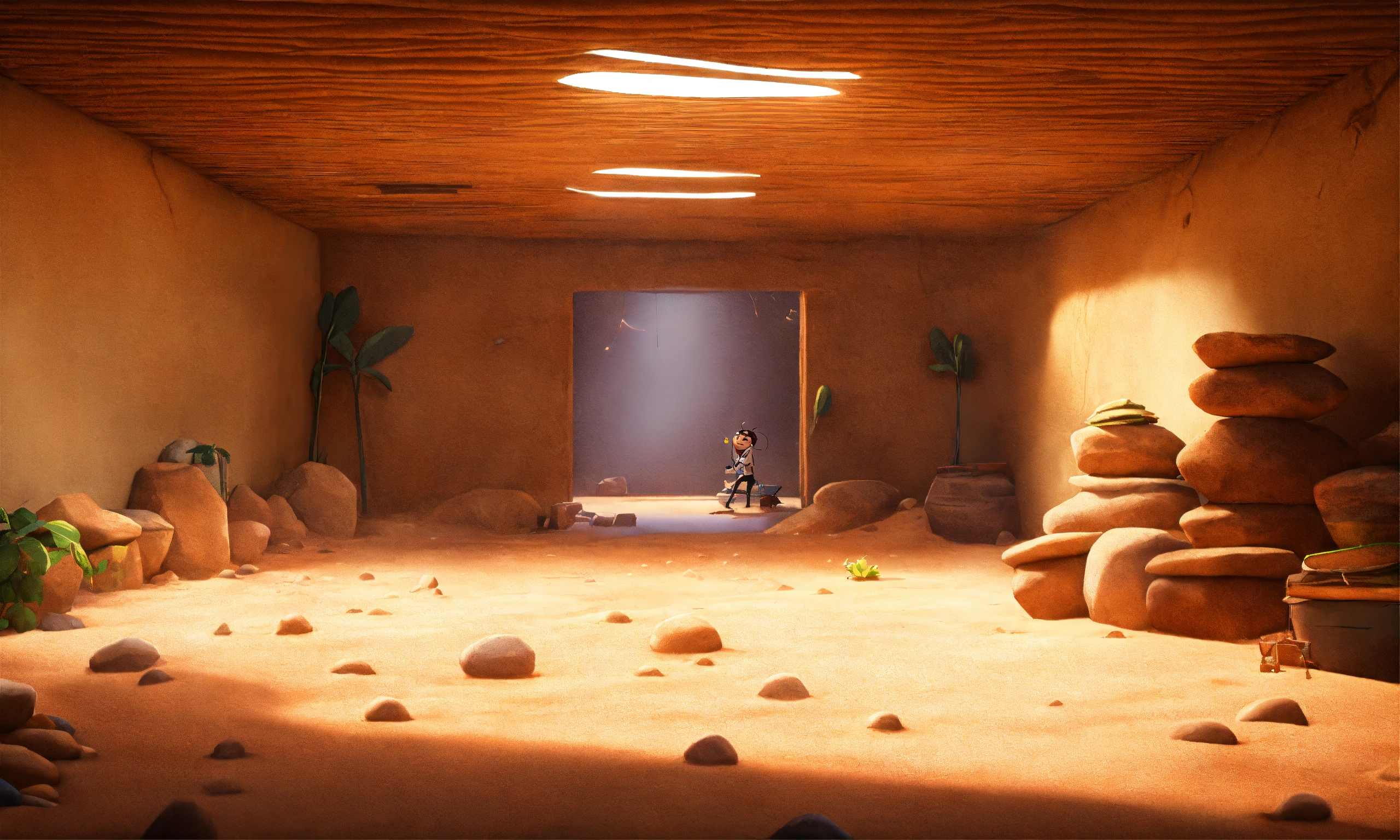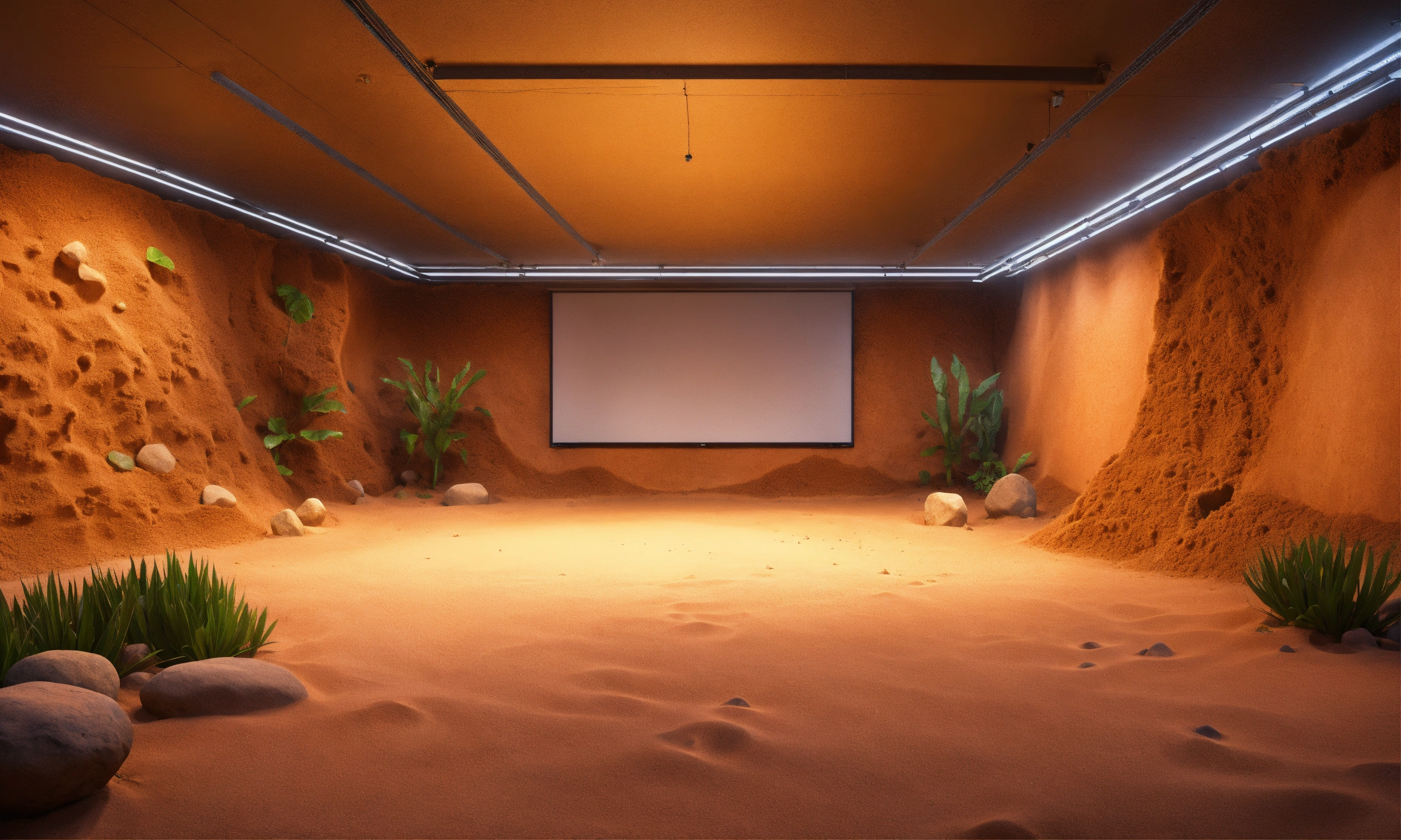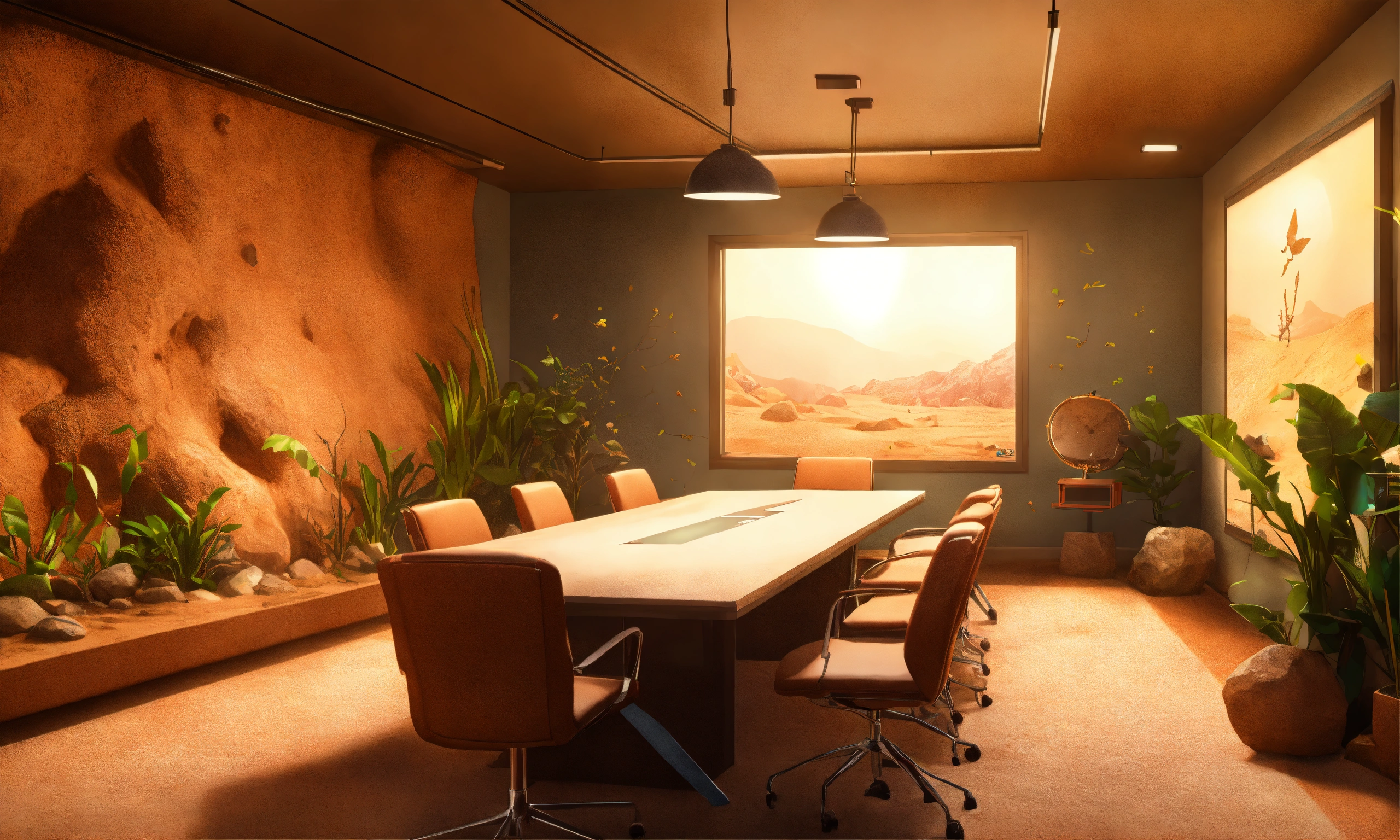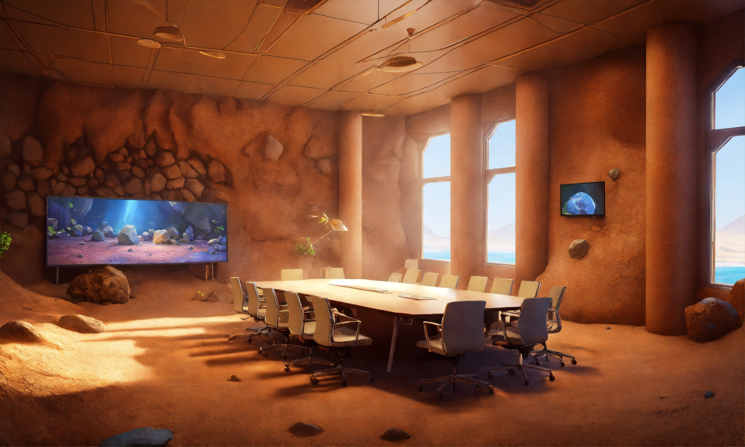 Empty conference room in ant nest, wild space, underground, a wall of sand and small rock, pixar, 4k, palnts only