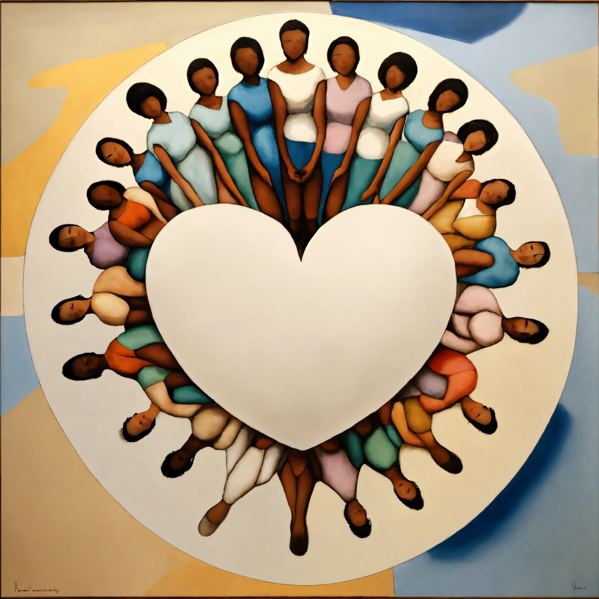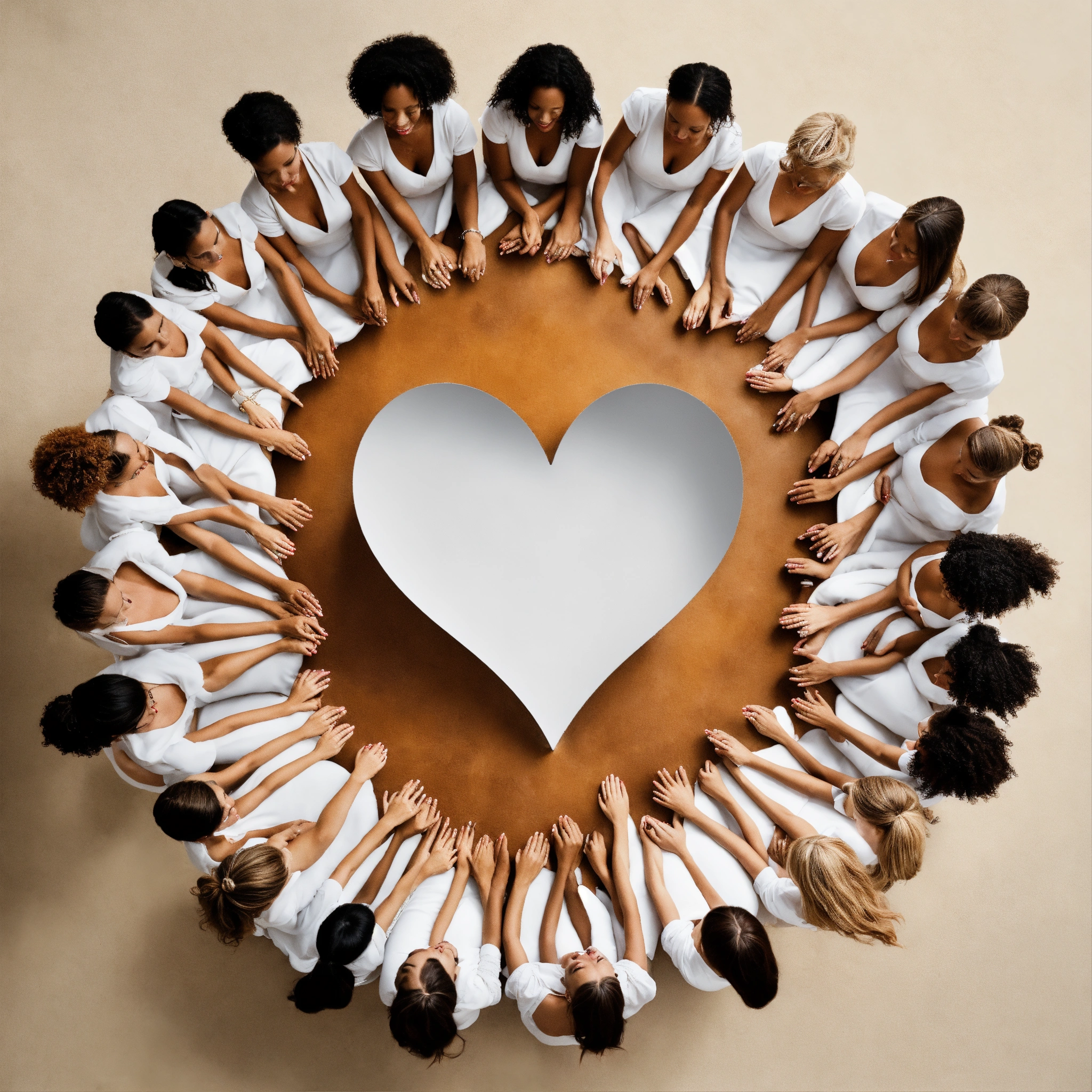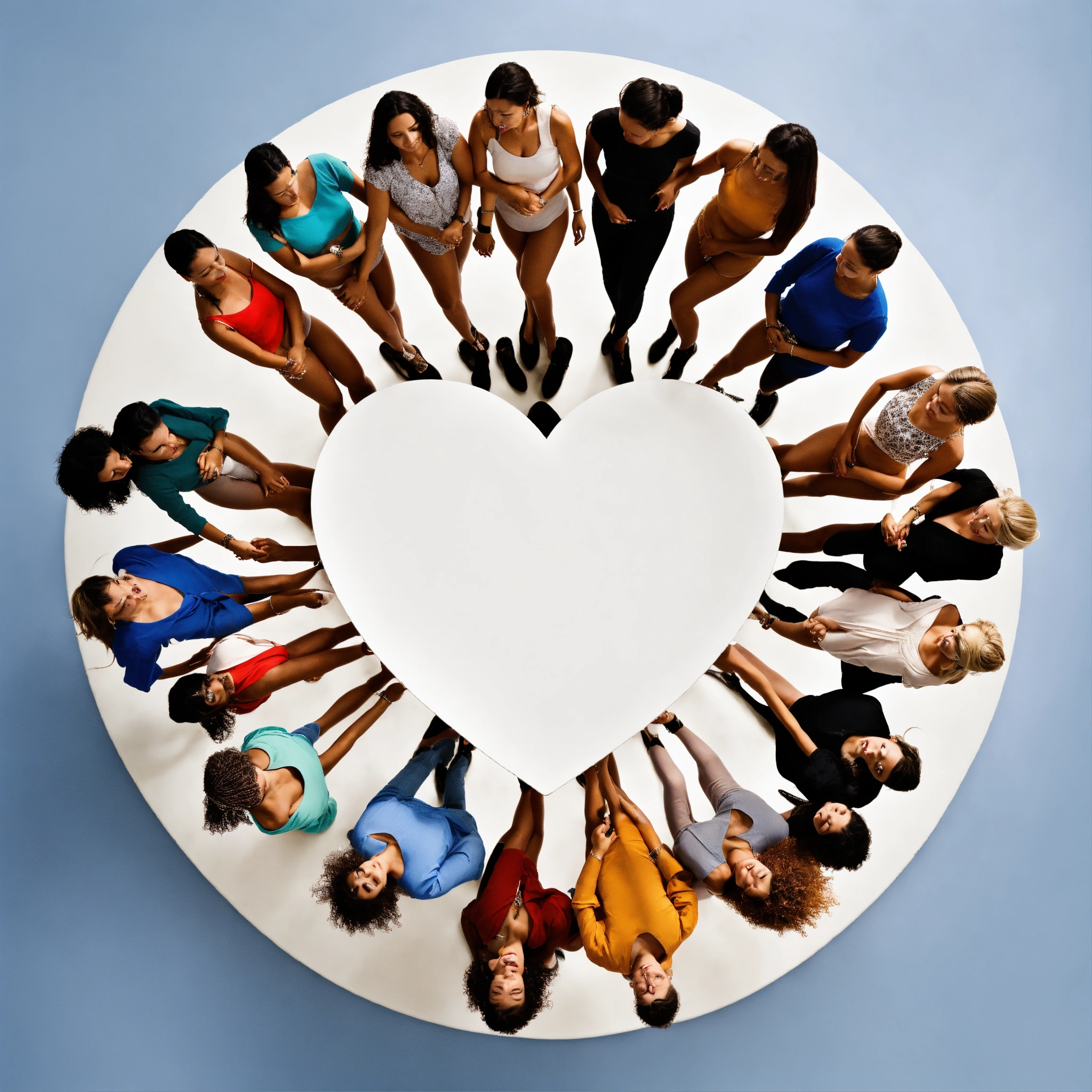 Large white heart with 8 women standing around the outside, in a circle, holding hands, top view, abstract