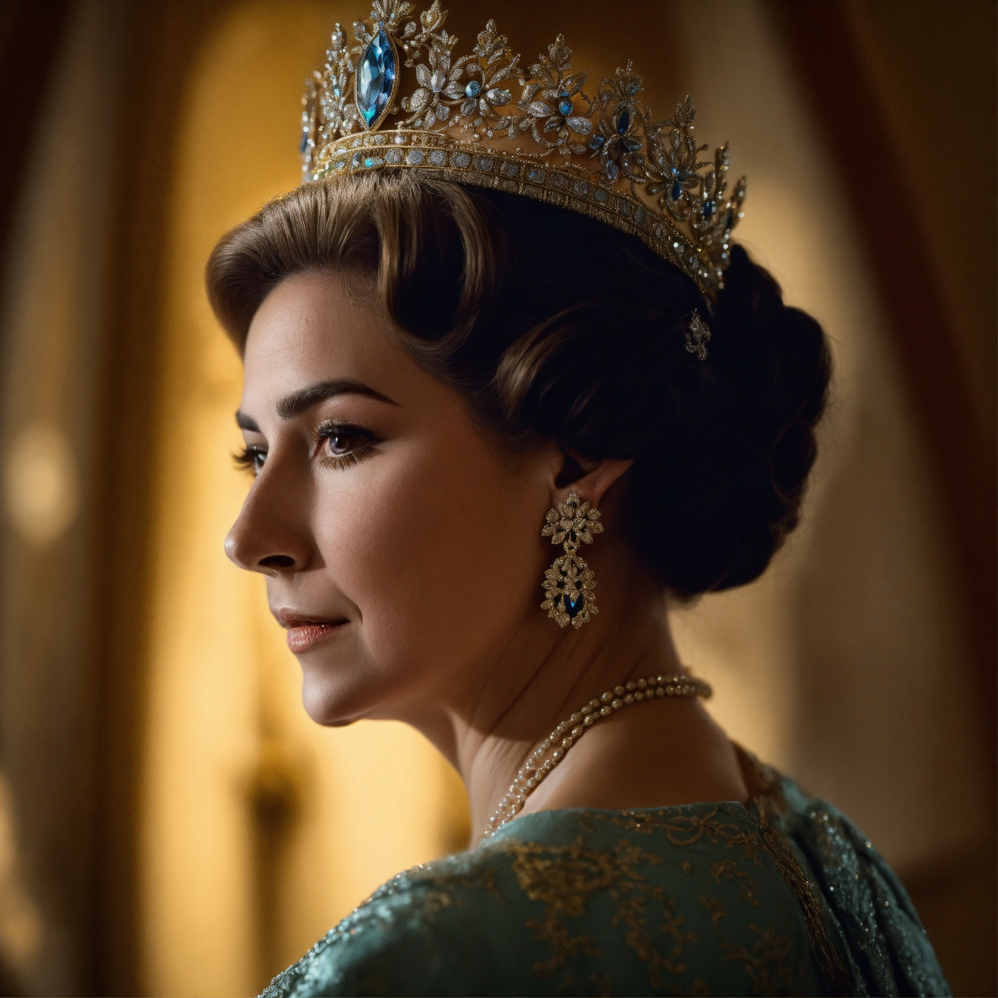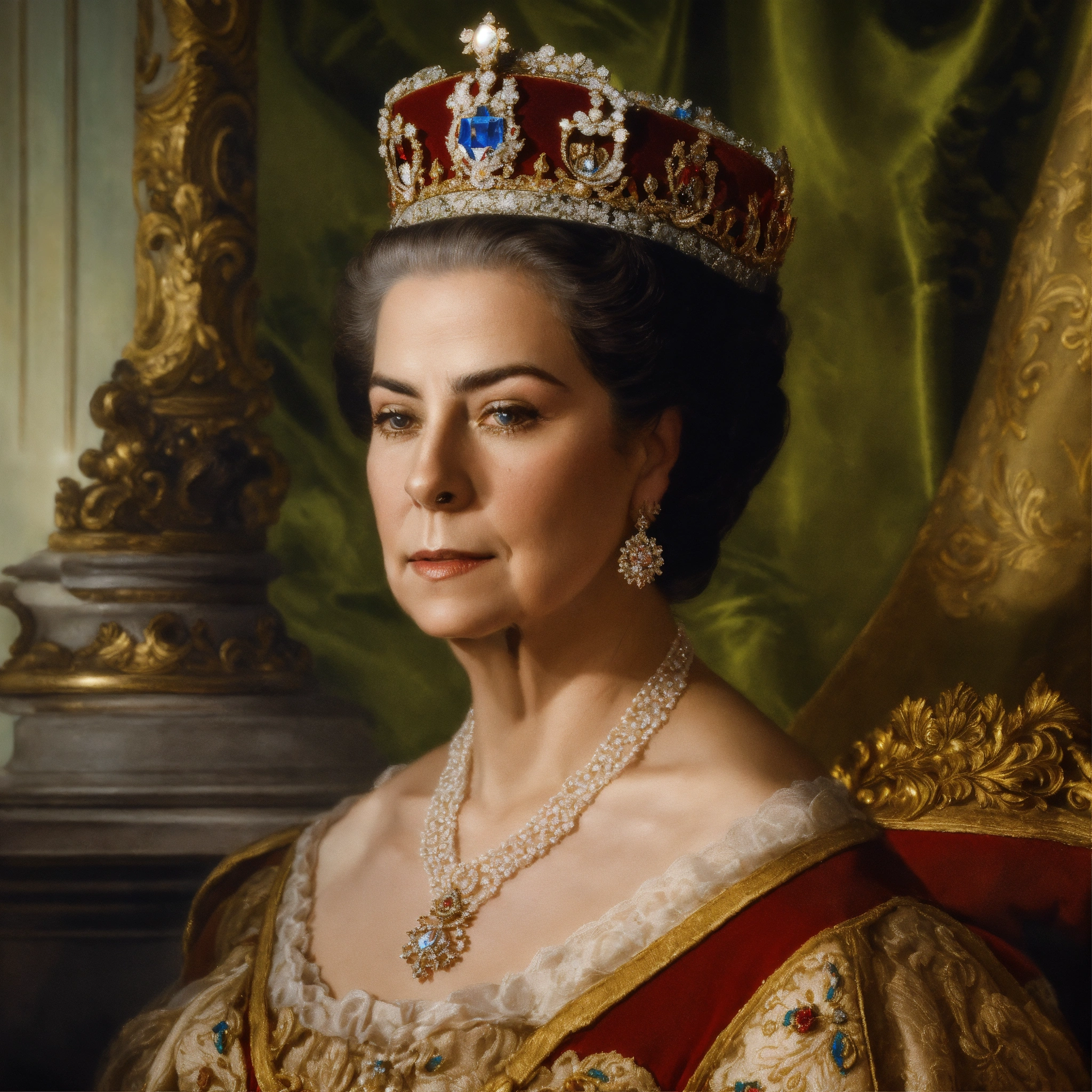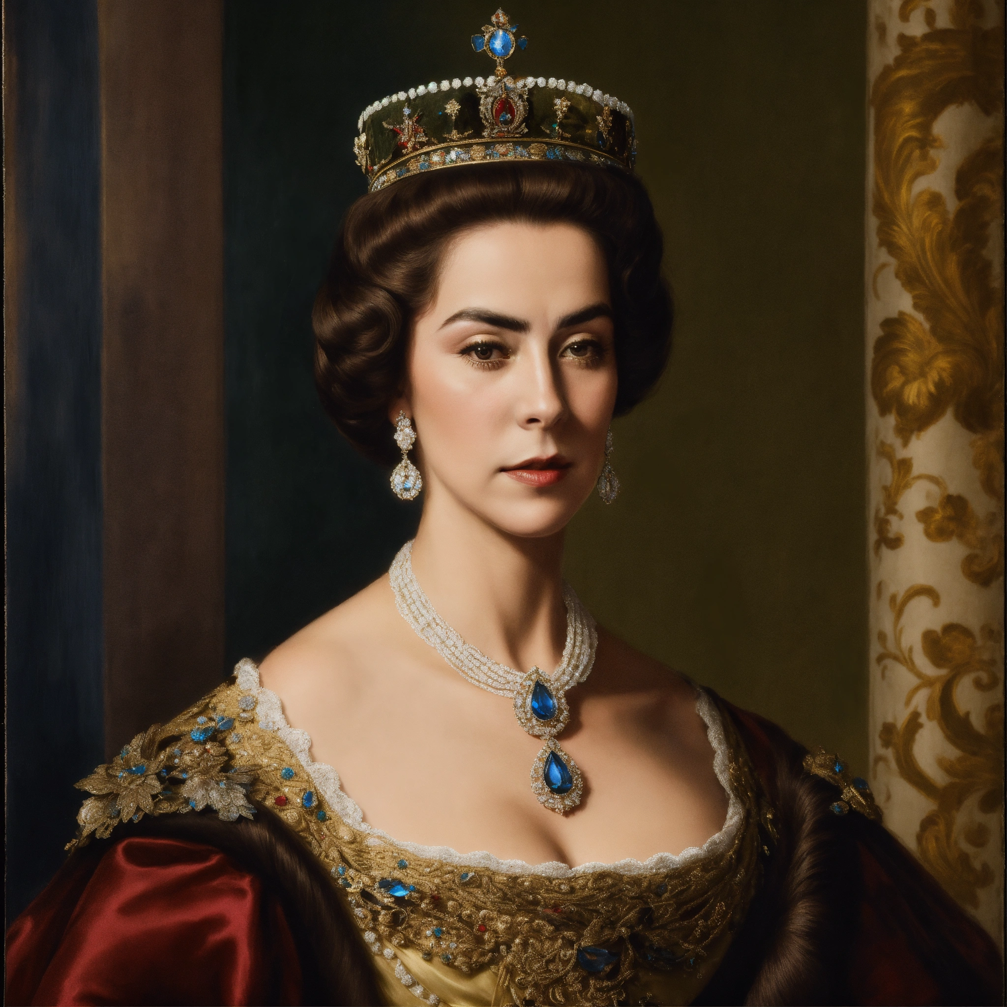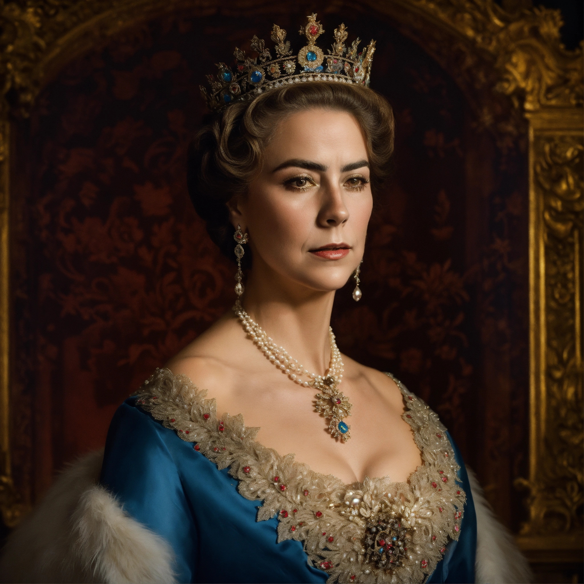 Cara hiperreal de isabel ii de españa, seductora, con kilos de más en su cara, con poca luz lateral, fondo de imagen con sombras oscuras y poca luz