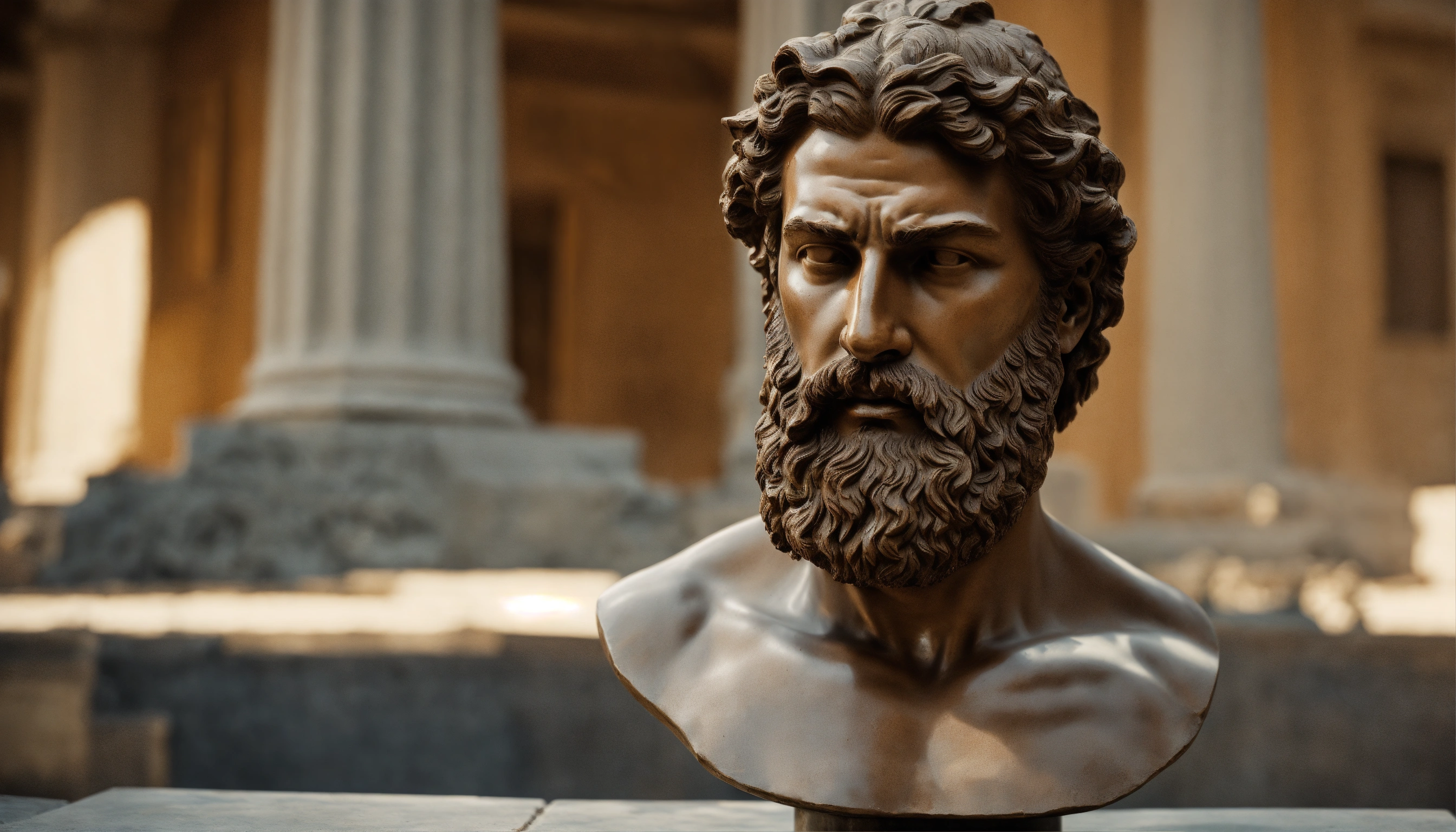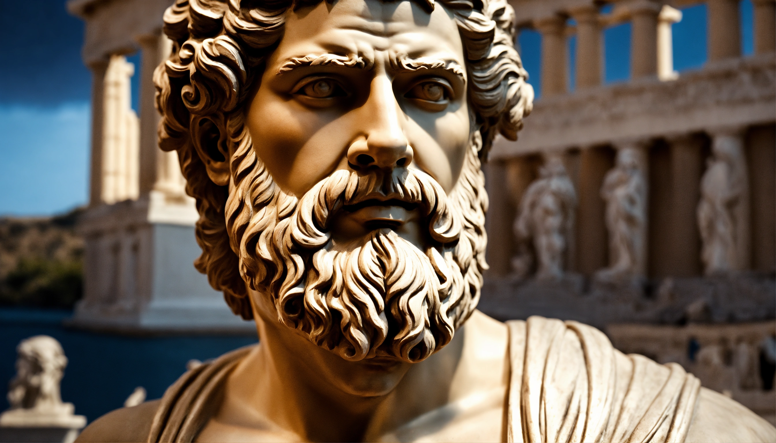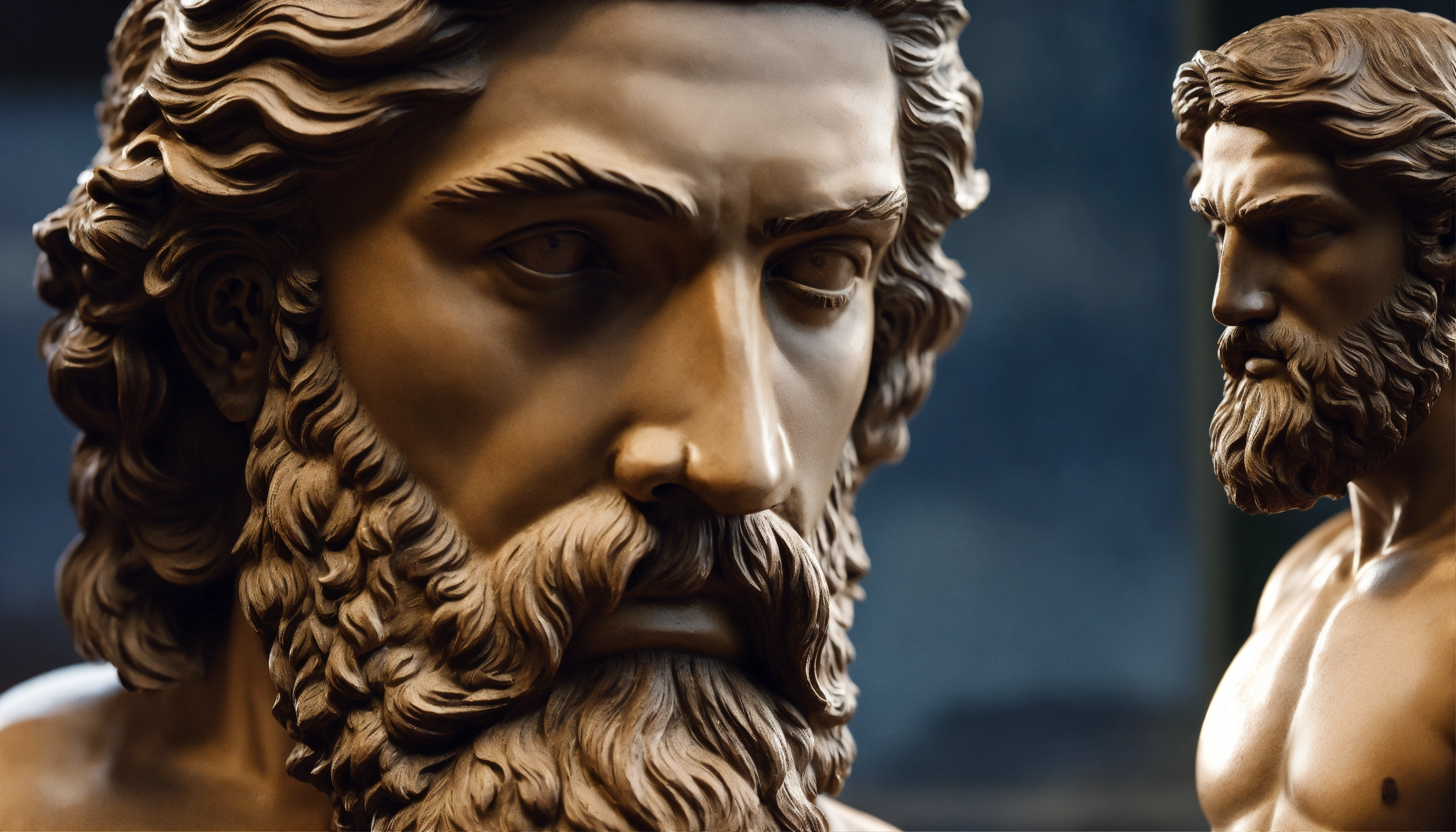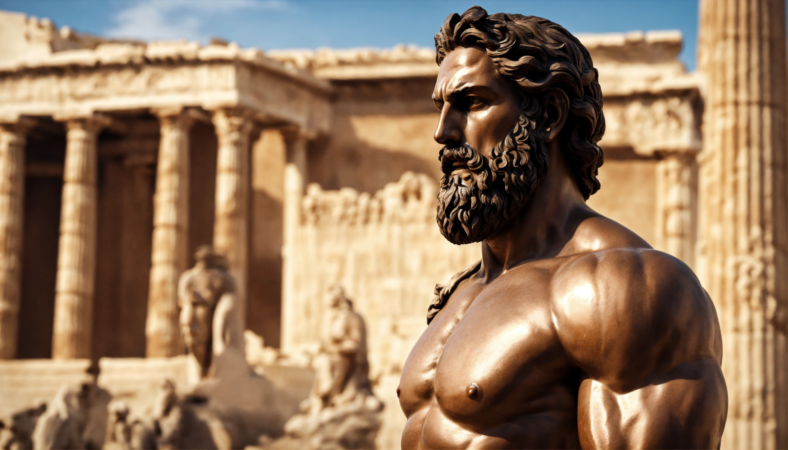 Greek man sculpture, bearded, muscular, perfect face, detailed, sad, controlling stress, ancient greece in the background, realistic, 169.8k