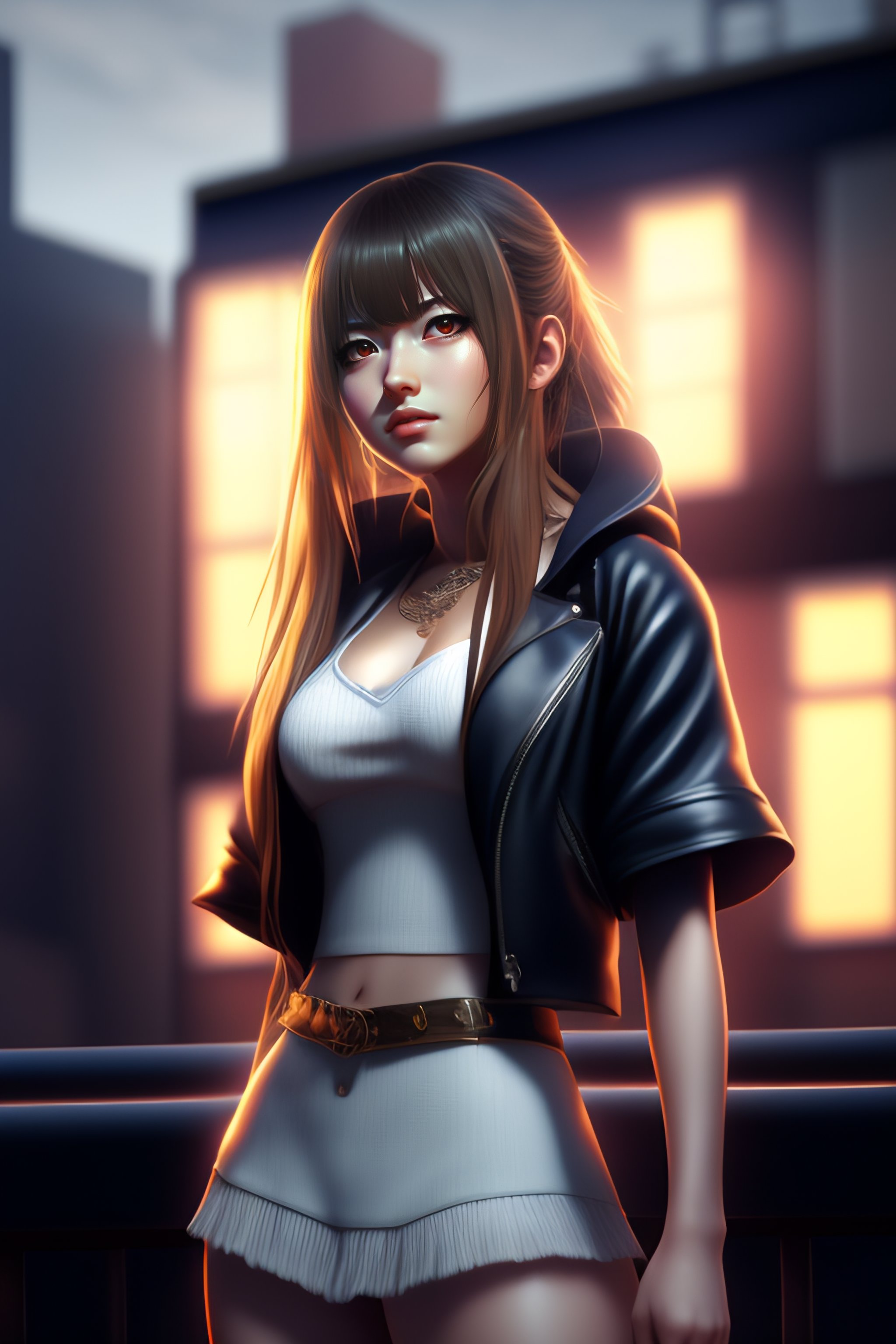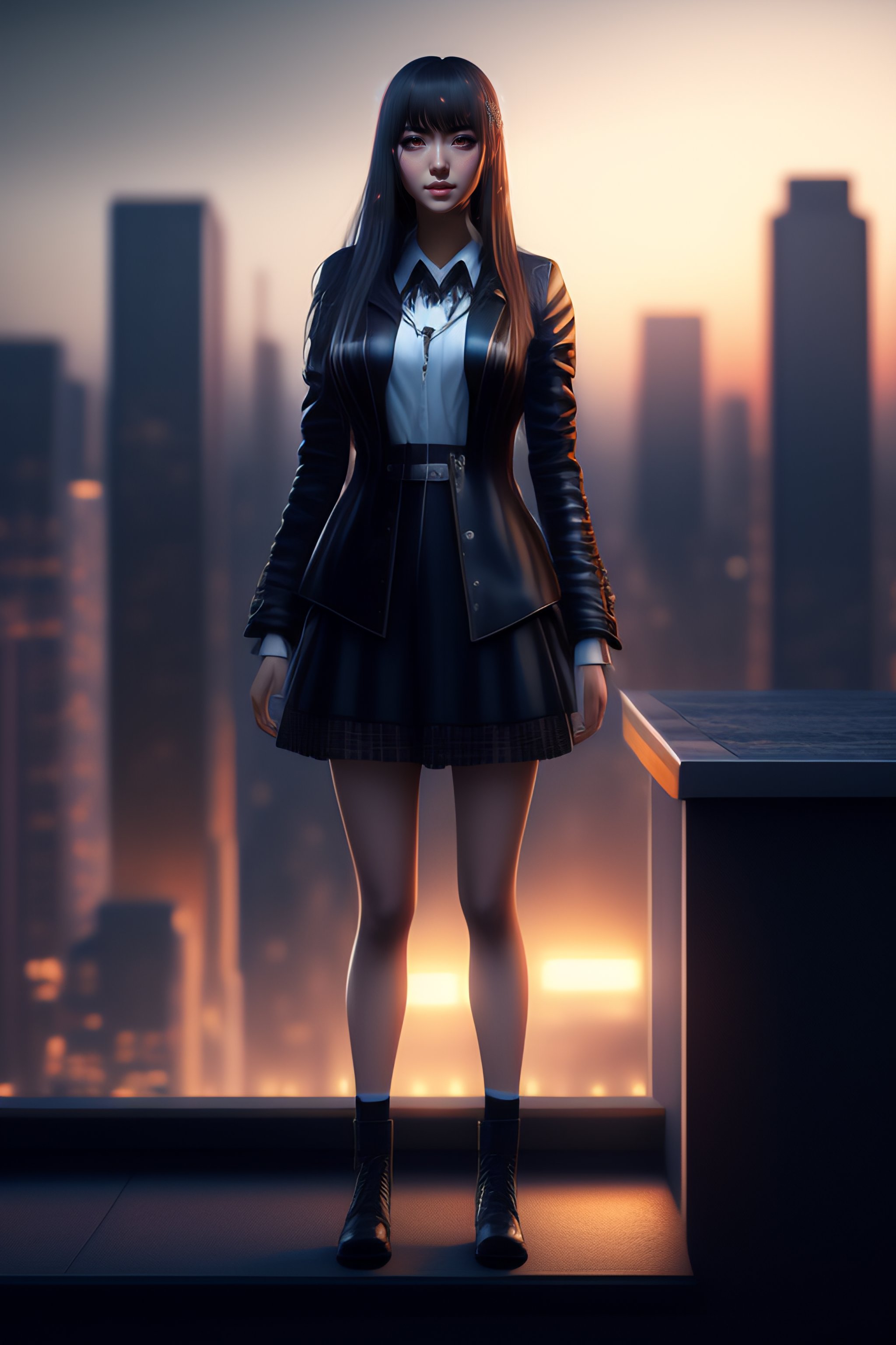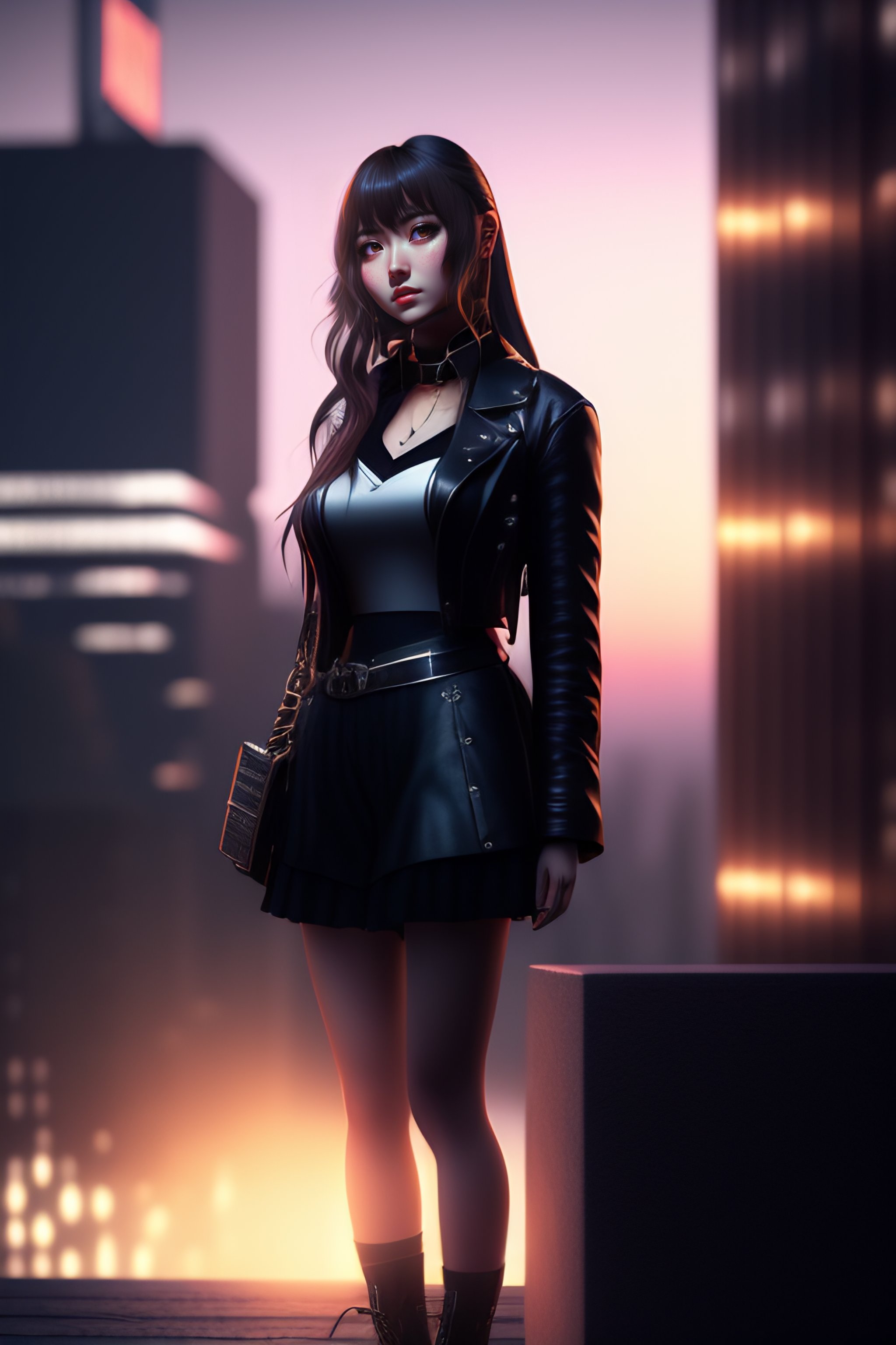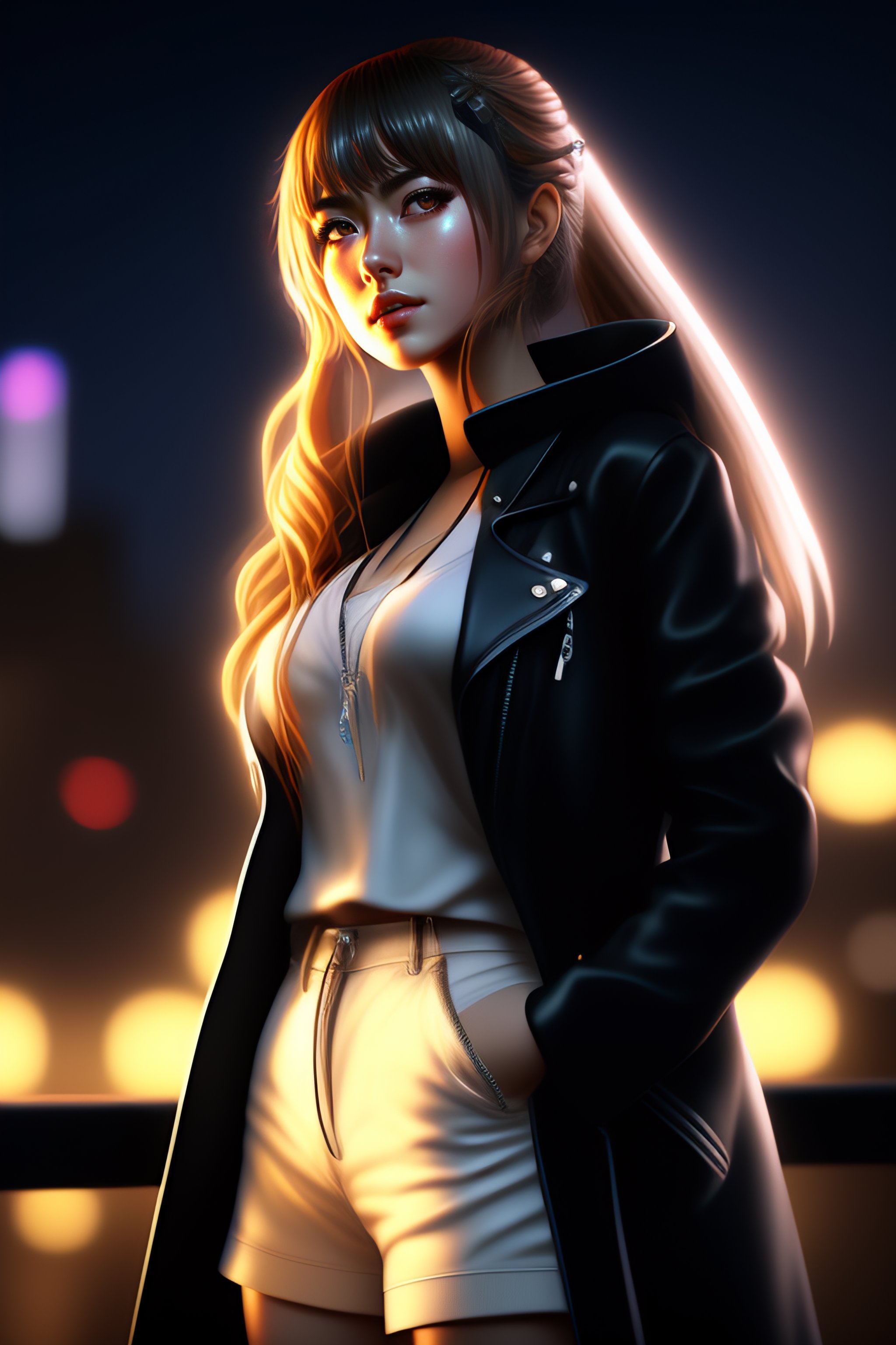 Highly detailed and realistic illustration of misa amane from death note, standing on a rooftop at night, with a cool and mysterious atmosphere, (3d rendering, concept art, digital painting), by daisuke saito