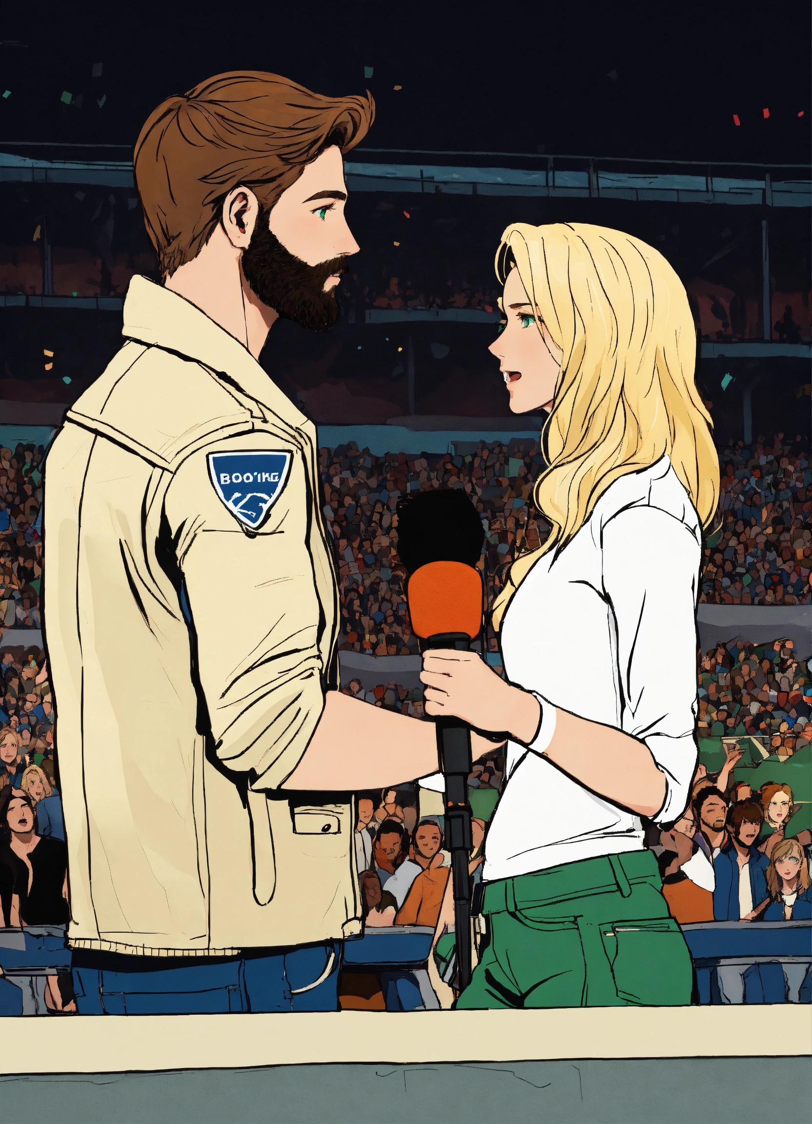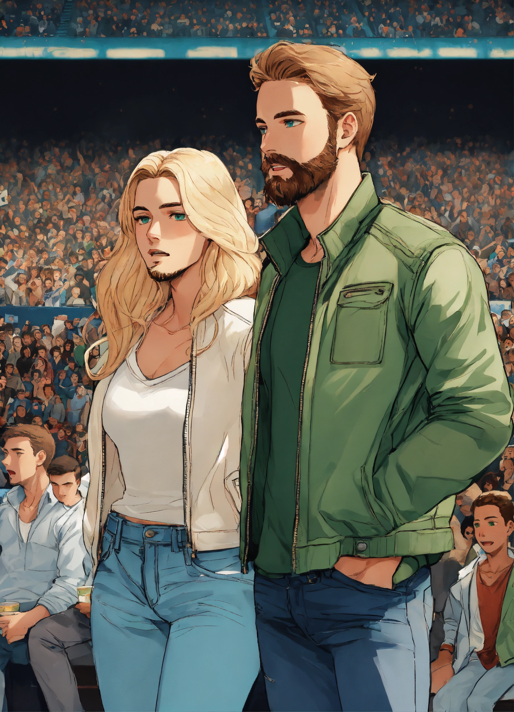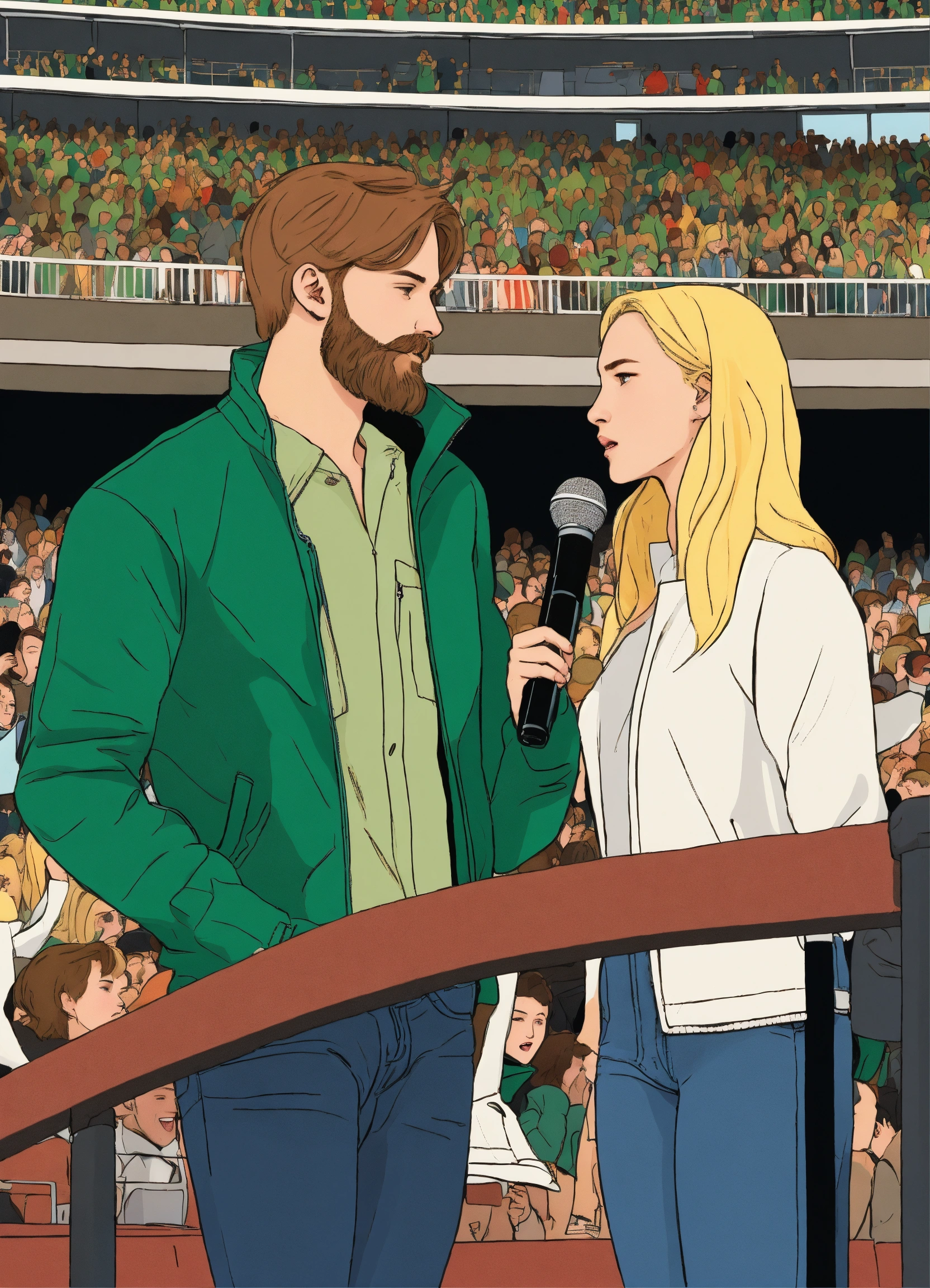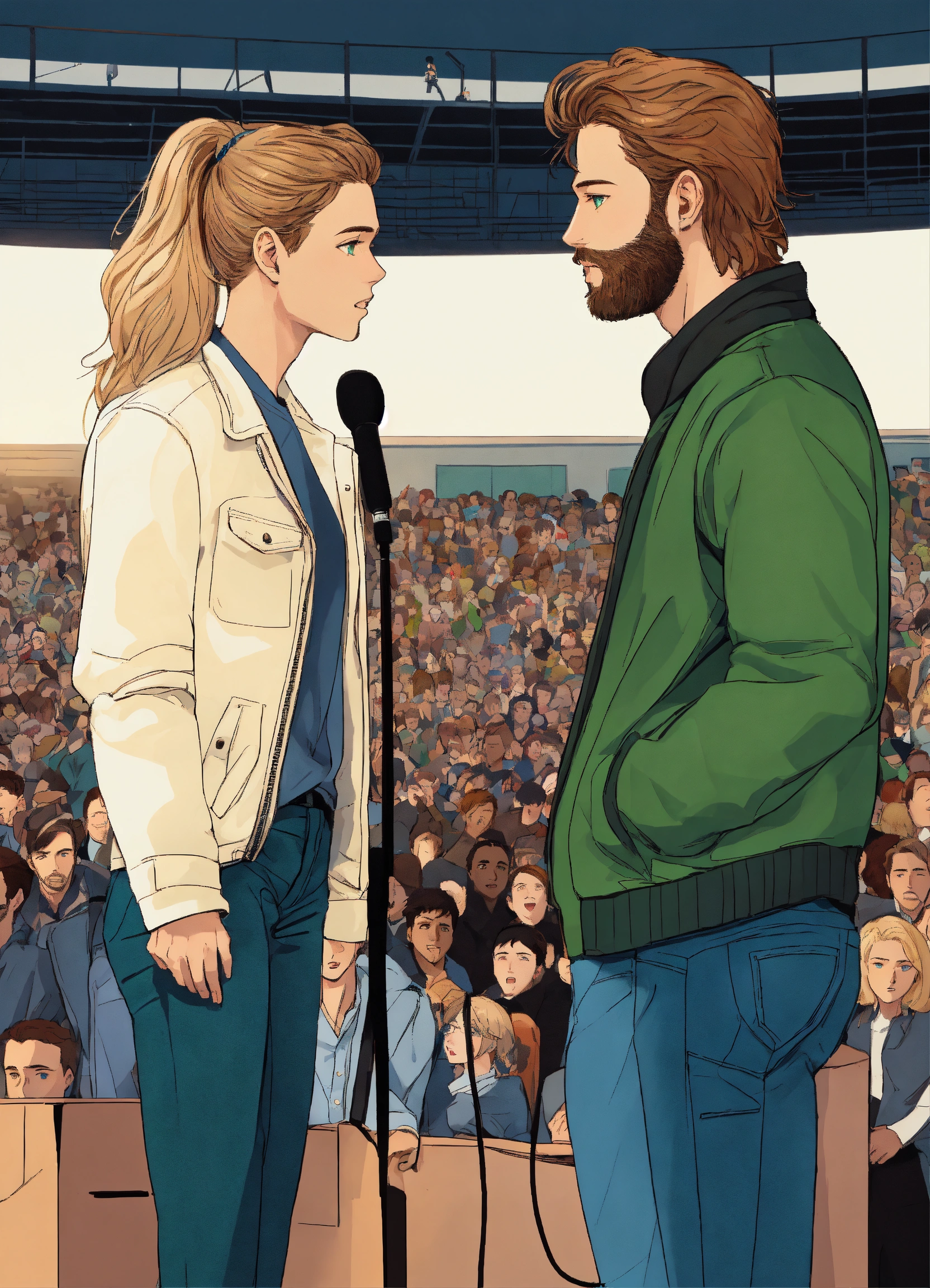 In this particular illustration style, a young man with brown hair, a light thin brown beard, and green eyes with white jacket and jeans and a white woman with blonde hair, blue eyes, and a v-shaped face, no face hair with black jacket and jeans giving speech to crowd in stadium