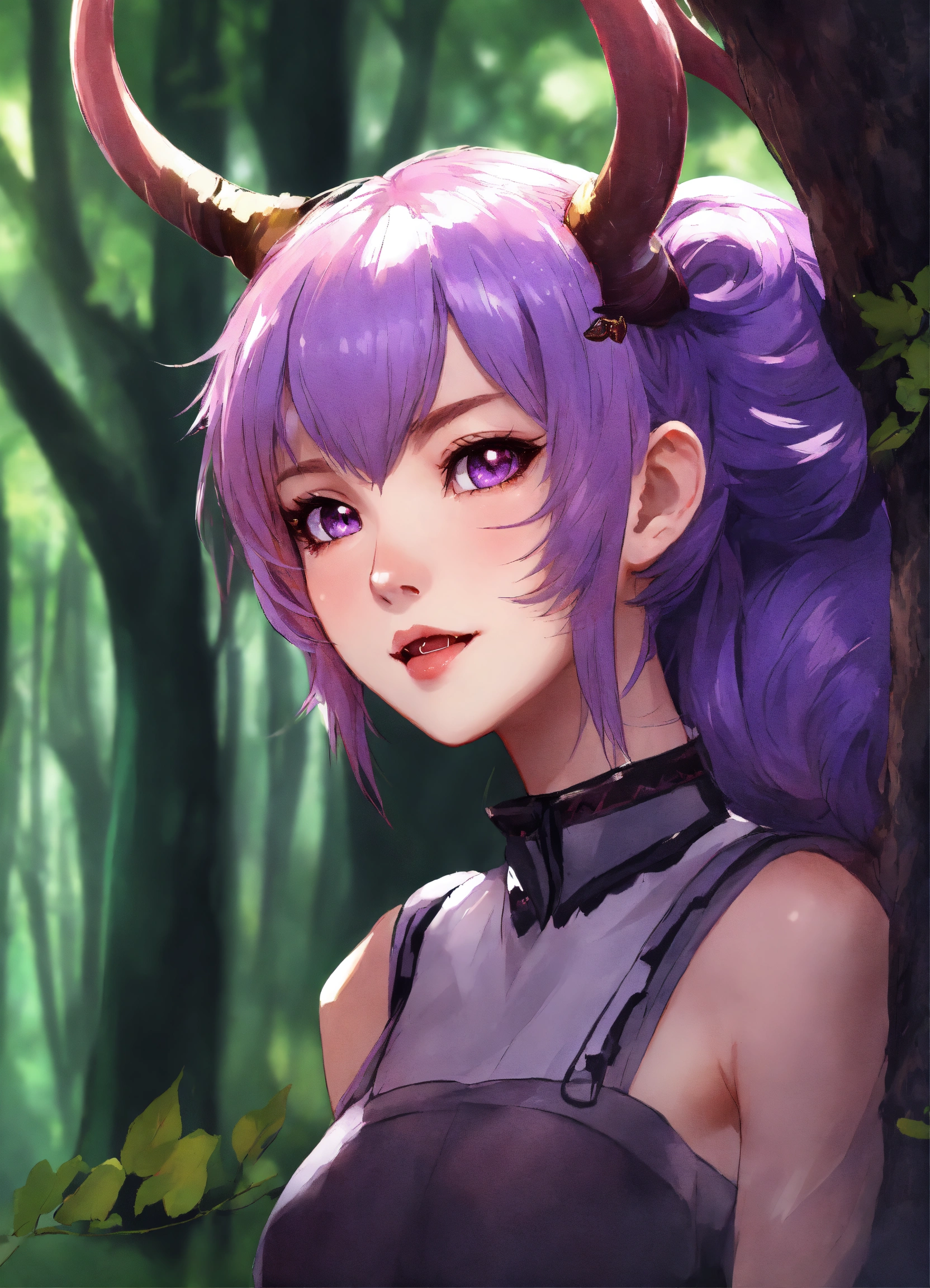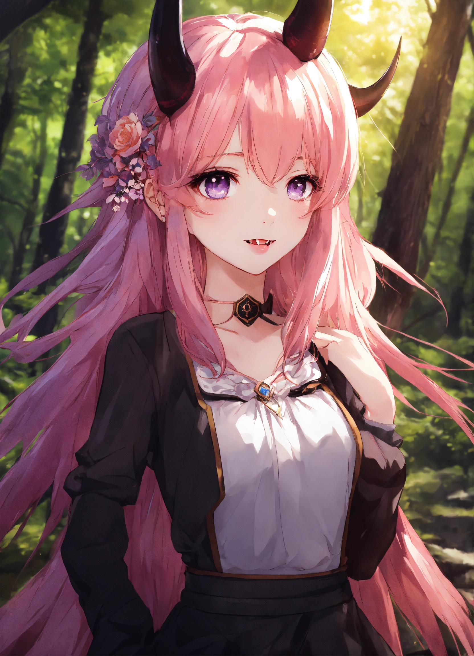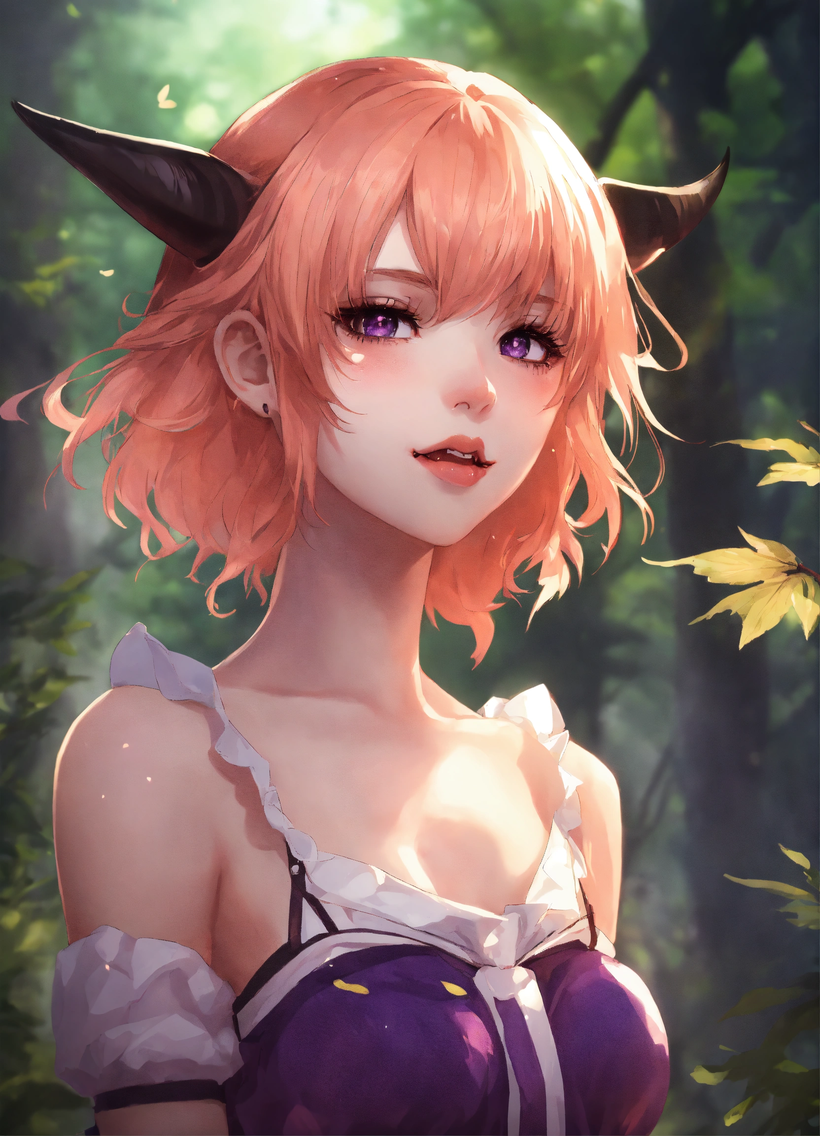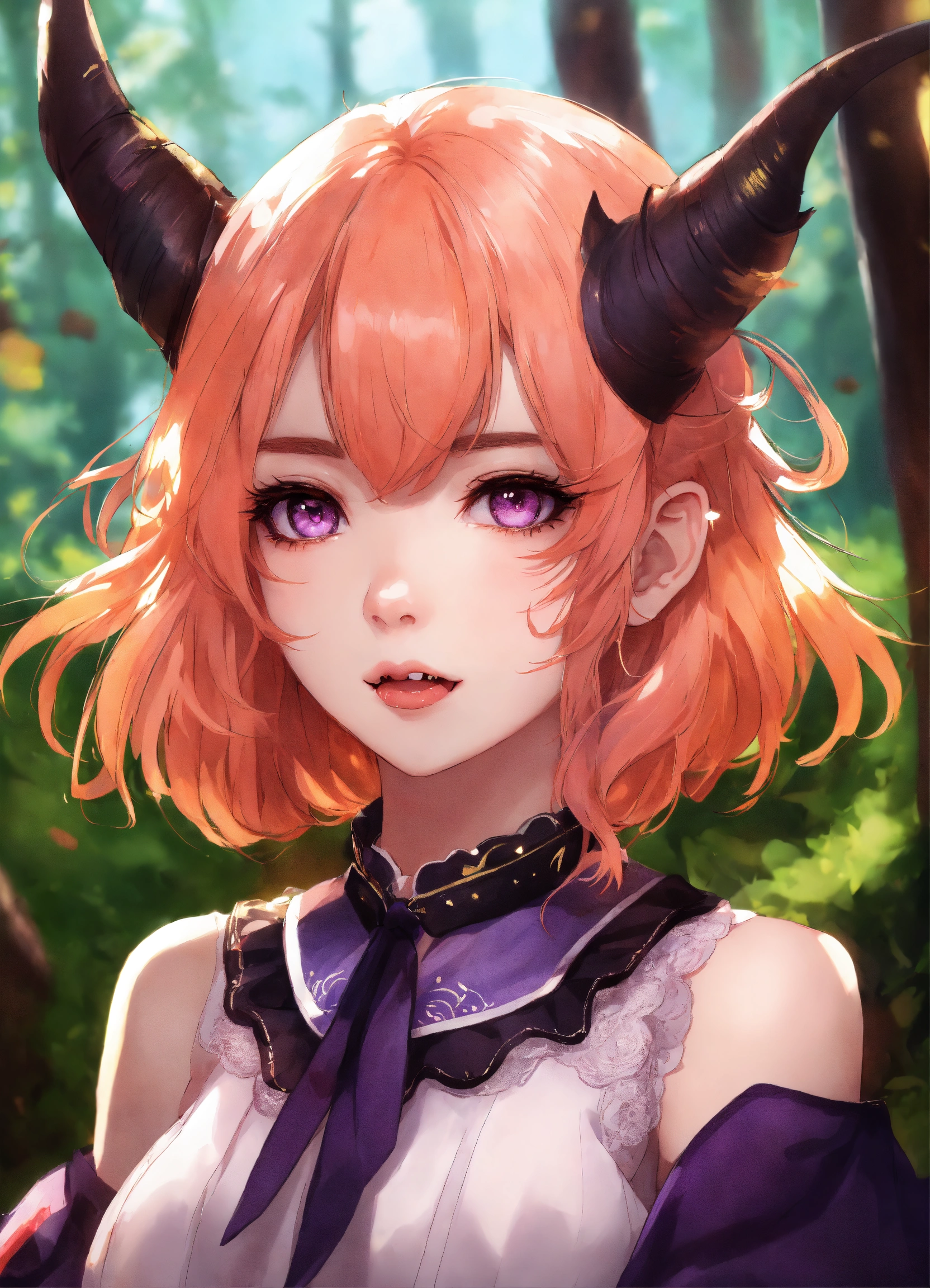 Cute petite anime girl, peach hair, purple eyes, lip fangs, black head horn, forest background, girm fantasy