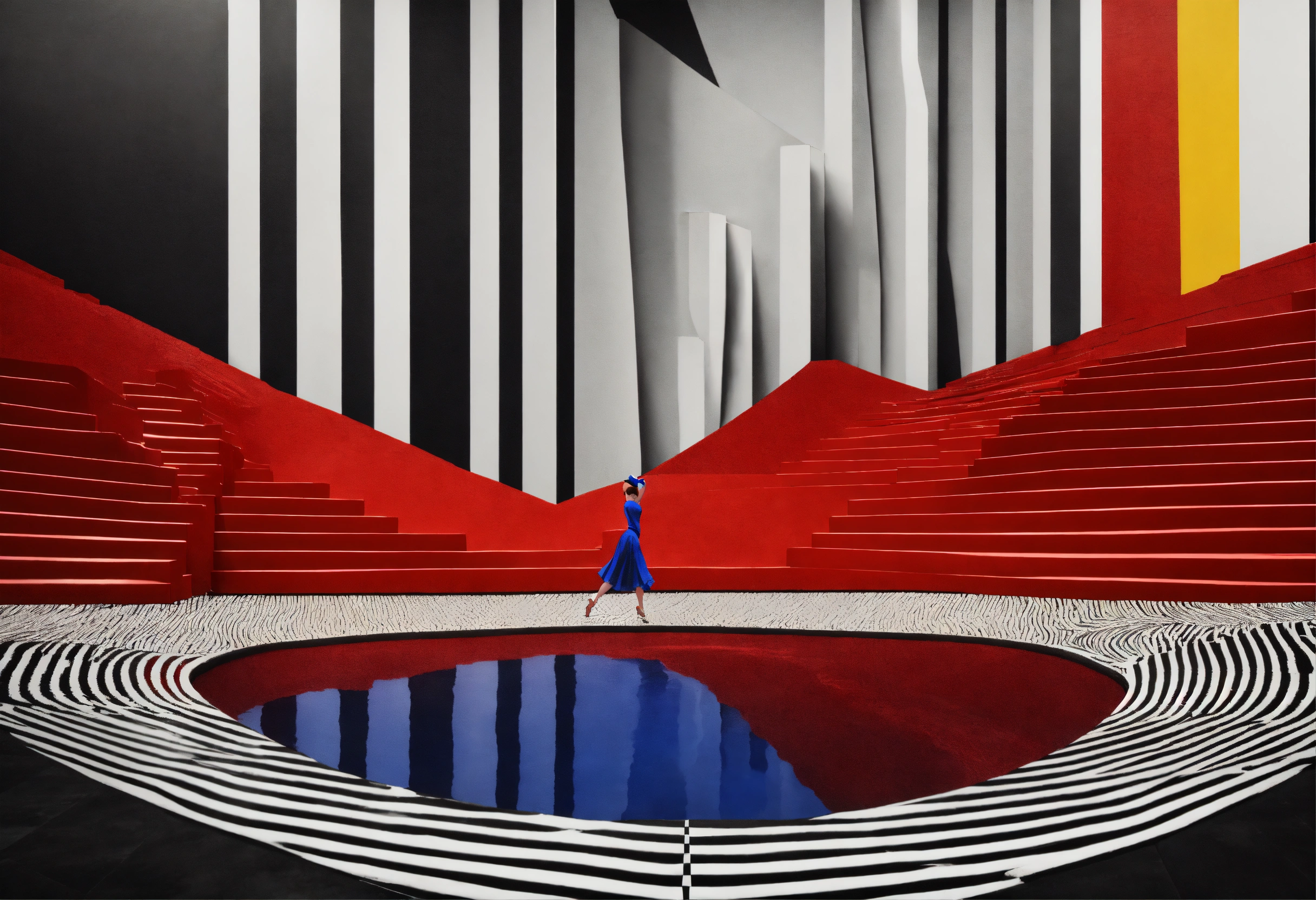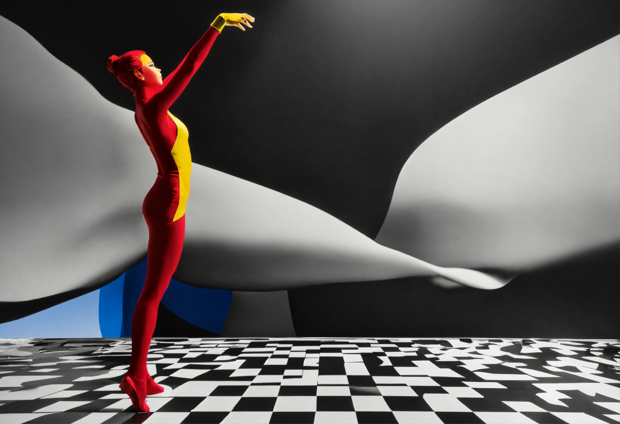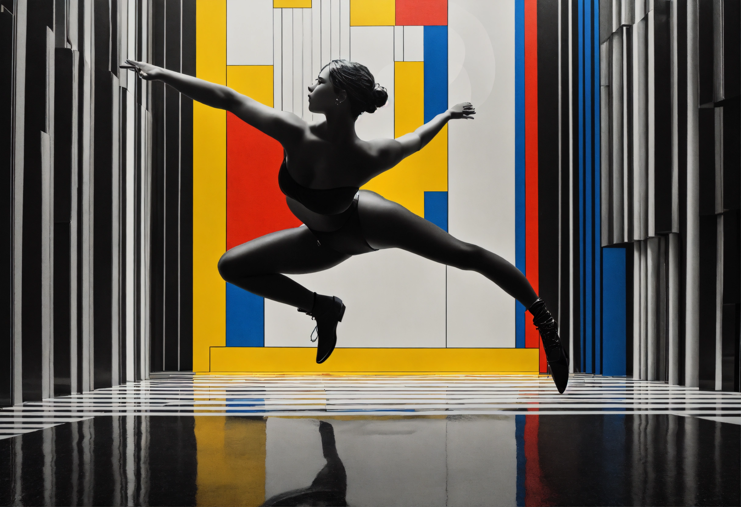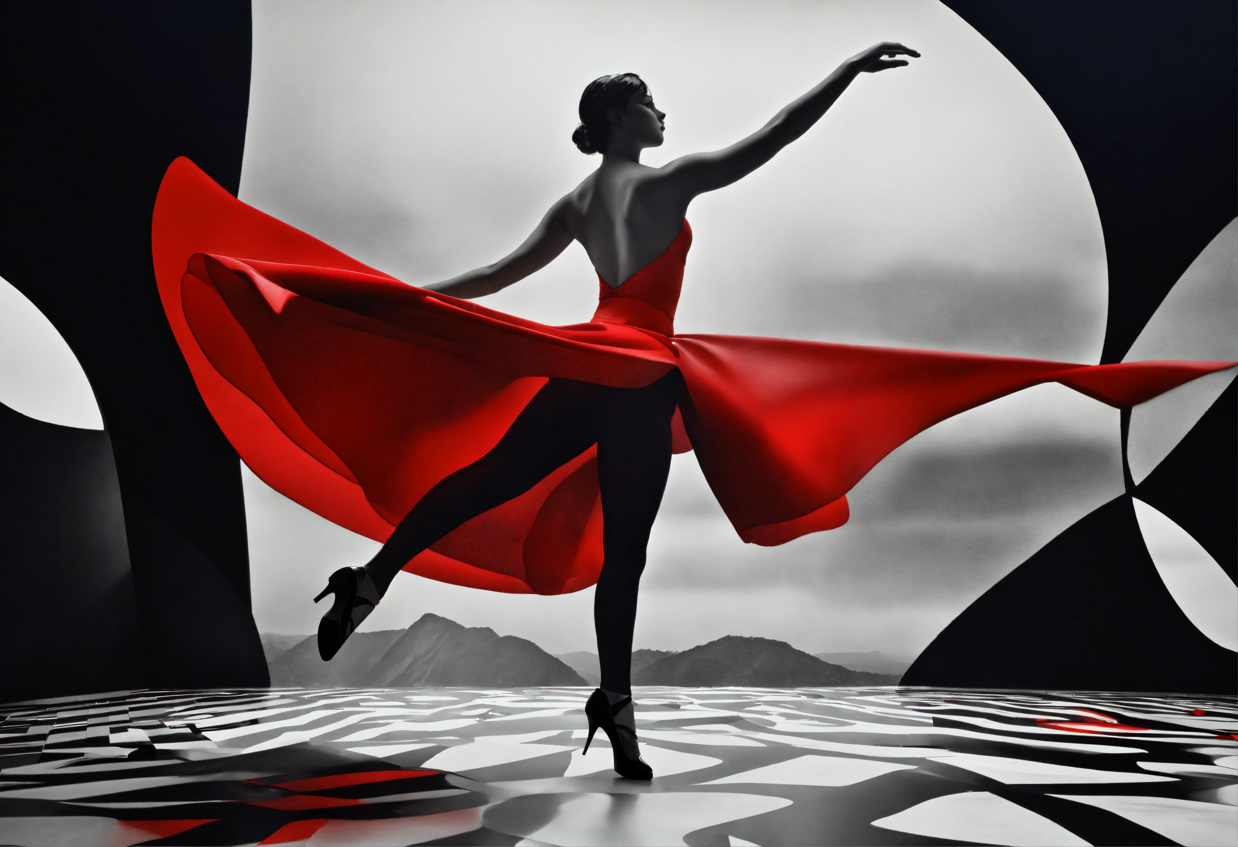 Black and white, primary colors, 3d abstract landscape, close up photograph of a classic dancer dancing, immersive-inspired art deco, inside and out landscape, rene magritte inspiration.